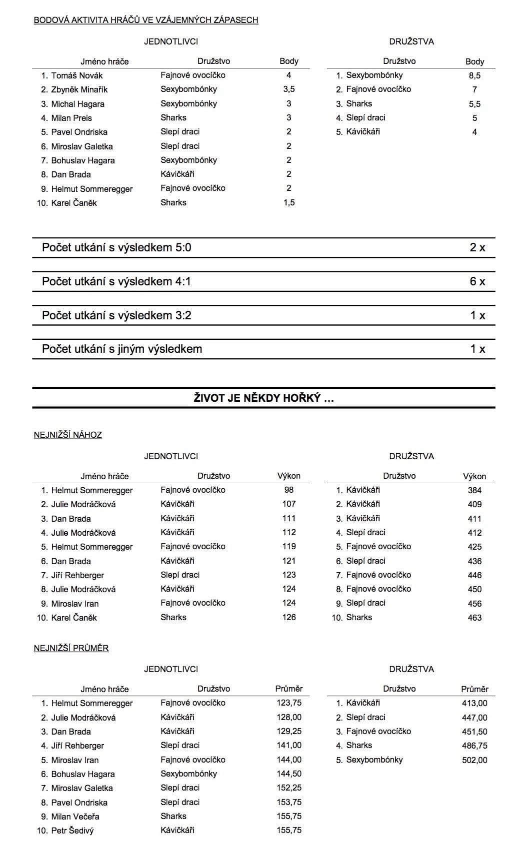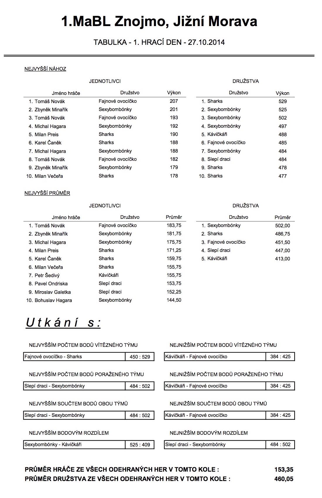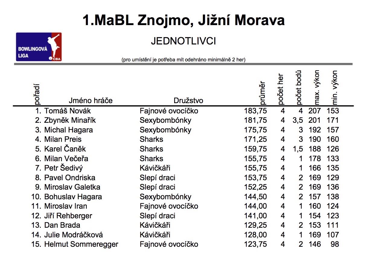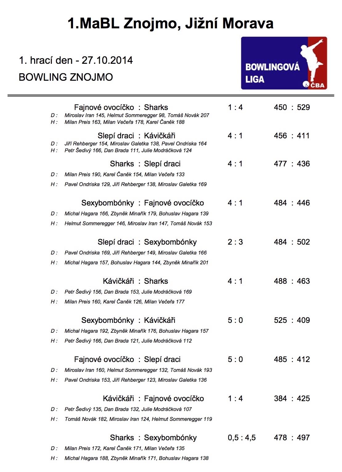 27.10.2014 odehrála družstva 1.ligy první kolo a zahájila tak podzimní část 1. Městské amatérské bowlingové ligy 2014/2015. Výsledky tohoto kola naleznete níže.