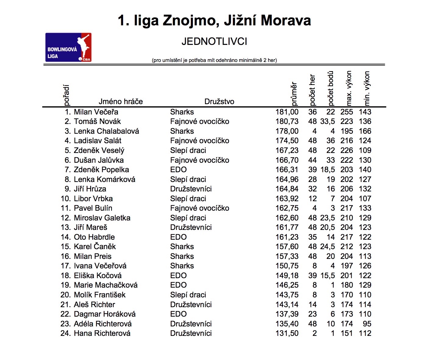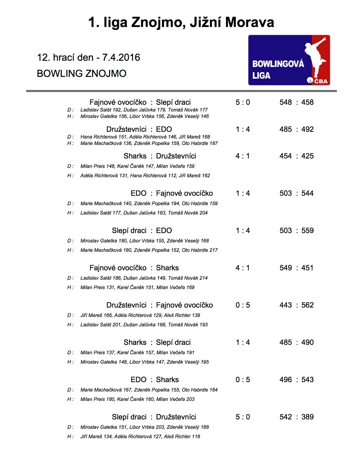 Ve čtvrtek 7.4.2016 odehrála i družstva 1. Městské amatérské bowlingové ligy poslední, dvanácté kolo ročníku 2015/2016. Výsledky naleznete jako vždy v článku. Tímto Vás zveme na oficiální vyhlášení výsledků celého ročníku, které se bude konat ve čtvrtek 21.4.2016 od 18:00.