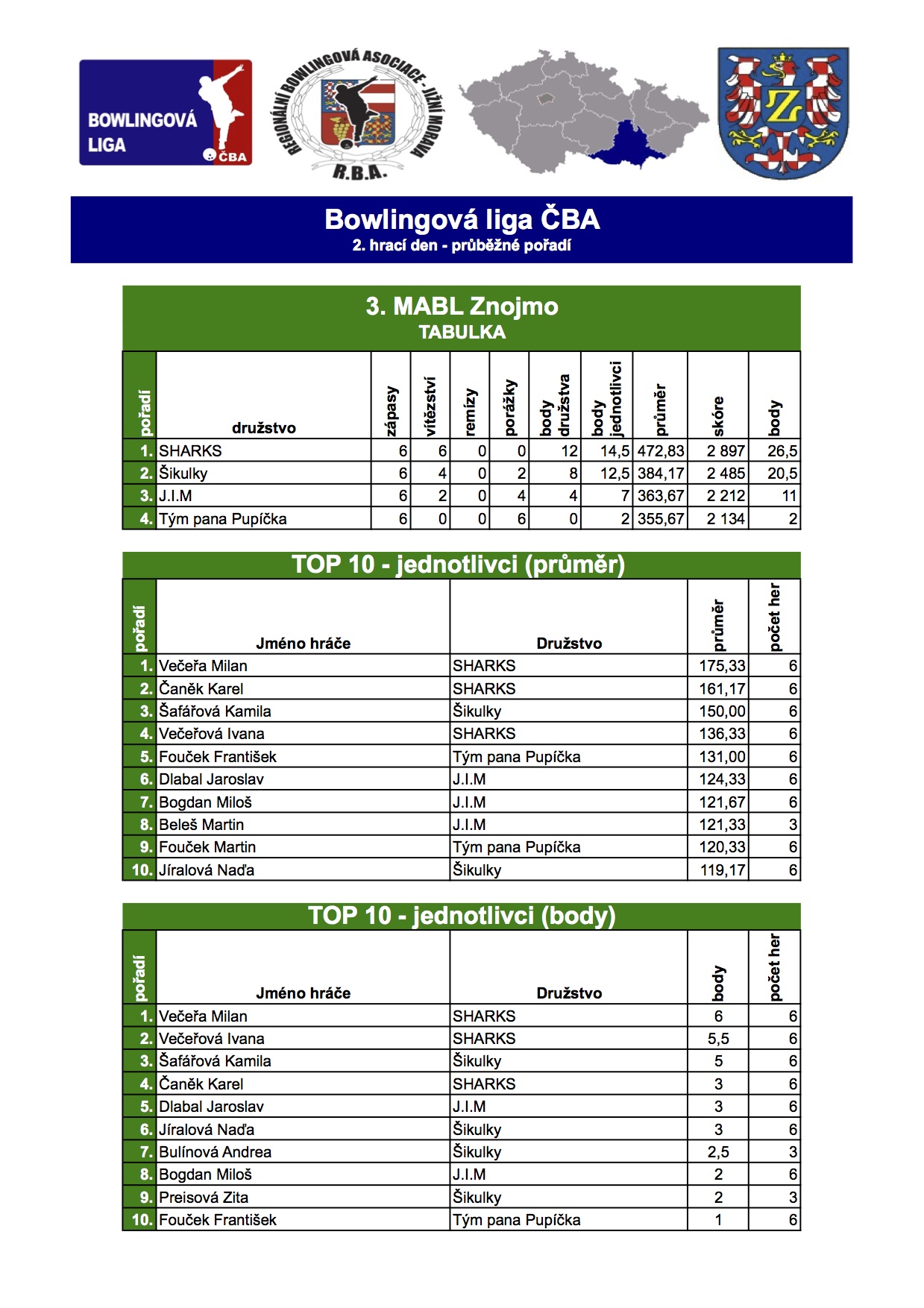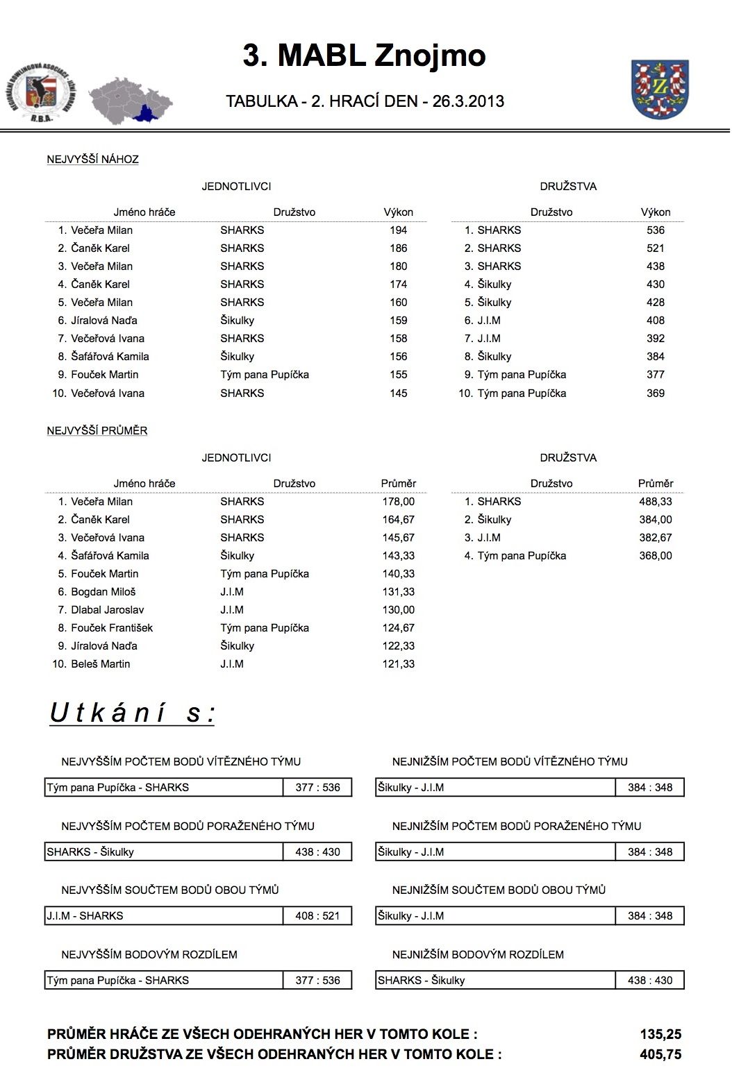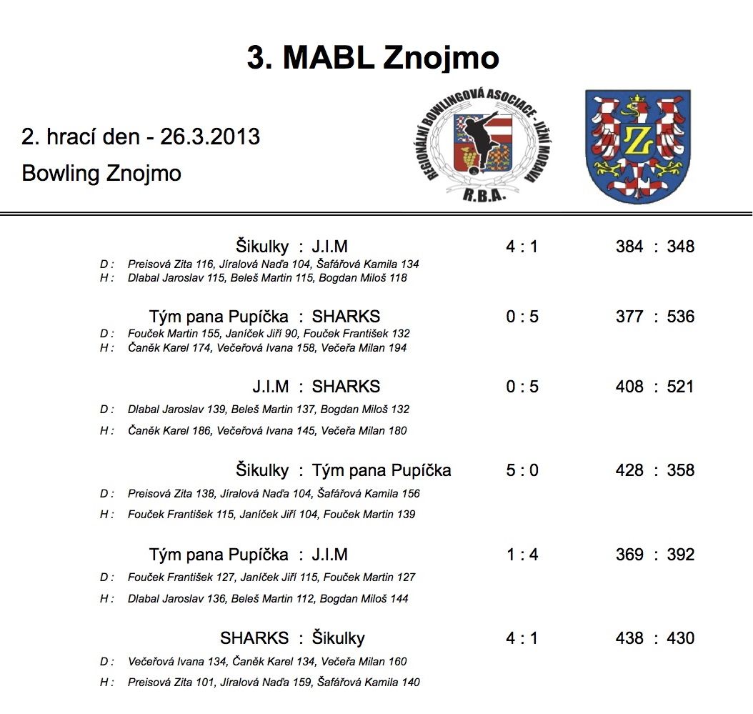 V úterý 26.3.2013 jsme odehráli druhé kolo 1.MABL. Družstva se sbírají a začínají podávat skutečně zajímavé výsledky a často překvapí. :)