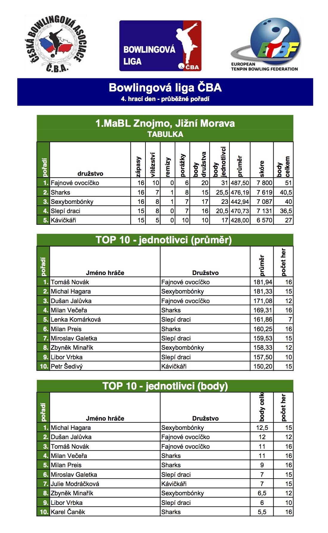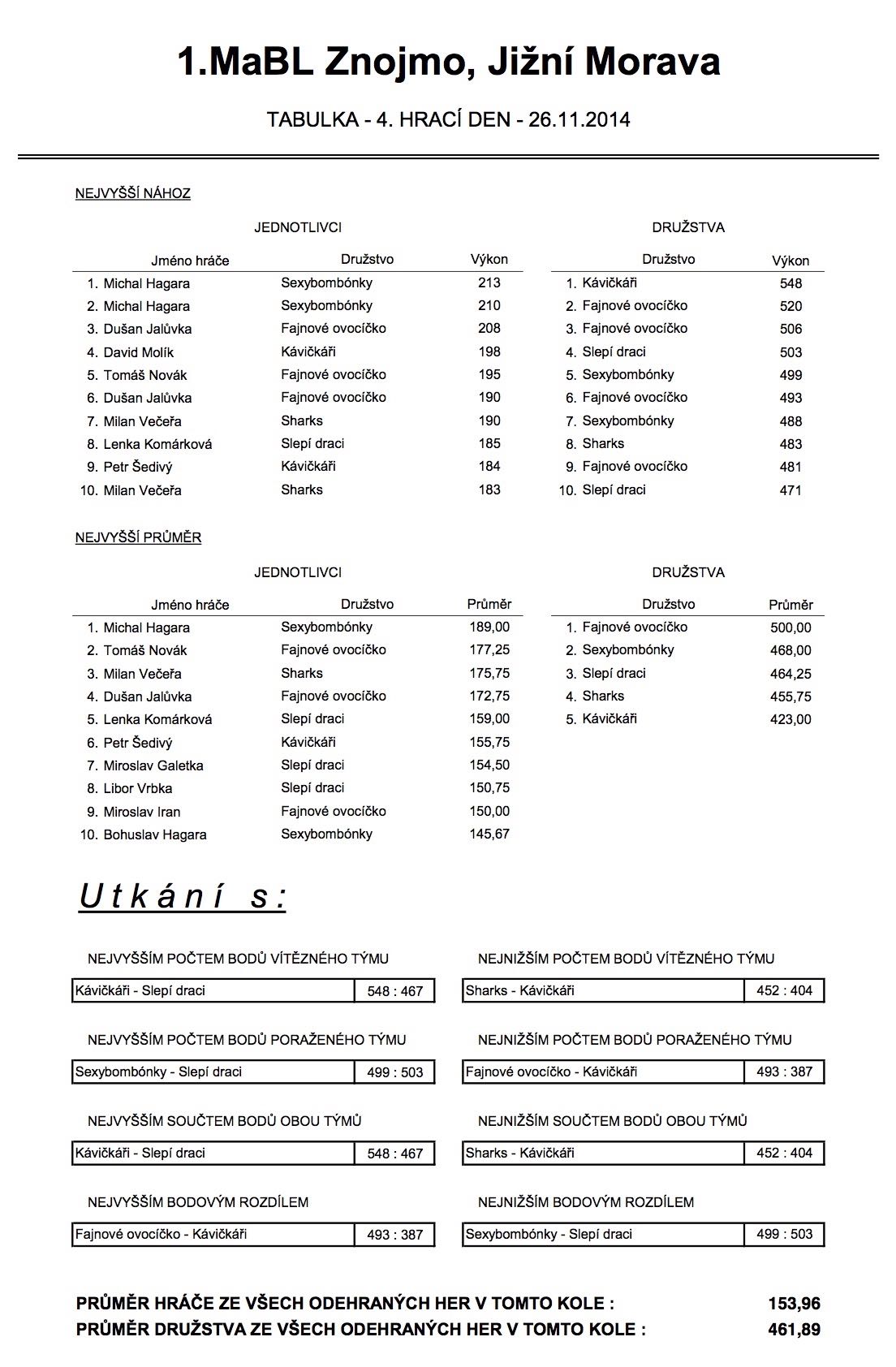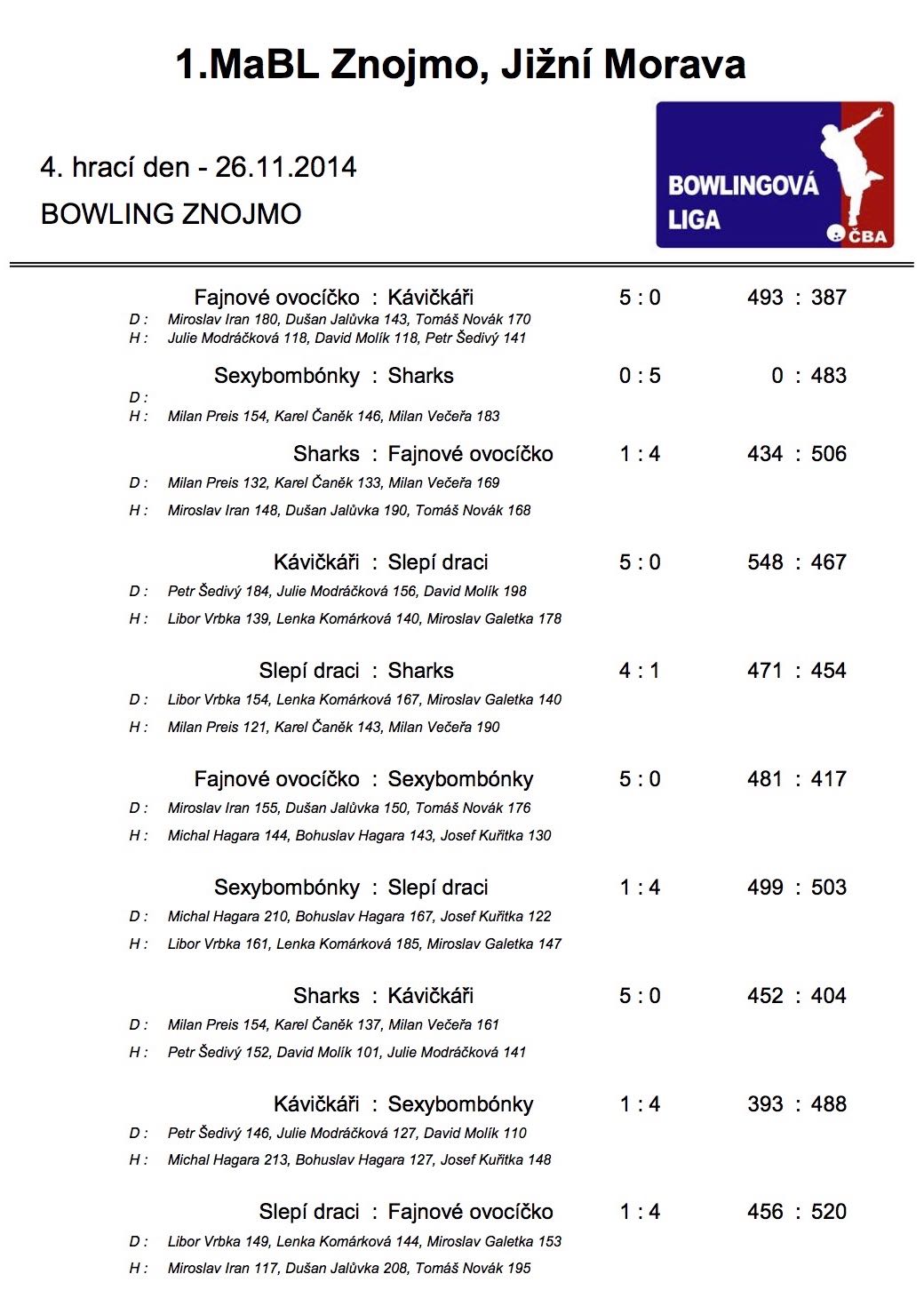 Ve středu 26.11.2014 se odehrálo čtvrté kolo 1. Městské amatérské bowlingové ligy.