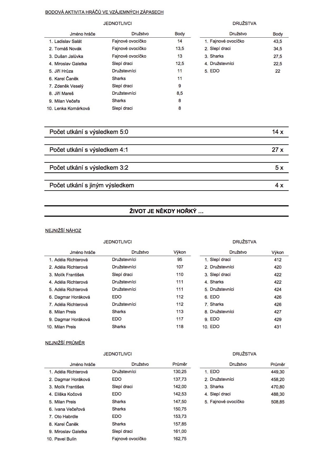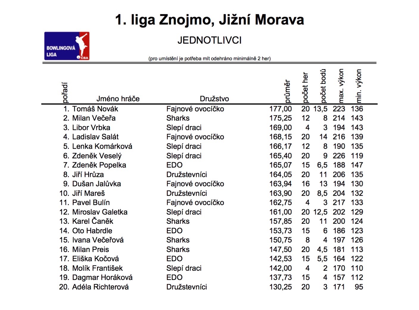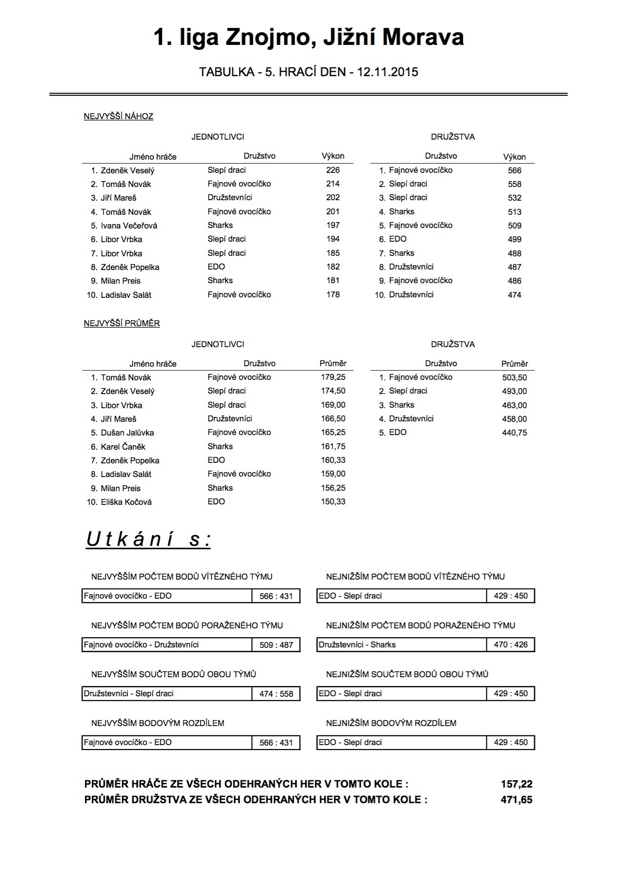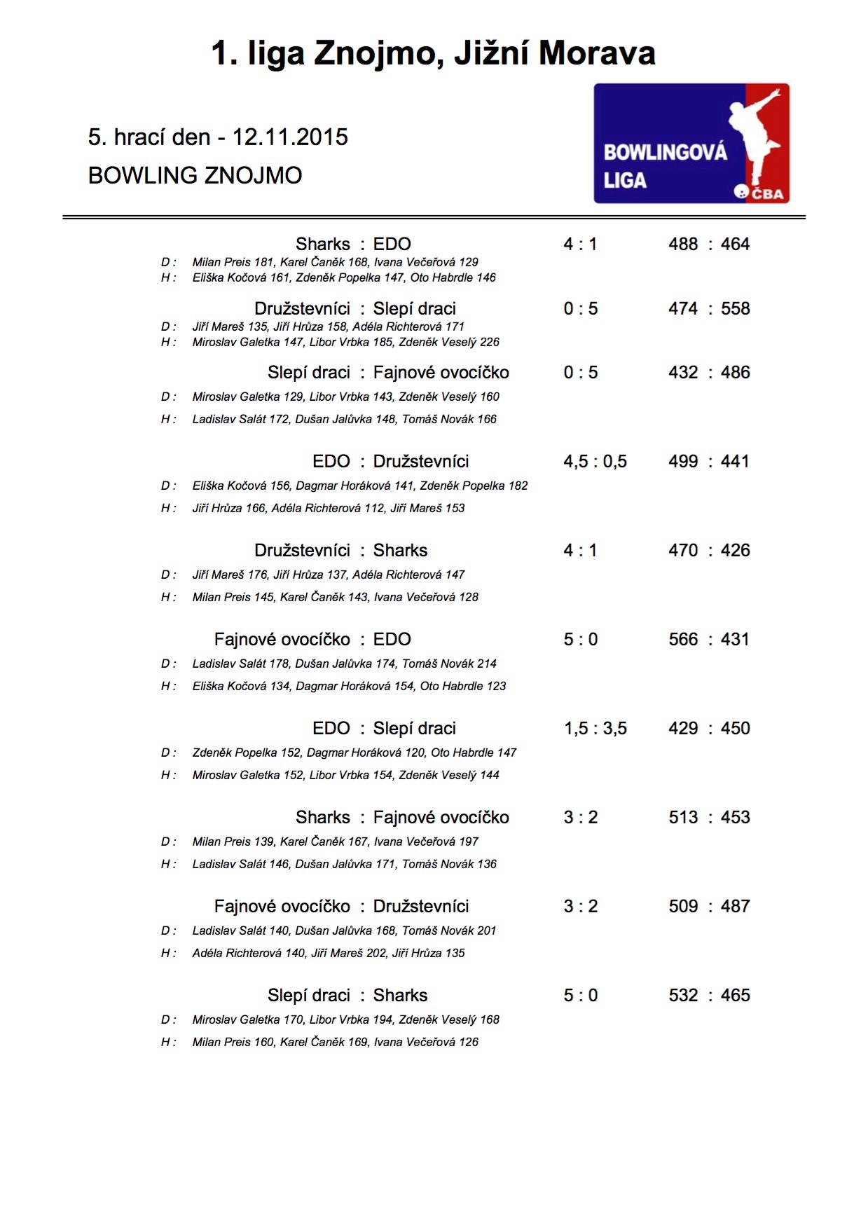 Ve čtvrtek 12.11.2015 odehrála družstva první ligy již 5. kolo podzimní části. Výsledky naleznete dále v článku.