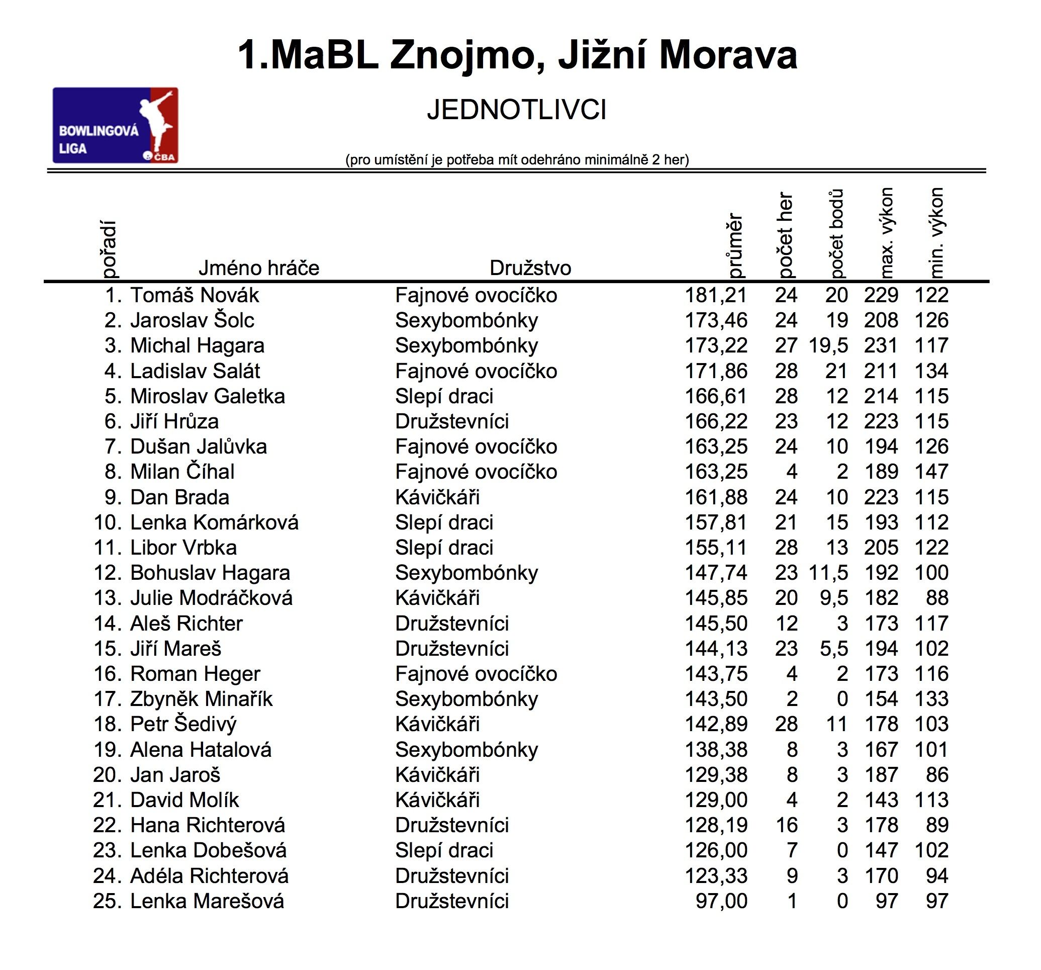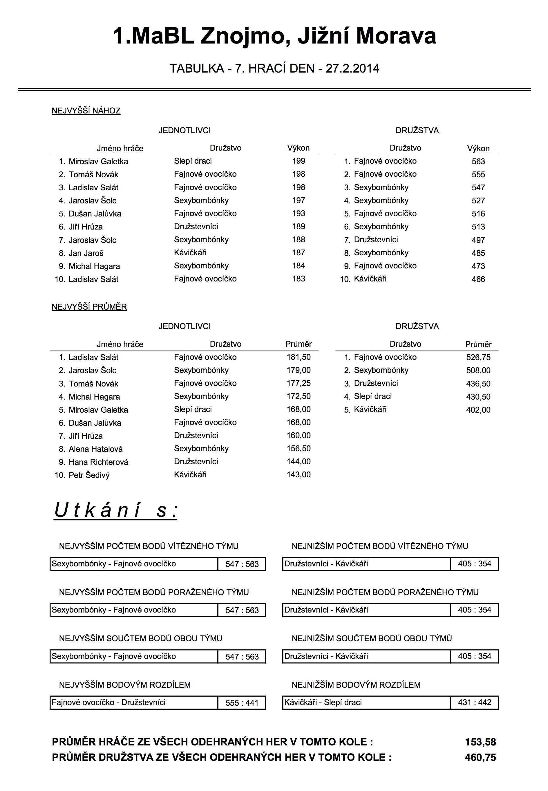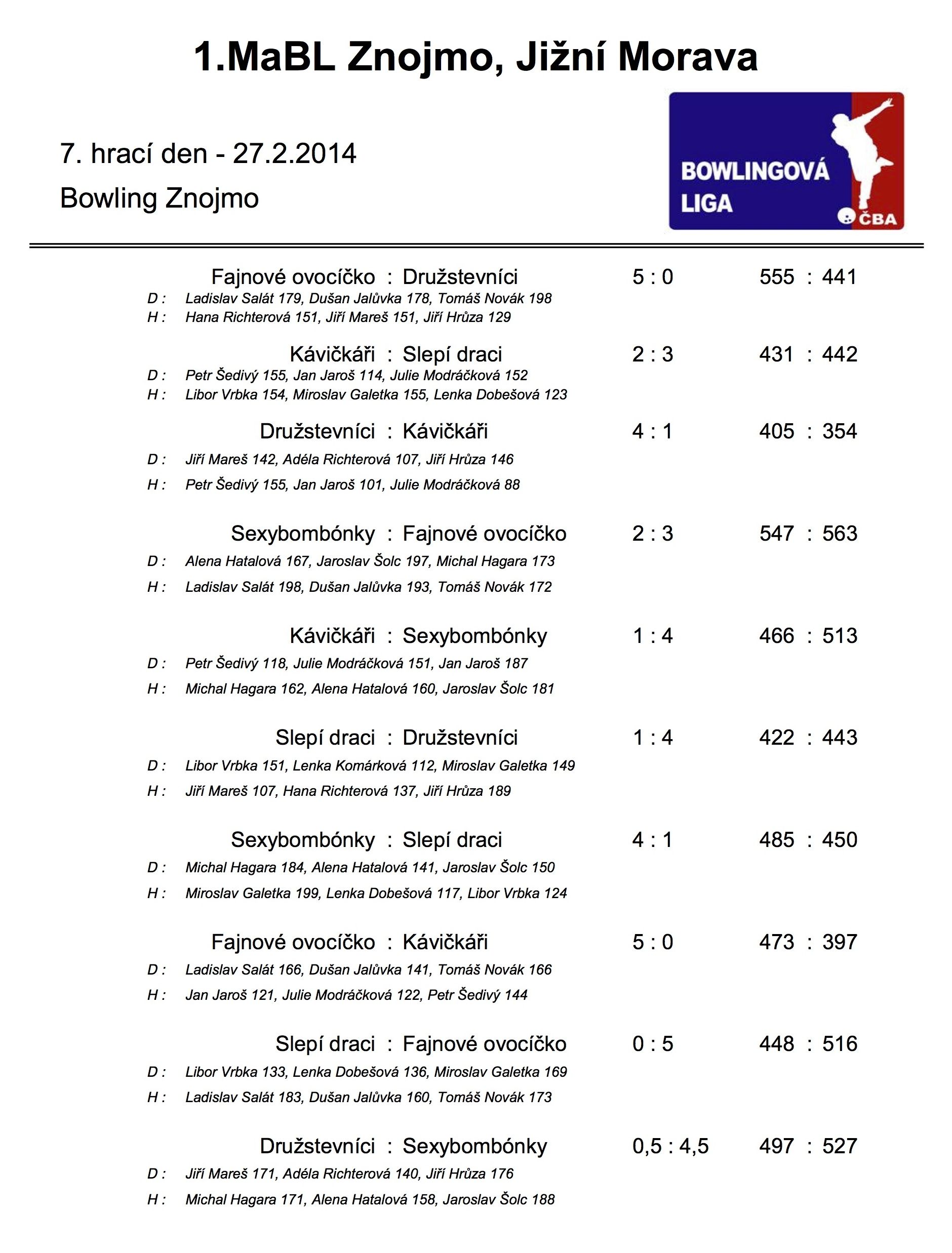 Ve čtvrtek 27.2.2014 proběhlo 7. kolo 1. Městské amatérské bowlingové ligy 2013/2014. Výsledky naleznete zde: