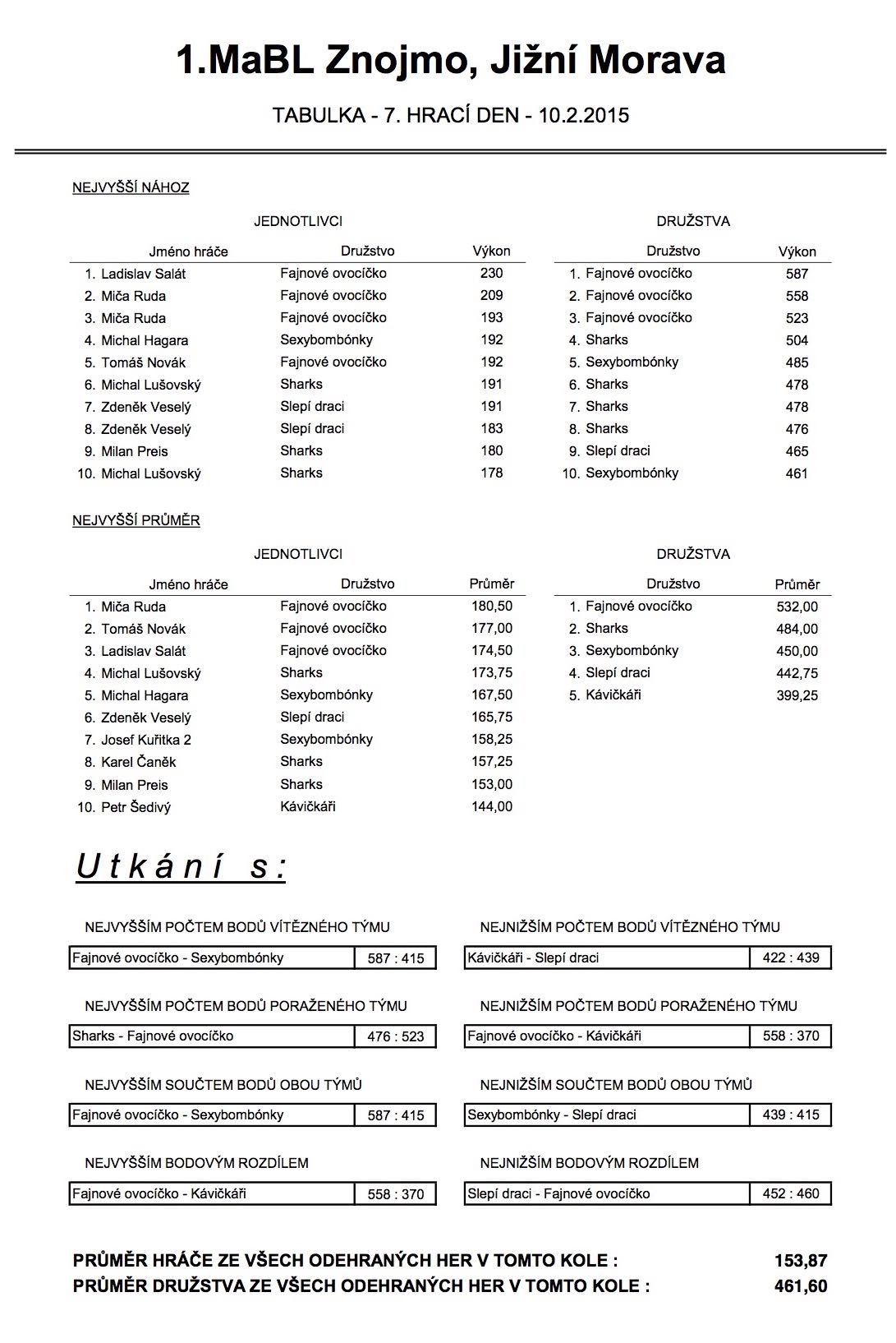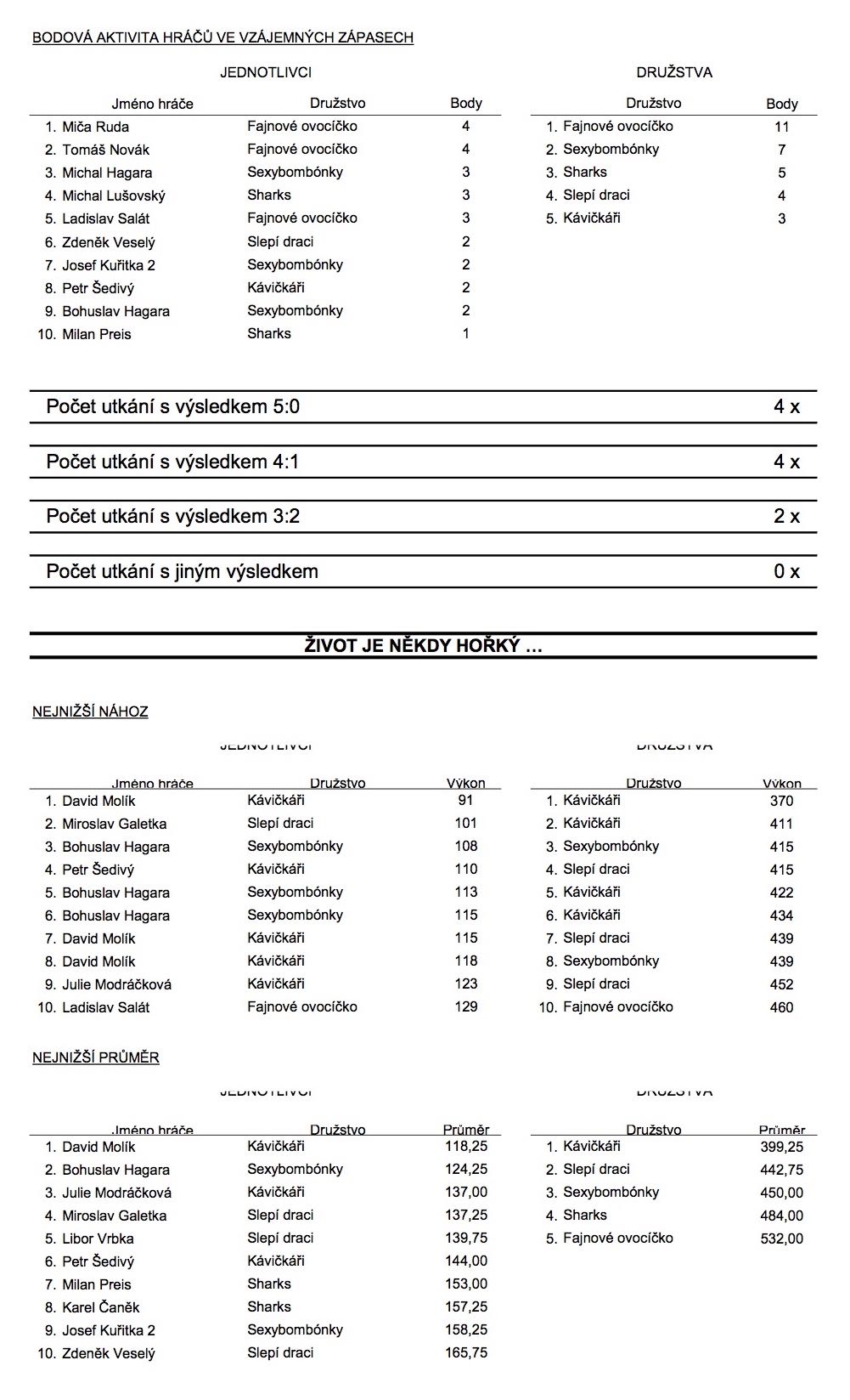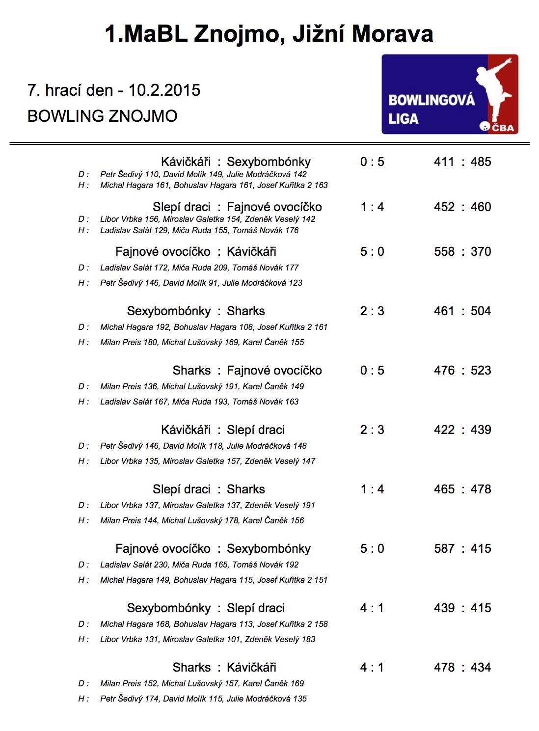 V úterý 10.2.2015 zahájila družstva 1. Městské amatérské bowlingové ligy jarní část ročníku 2014/2015. Výsledky naleznete v článku.