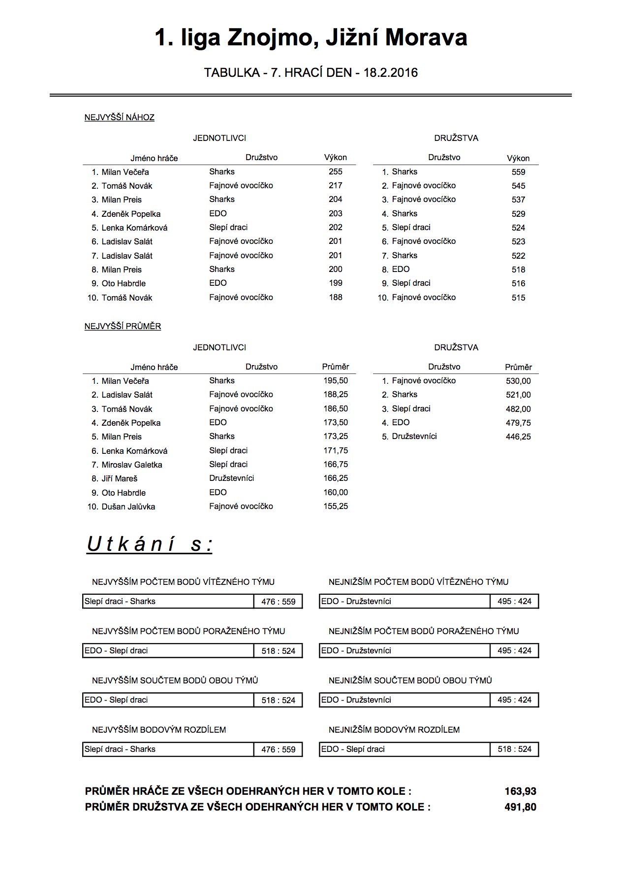 Jarní kolo jsme zahájili a ve čtvrtek 18.2.2016 odehrála družstva první ligy 7. kolo Městské amaterské bowlingové ligy 2015/2016. Výsledky naleznete dále v článku.