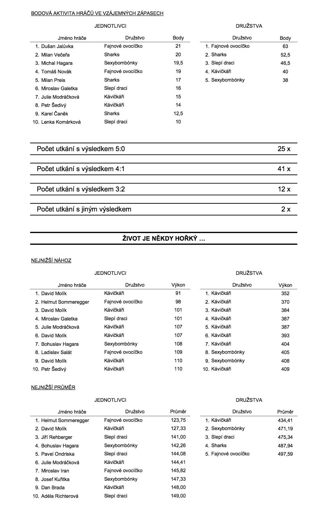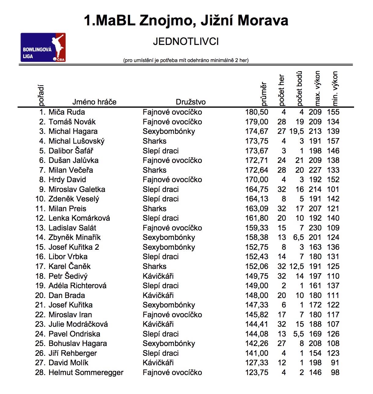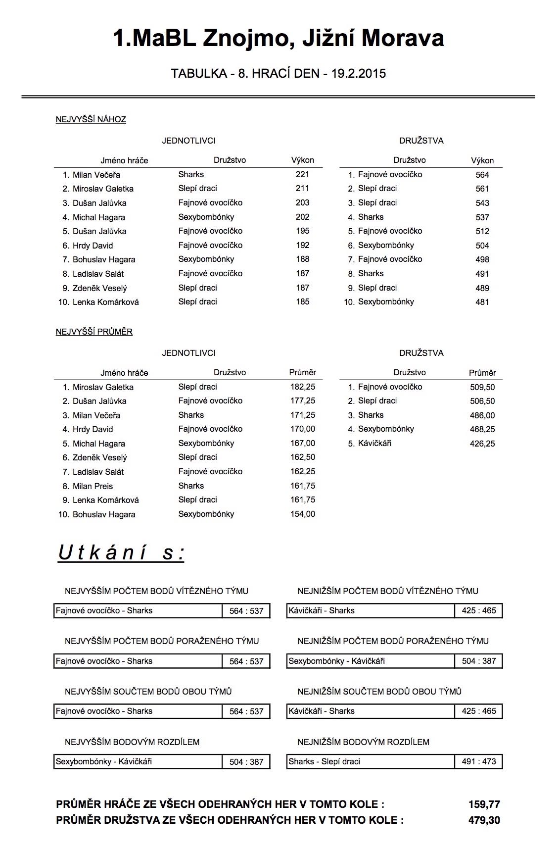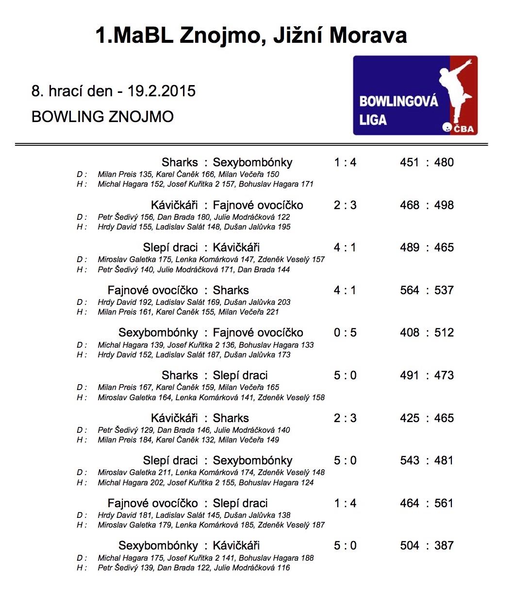 V úterý 19.2.2015 odehrála družstva 1. Městské amatérské bowlingové ligy druhé kolo jarní část ročníku 2014/2015. Výsledky naleznete v článku.