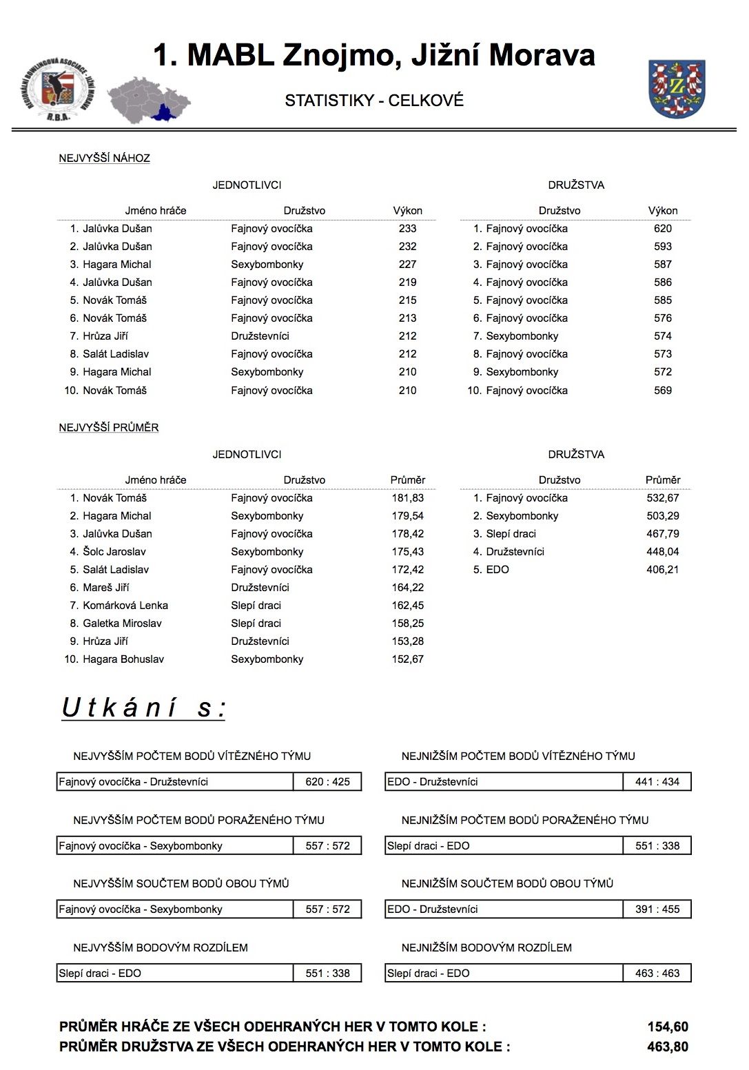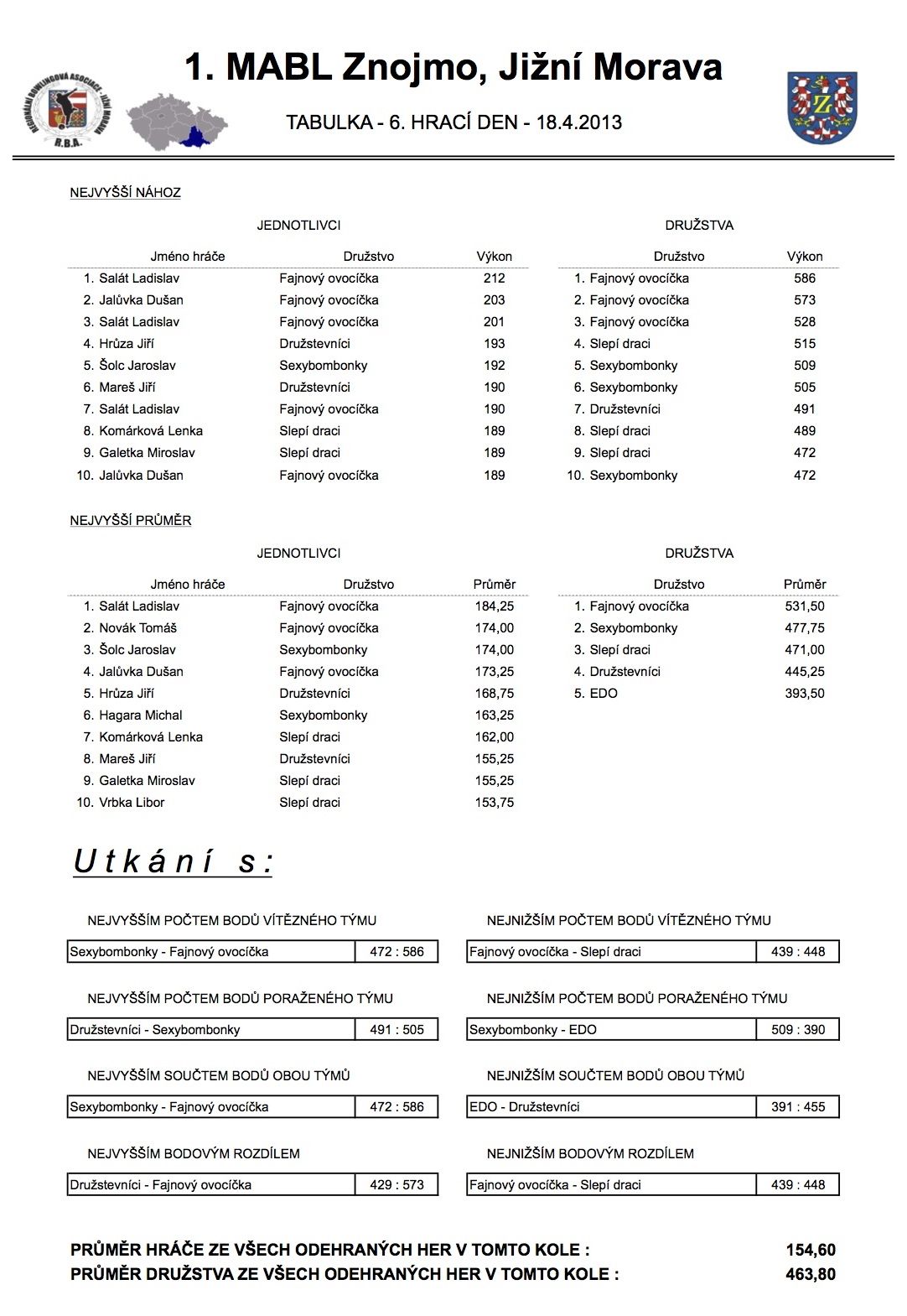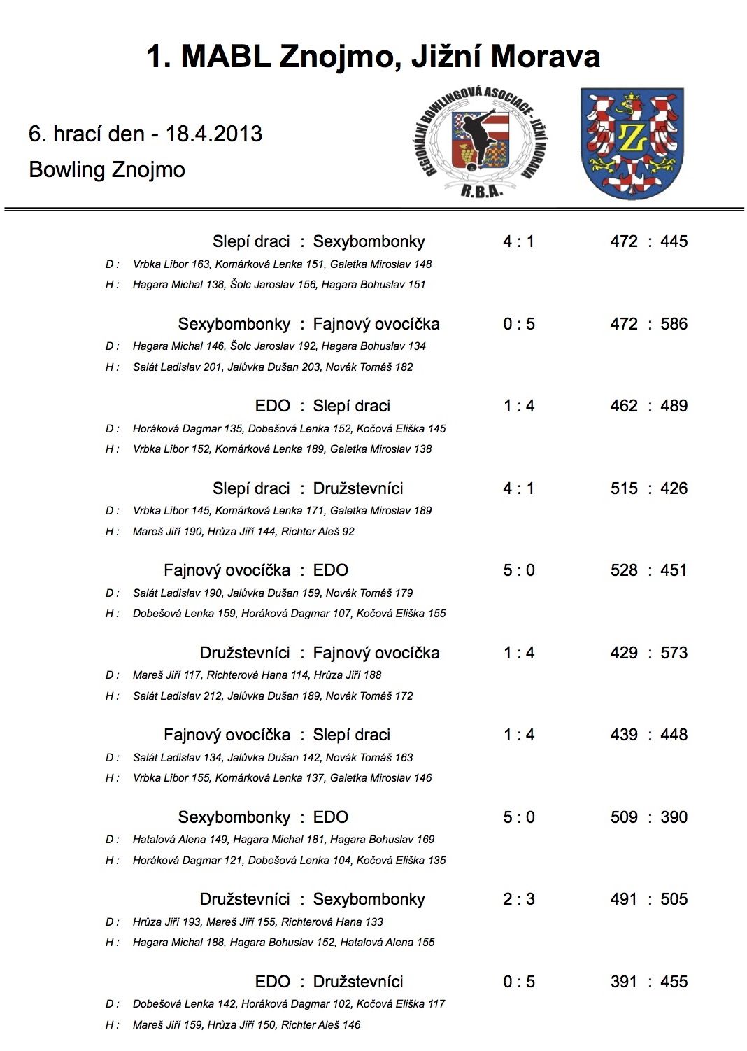 18.4.2013 proběhlo finále 1.MABL, jehož výsledky naleznete níže. Oficiální zakončení Městské bowlingové amatérské ligy bude vyhlášeno po odehrání zbývajích kol MABL a budeme vás včas informovat. Proběhne za účasti všech týmu a spojíme ho s krátkým posezením a malým rautem.