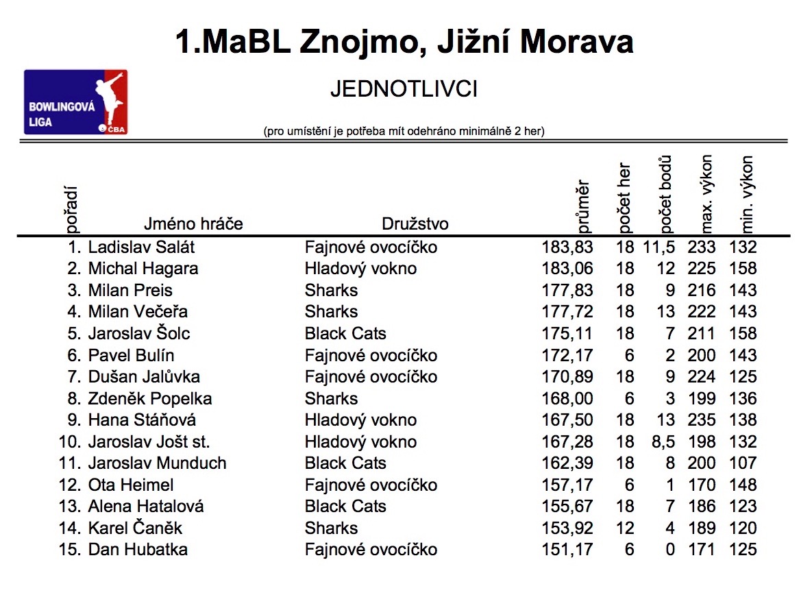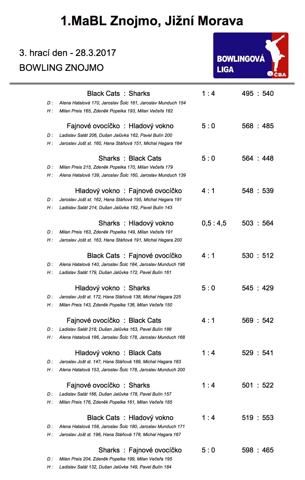 V úterý 28.3.2017 odehrála družstva 1. Městské amatérské bowlingové ligy již třetí kolo jarní části ročníku 2017. Výsledky naleznete jako vždy v článku.