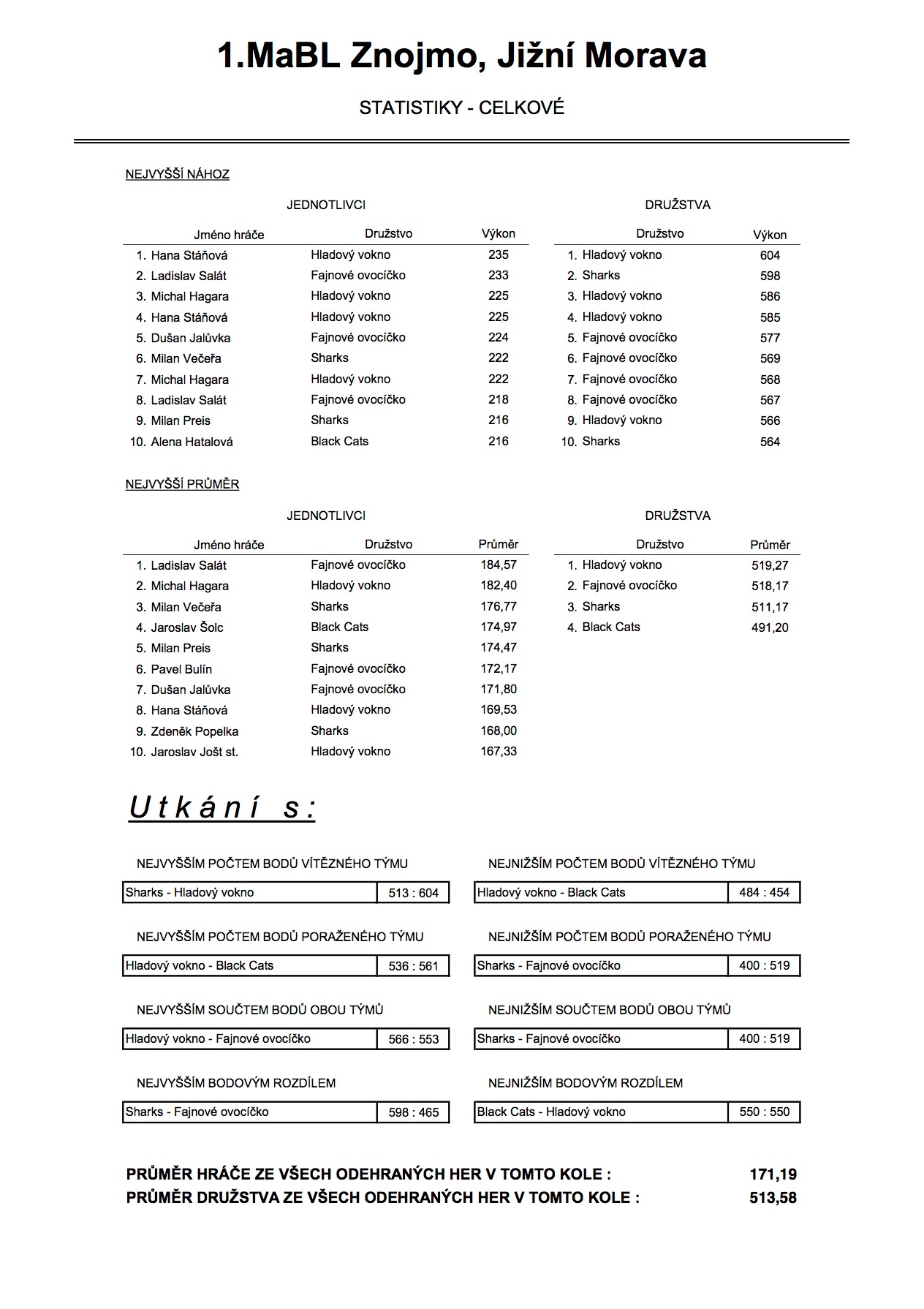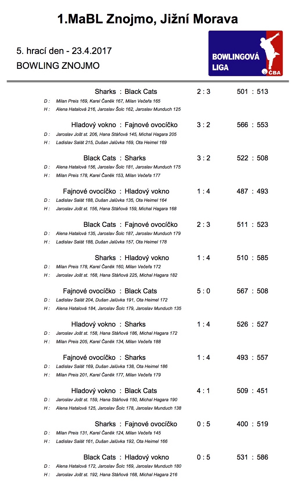 V neděli 23.4.2017 odehrála družstva 1. Městské amatérské bowlingové ligy poslední kolo jarní části ročníku 2017. Výsledky naleznete jako vždy v článku.