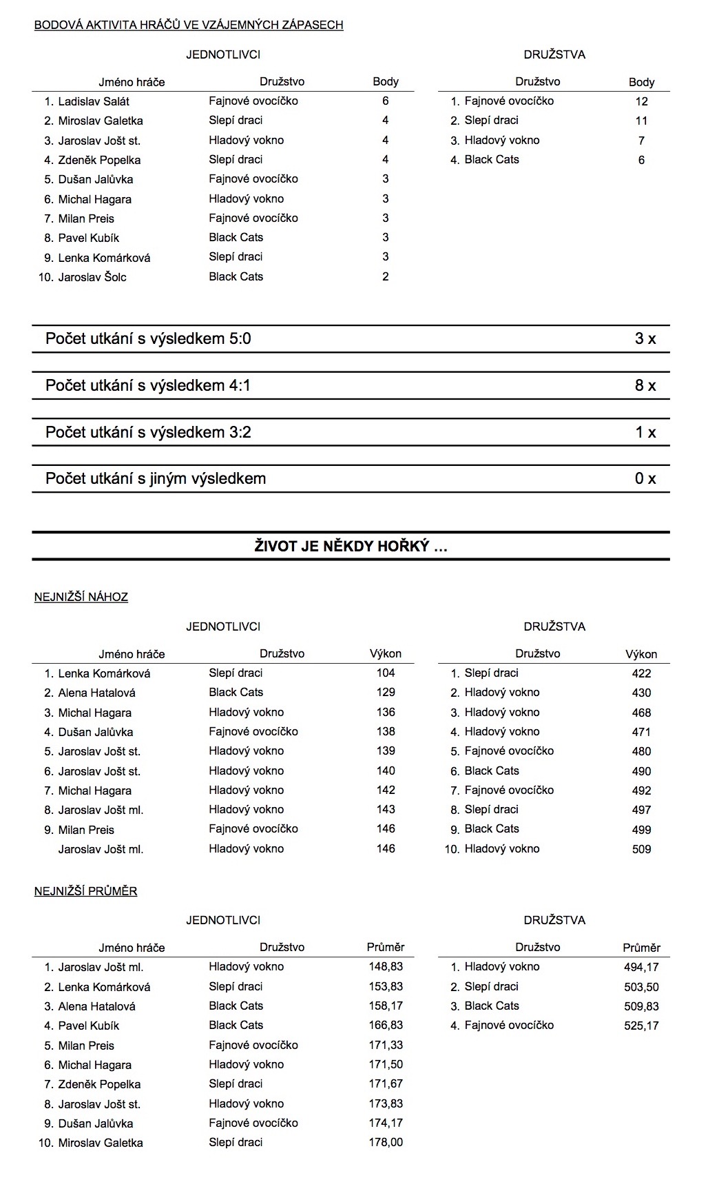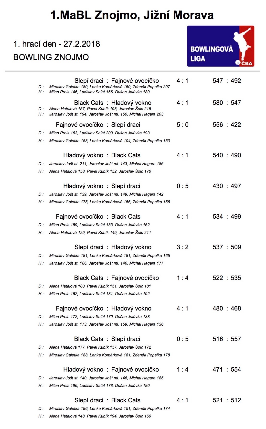 V úterý 27.2.2018 zahájila družstva 1. Městské amatérské bowlingové ligy první kolo jarní části ročníku 2017/2018. Výsledky naleznete jako vždy v článku.