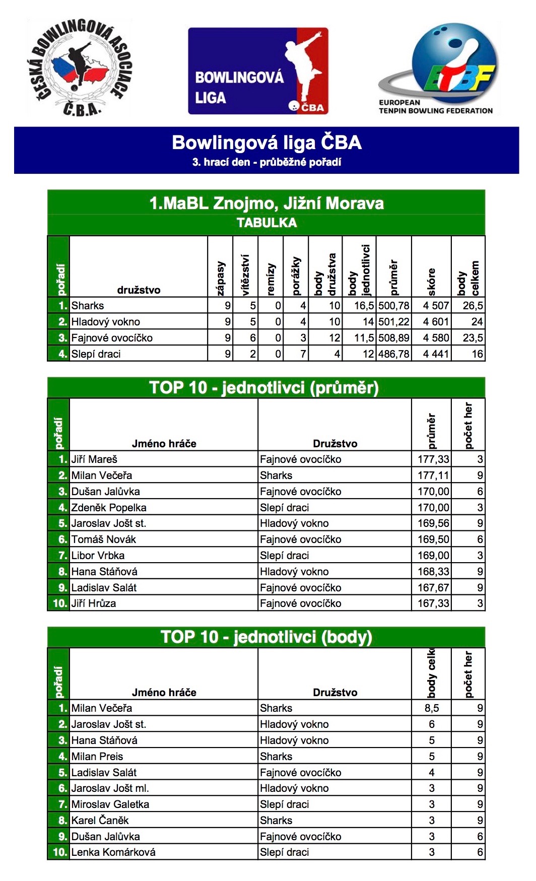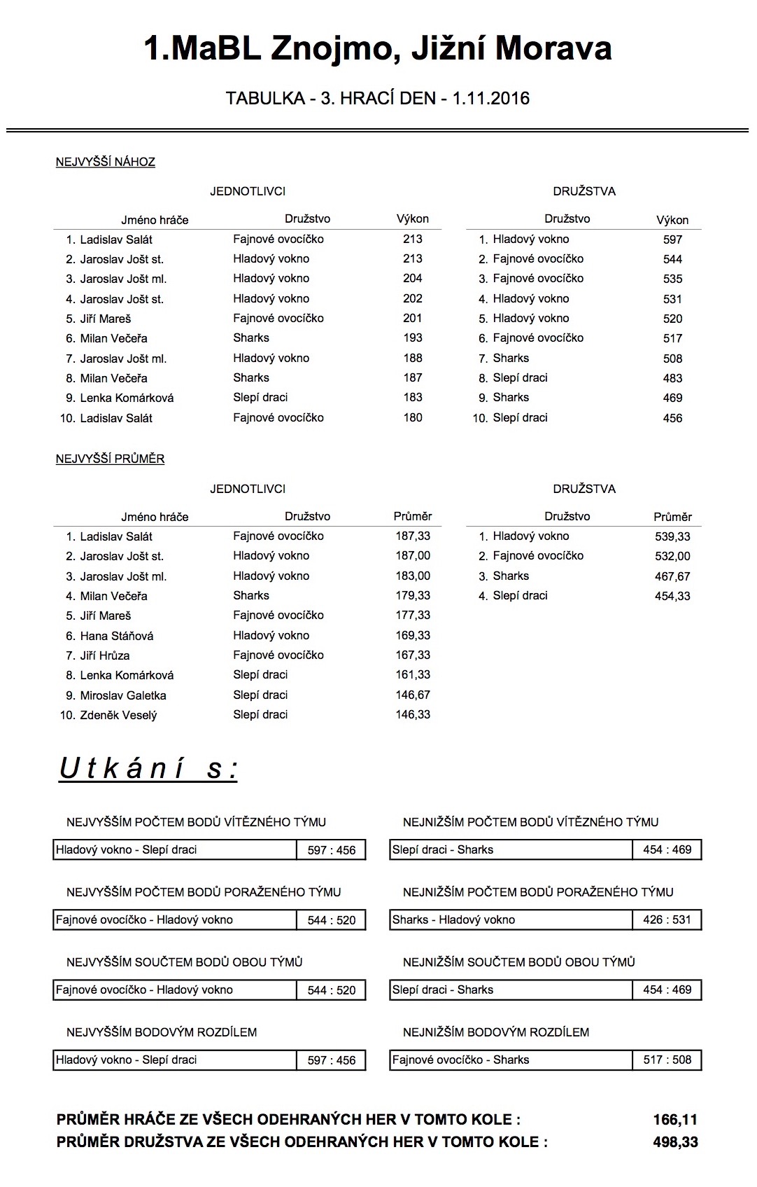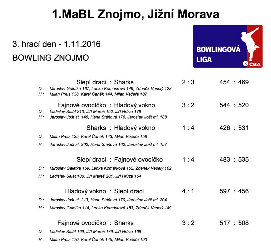 V úterý 1.11.2016 odehrála družstva 1.Městské amatérské bowlingové ligy třetí kolo podzimní části ročníku 2016. Výsledky naleznete jako vždy v článku.