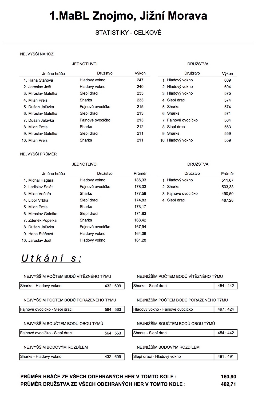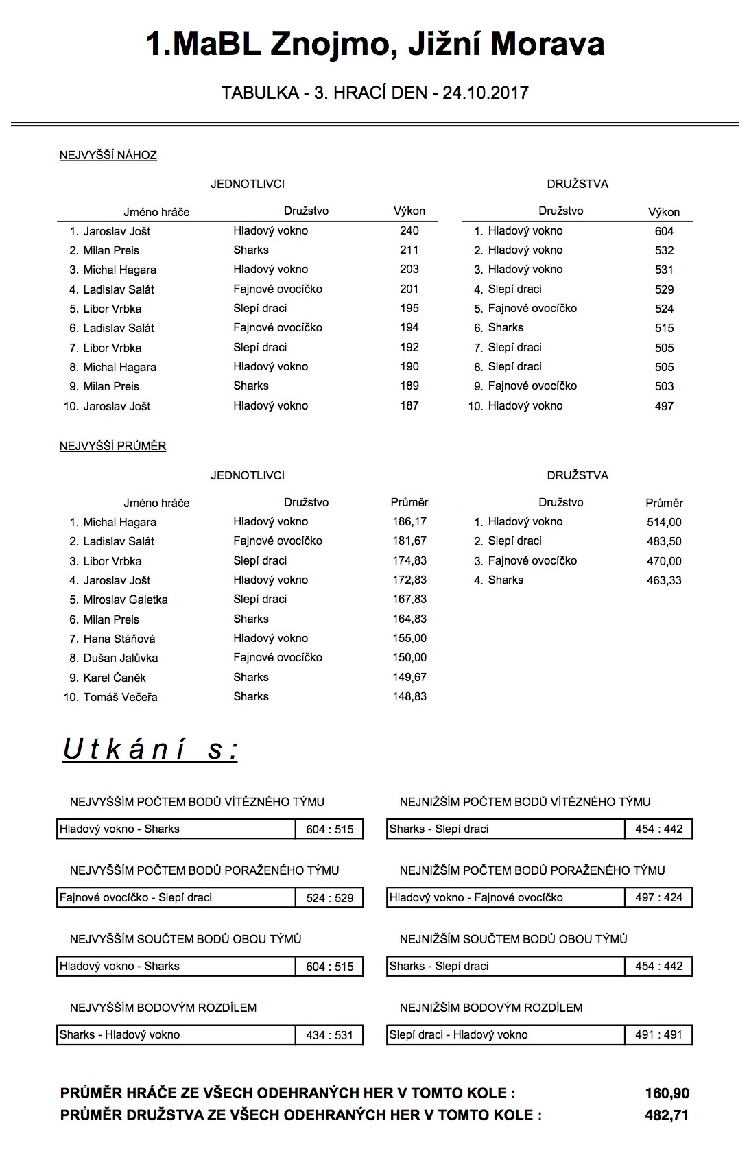 V úterý 24.10.2017 odehrála družstva 1. Městské amatérské bowlingové ligy třetí kolo ročníku 2017/2018. Výsledky naleznete jako vždy v článku.