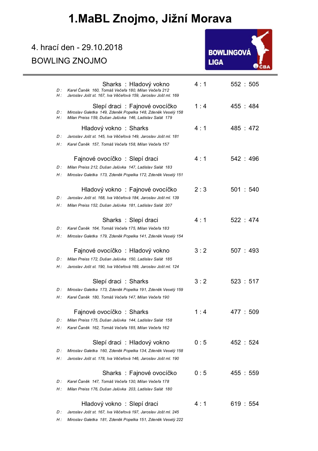 V pondělí 29.října odehrála družstva 1. Městské amatérské bowlingové ligy již třetí kolo ročníku 2018/2019. Jeho výsledky naleznete v článku.