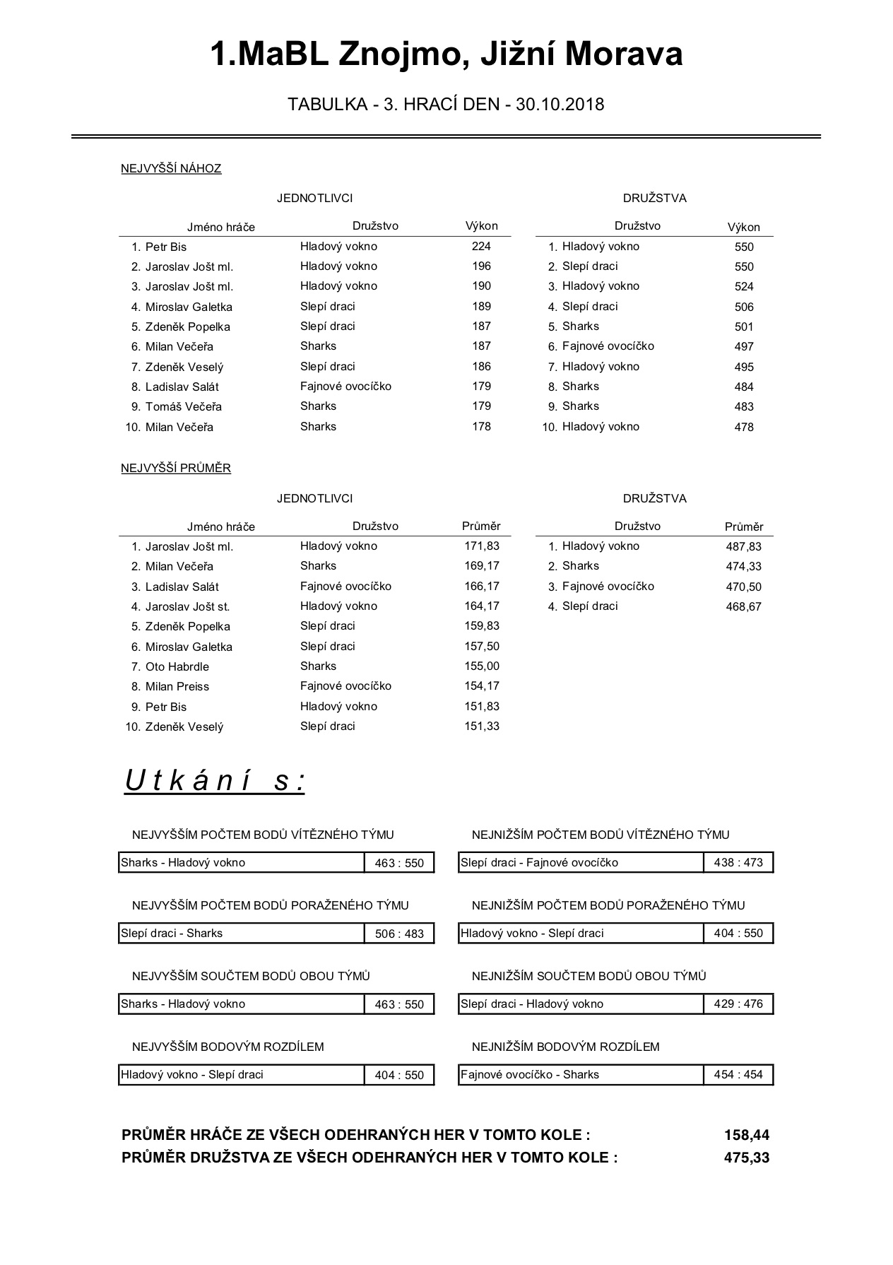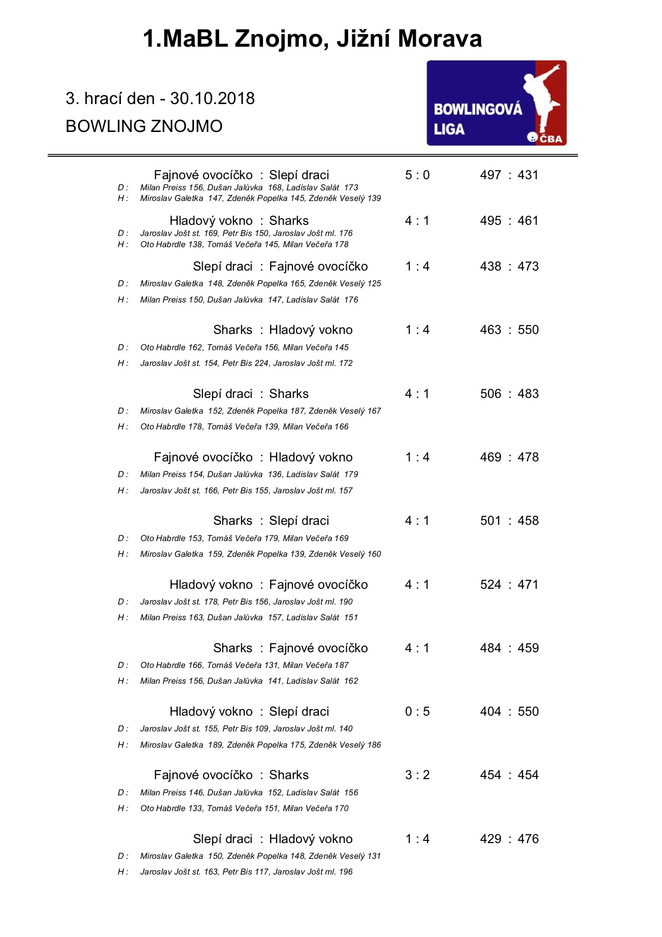 V úterý 30.října odehrála družstva 1. Městské amatérské bowlingové ligy již předpolsední kolo podzimní části ročníku 2018/2019. Jeho výsledky naleznete v článku.