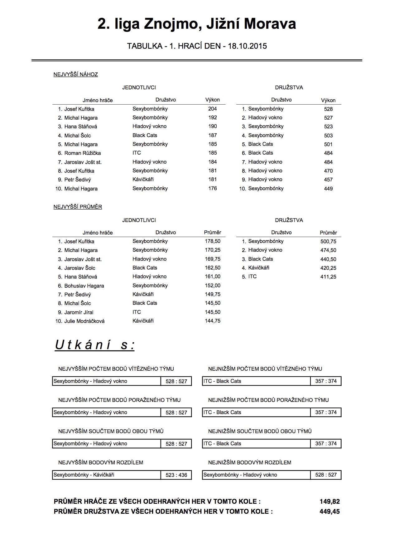 V neděli 18.10.2015 zahájila i družstva druhé ligy nový ročník Městské amatérské bowlingové ligy 2015/2016. Jako obvykle Vás touto cestou budeme informovat o výsledcích jednotlivých hracích dnů.