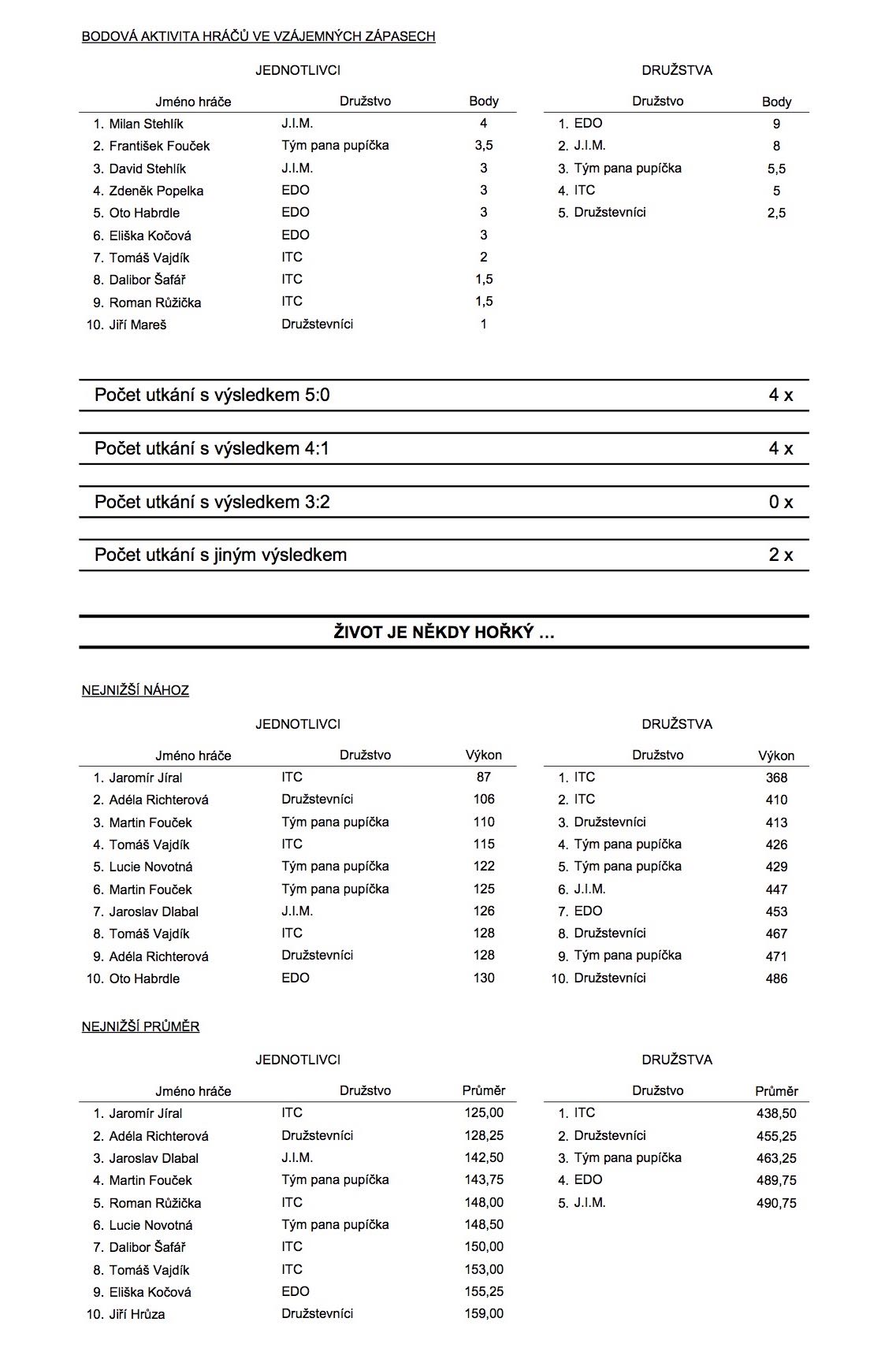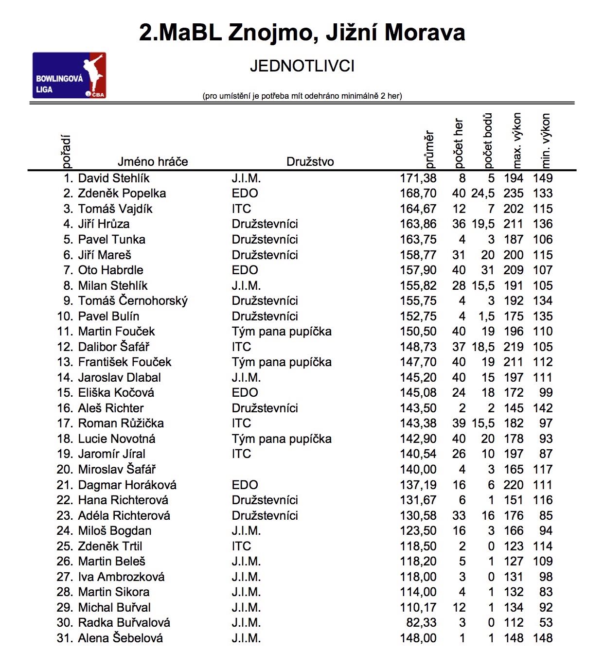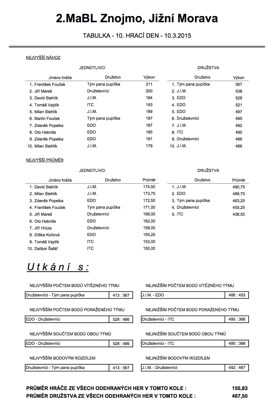 V úterý 10.3.2015 odehrála družstva 2. Městské amatérské bowlingové ligy 10. kolo ročníku 2014/2015 a přehoupla se tak do druhé poloviny jarní části. Výsledky Vám touto cestou přinášíme: