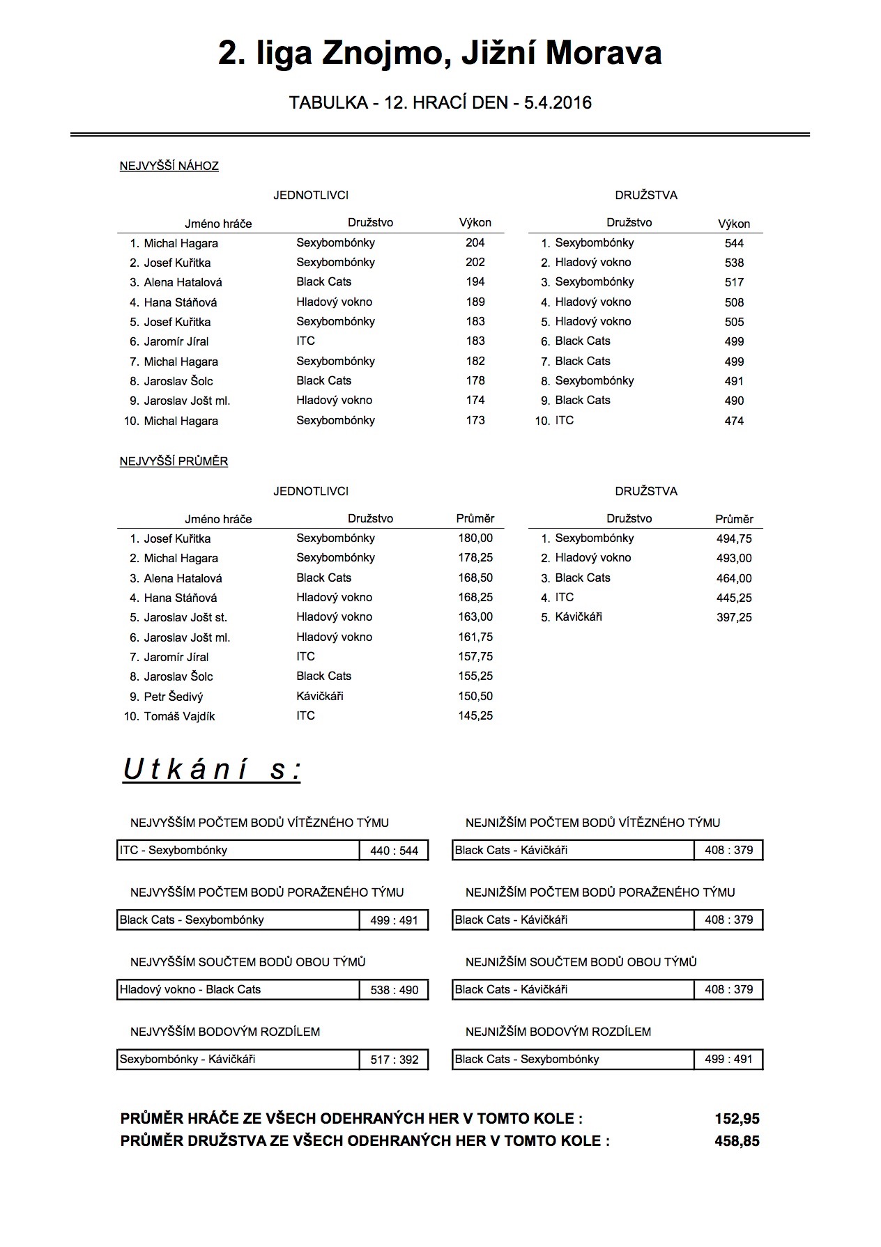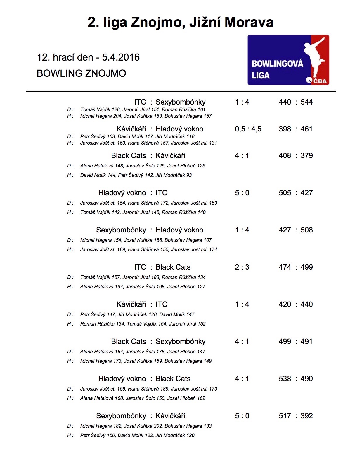 V úterý 5.4.2016 odehrála družstva 2. Mětské amatérské bowlingové ligy dvanácté, poslední kolo ročníku 2015/2016. Výsledky naleznete v článku a těšíme se na Vás při vyhlášení výsledků, které se bude konat ve čtvrtek 21.4.2016 od 18:00.