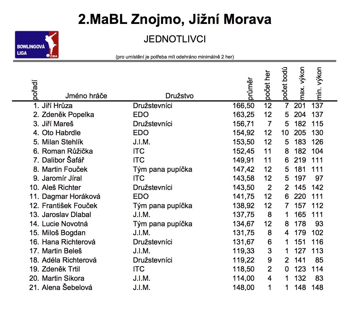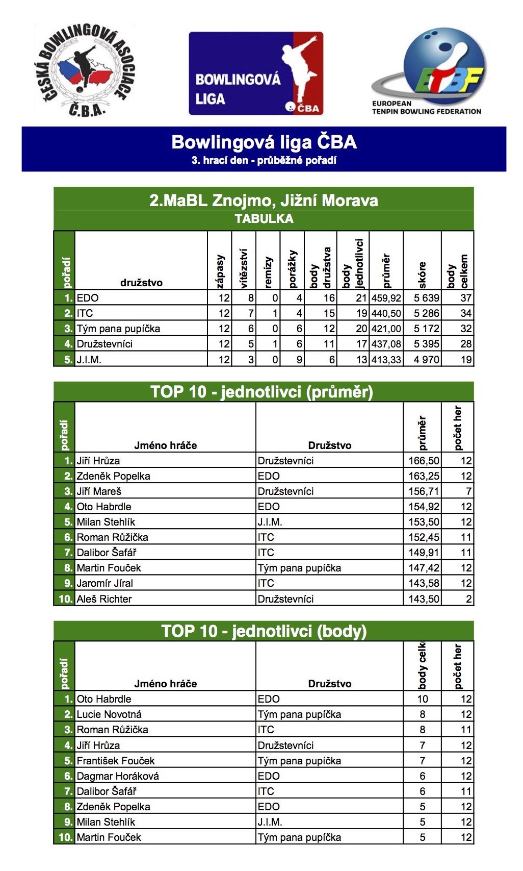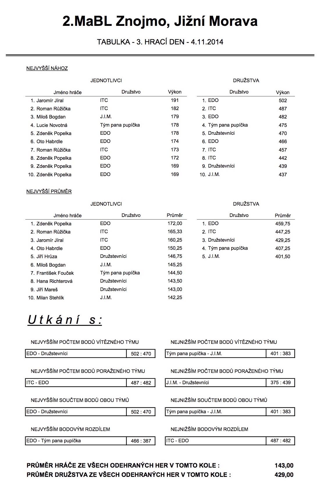 4.11.2014 odehrála družstva 2. Městské amatérské bowlingové ligy třetí kolo a má odehráno polovinu počtu kol podzimní části. Výsledky již začínají naznačovat jak skončí podzimní část. Jak ale známe z předchozích ročníků, konečný výsledek může dopadnout úplně jinak.