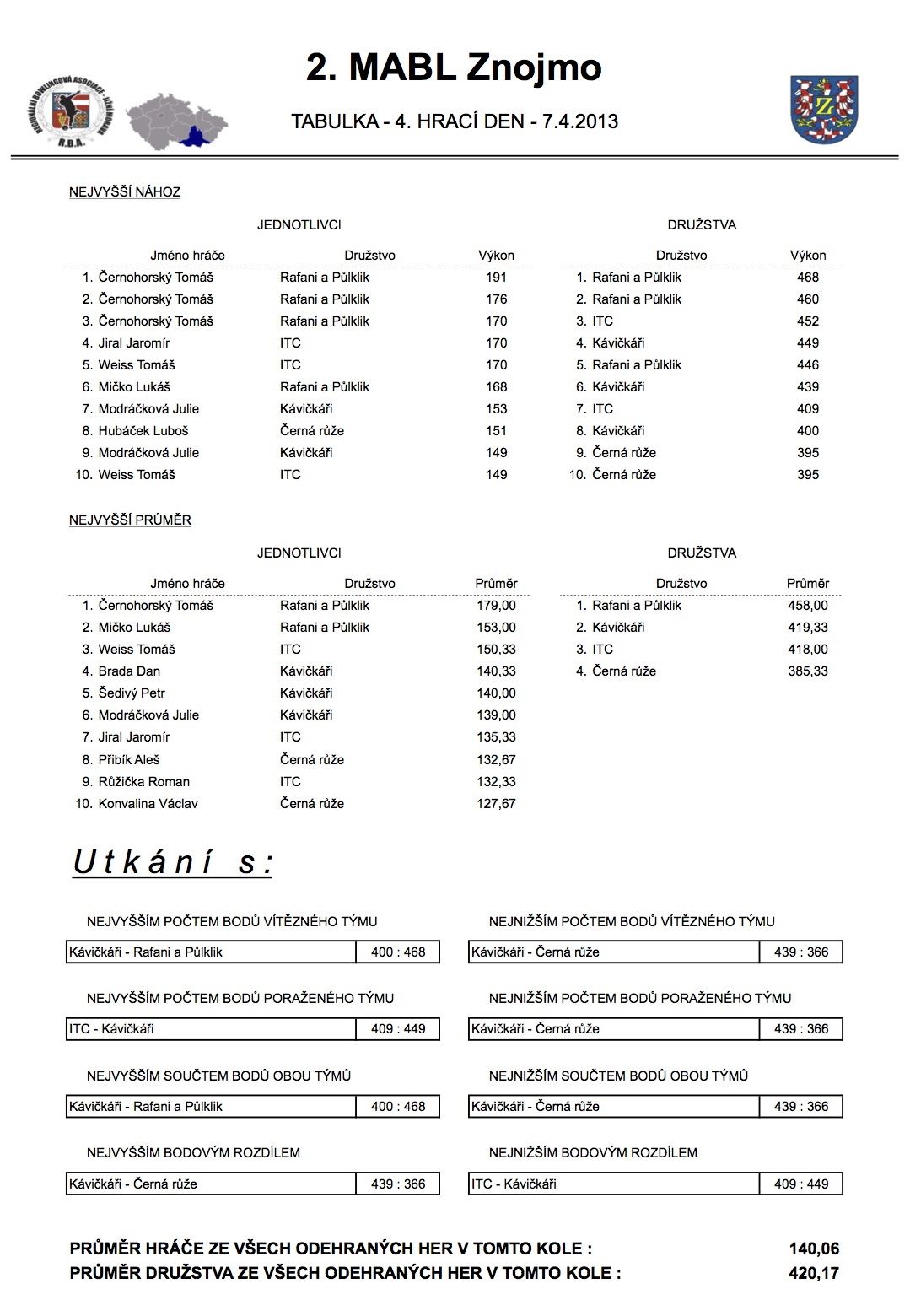 V neděli 7.4.2013 proběhlo čtvrté kolo 2.MABL a i v této soutěži se nám jarní kolo přehouplo do druhé poloviny. Už zbývají pouze dvě kola a atmosféra nám trochu houstne. Některé týmy mobilizují své síly, některé naopak podléhaji panice. Měl jsem jednoho Jagera!!! :)