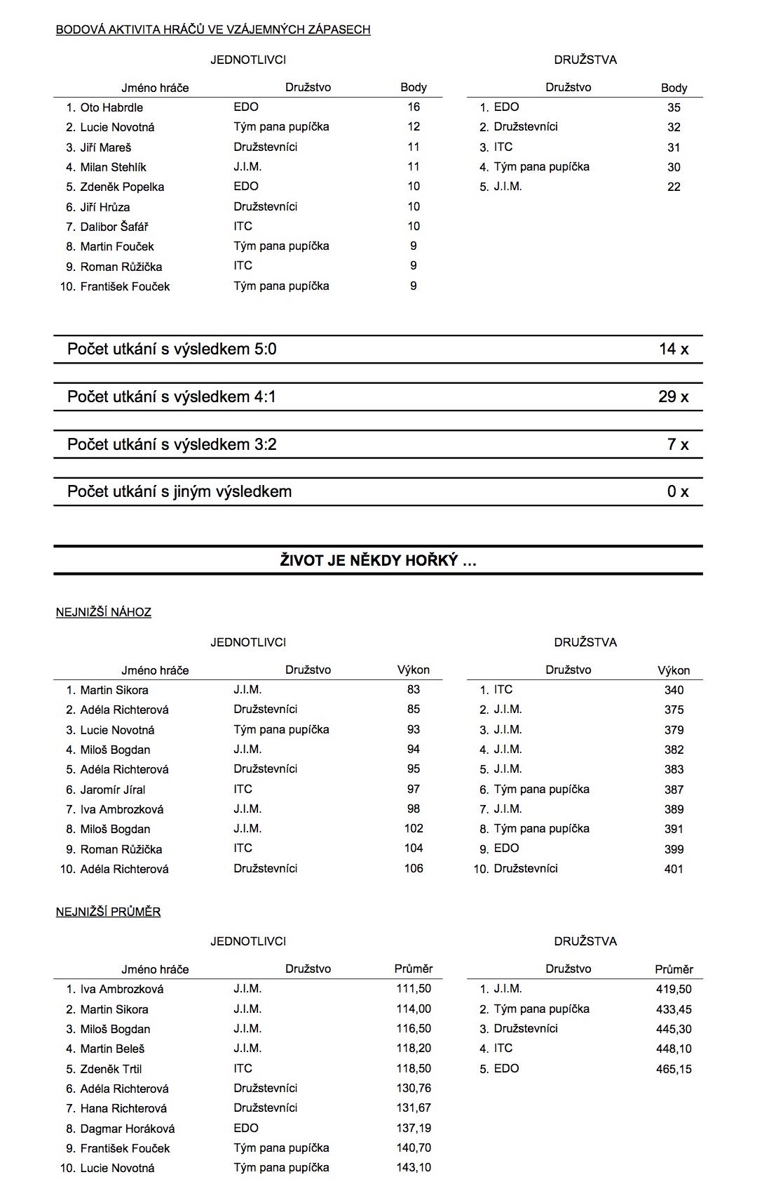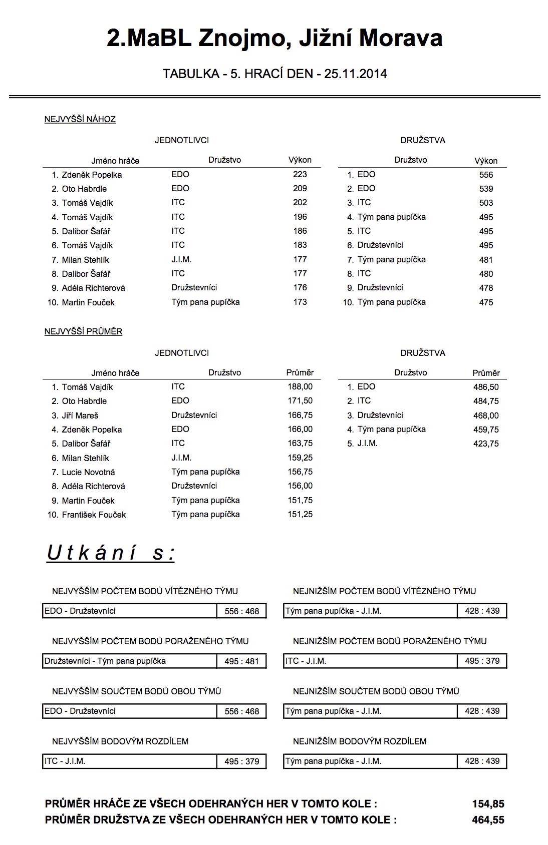 V úterý 25.11.2014 odehrála družstva 2. Městské amaterské bowlingové ligy již 4. kolo podzimní části. Výsledky jako vždy příkládáme.