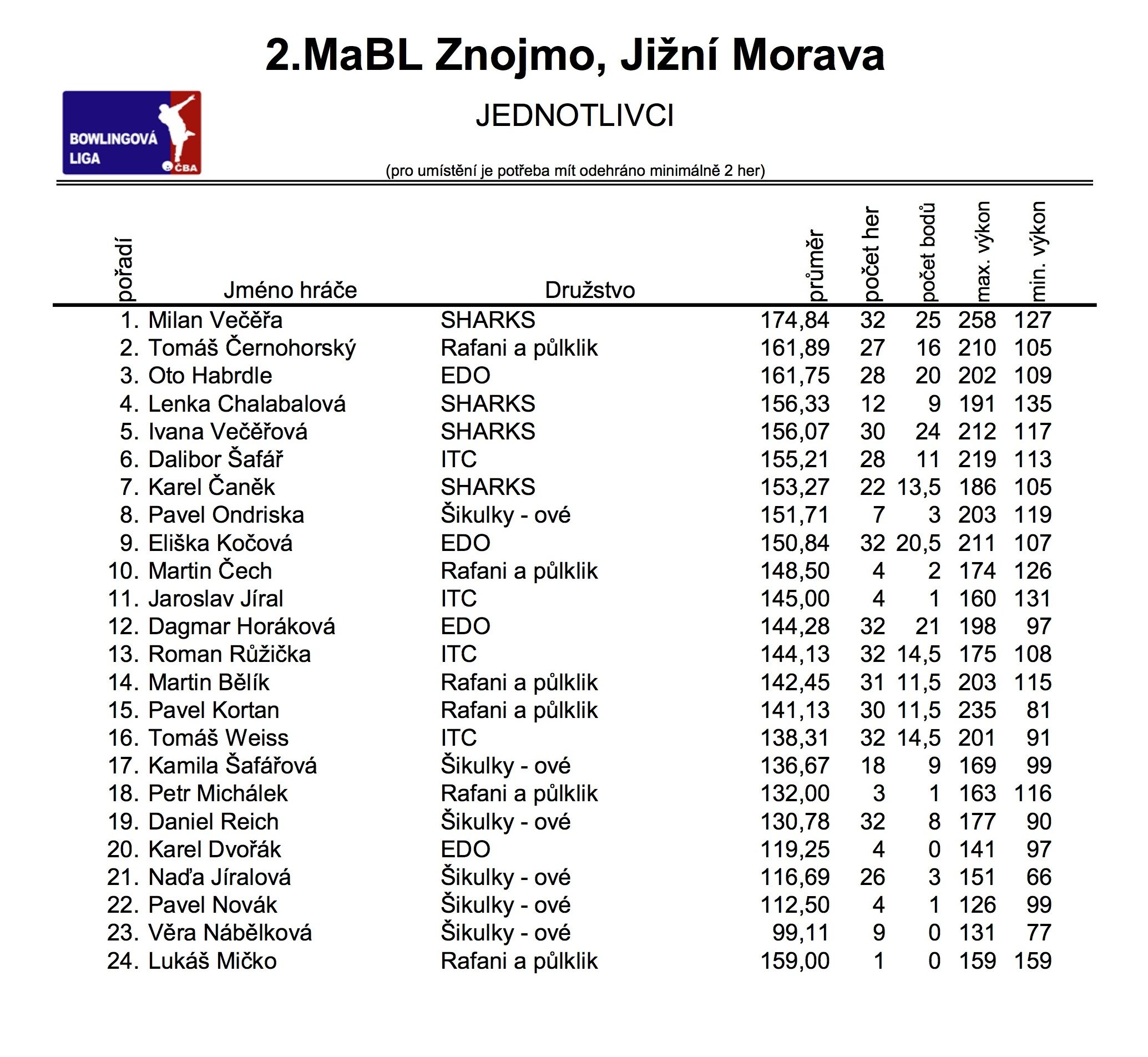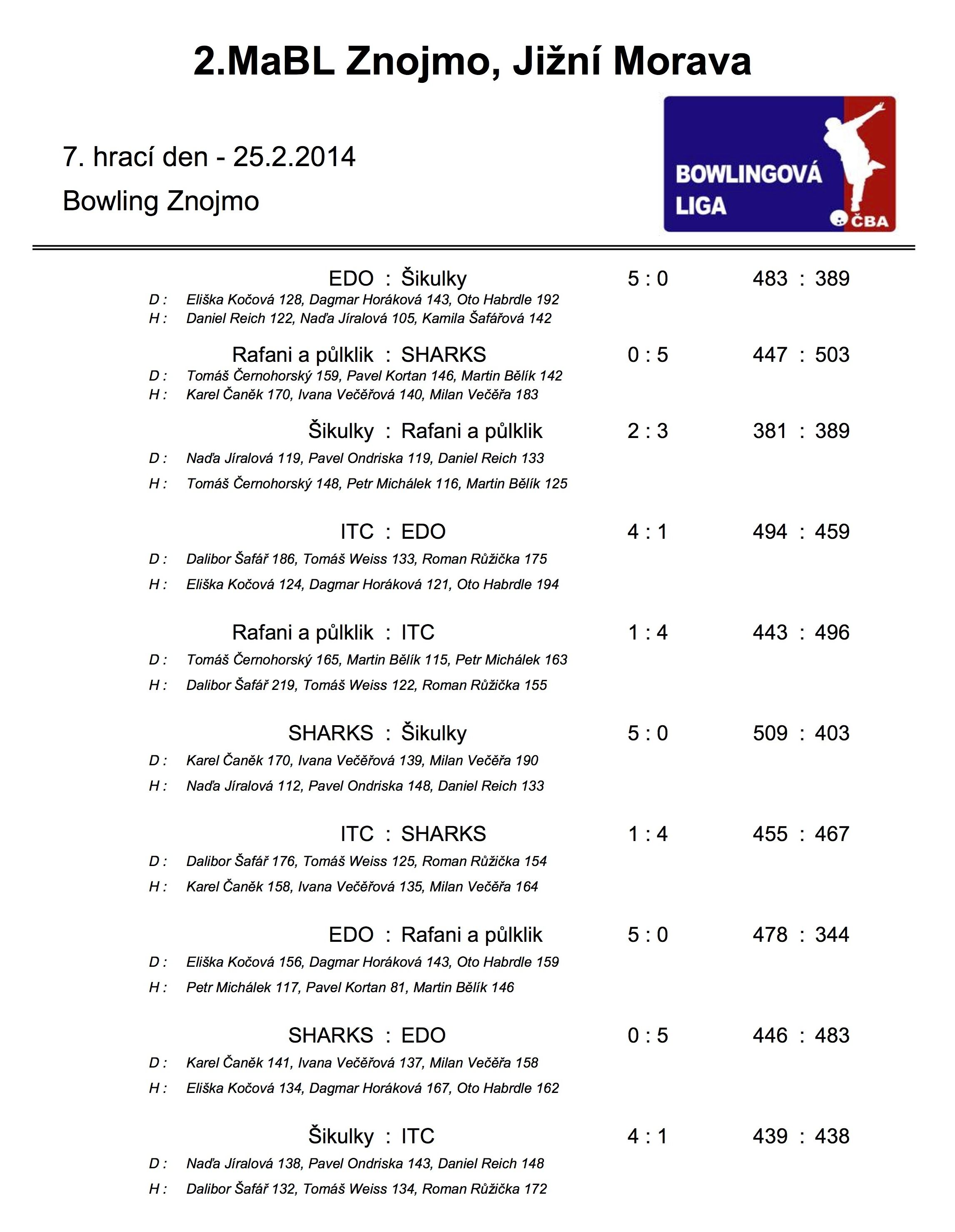 V úterý 4.3.2014 se odehrálo 8. kolo 2.Městské amatérské bowlingové ligy. Výsledky naleznete dále.