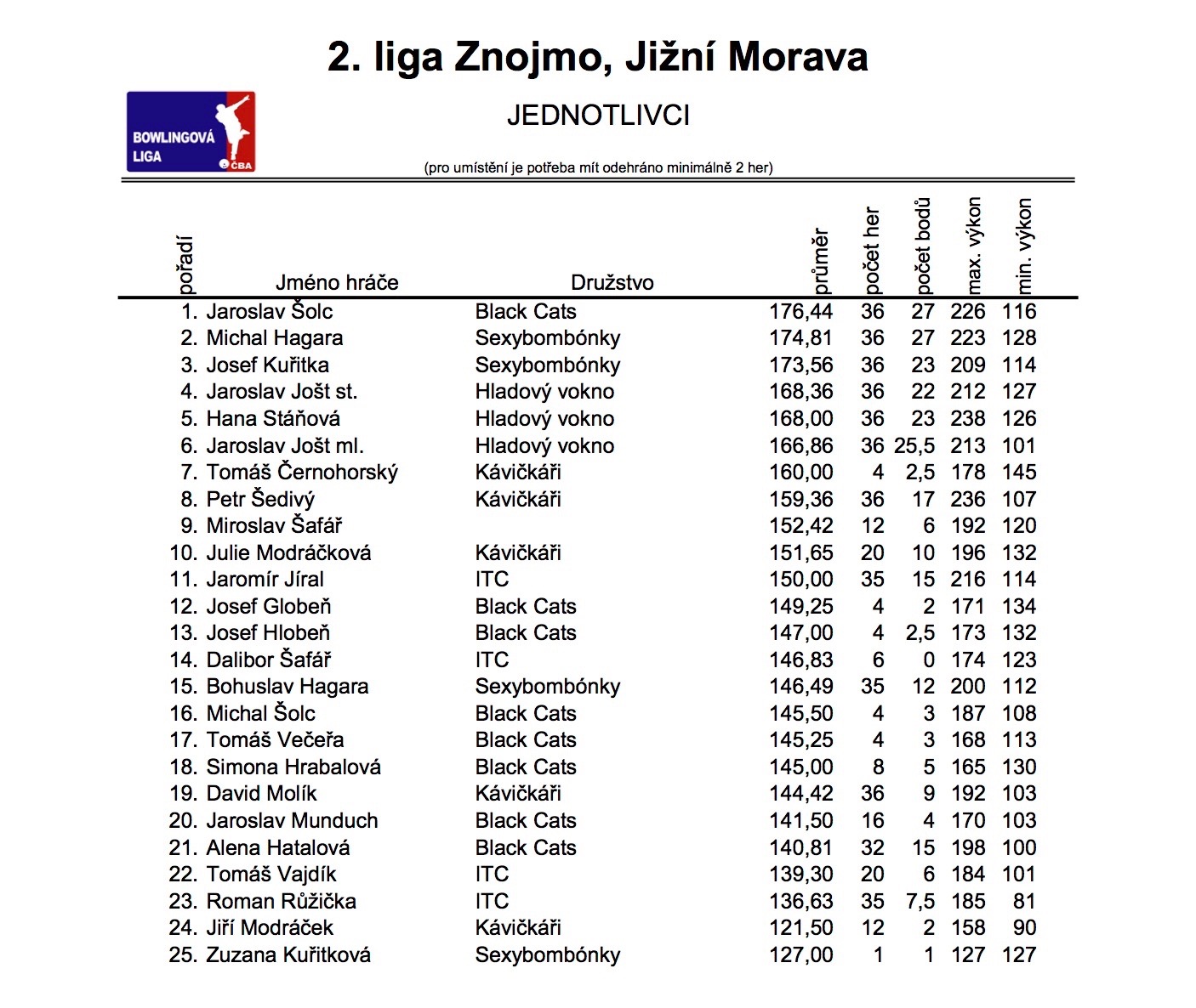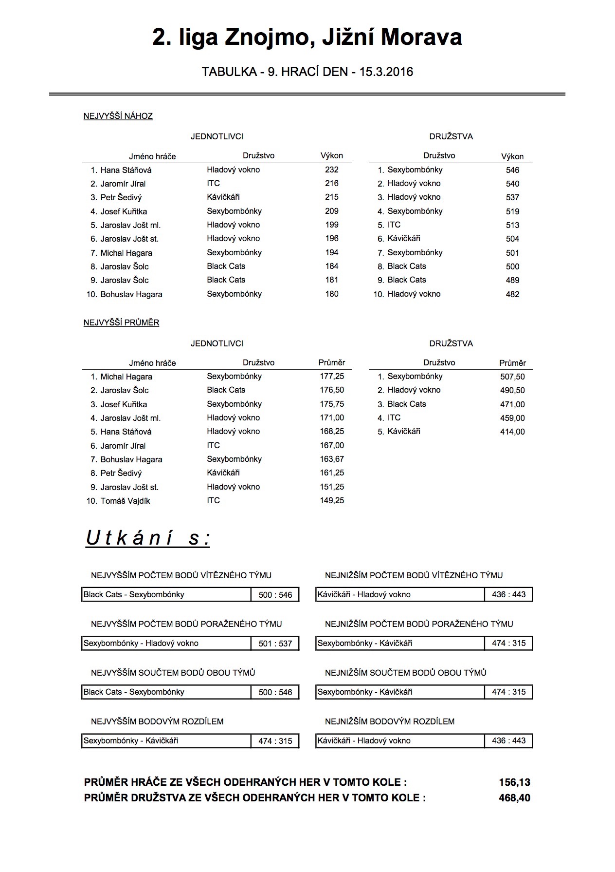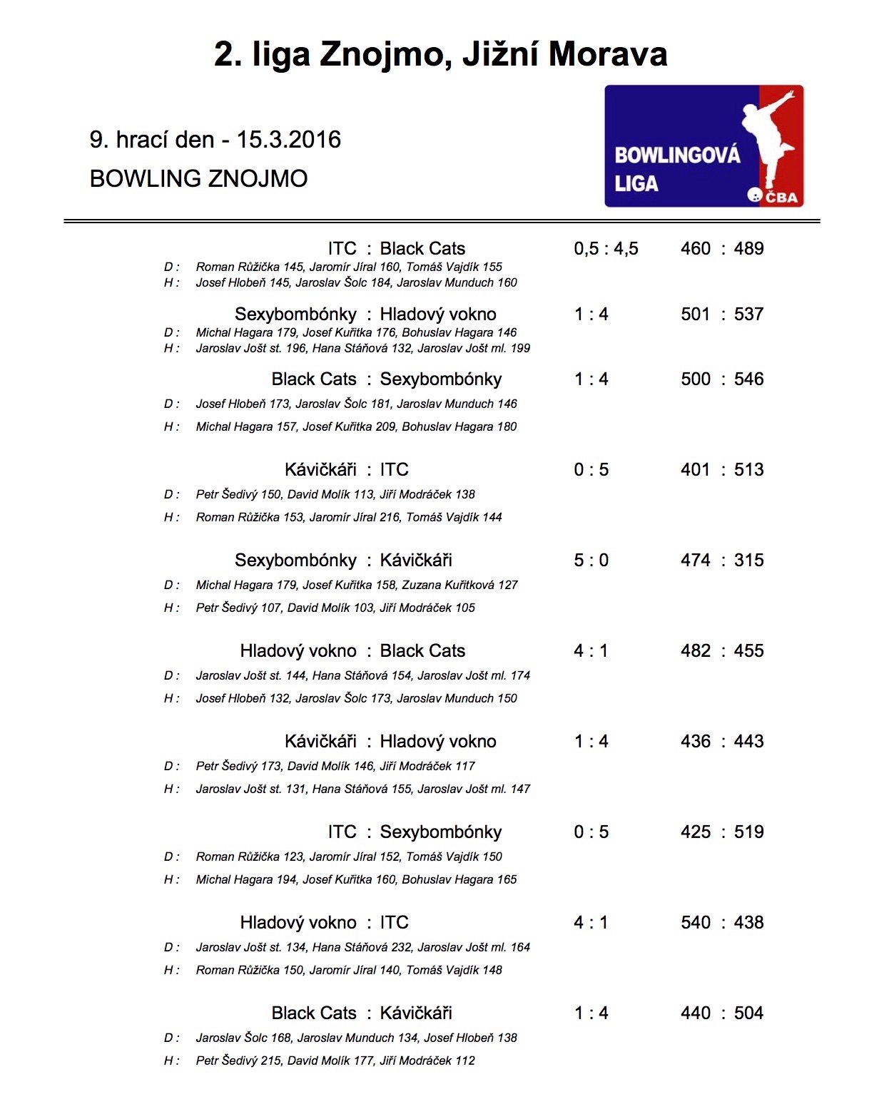 V úterý 15.března odehrála družstva 2. Městské amatérské bowlingové ligy již deváté kolo ročníku 2015/2016. Výsledky jsou v článku.