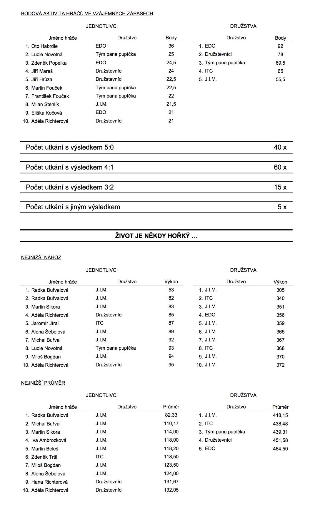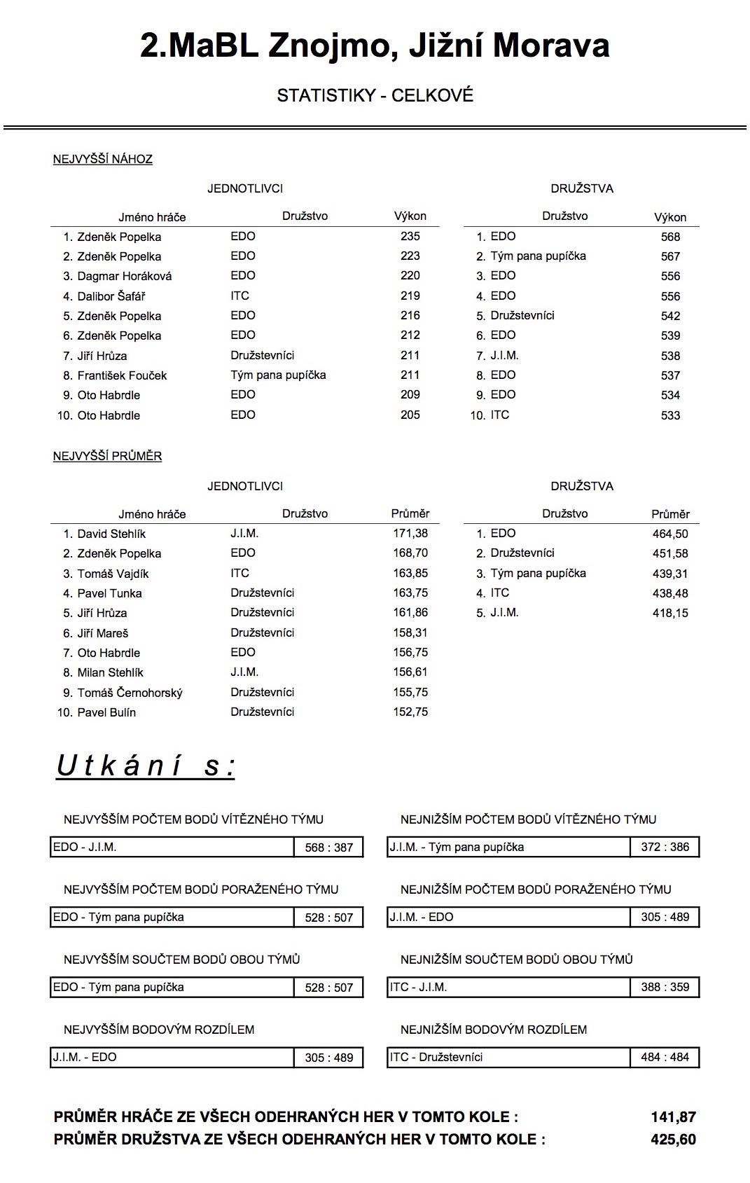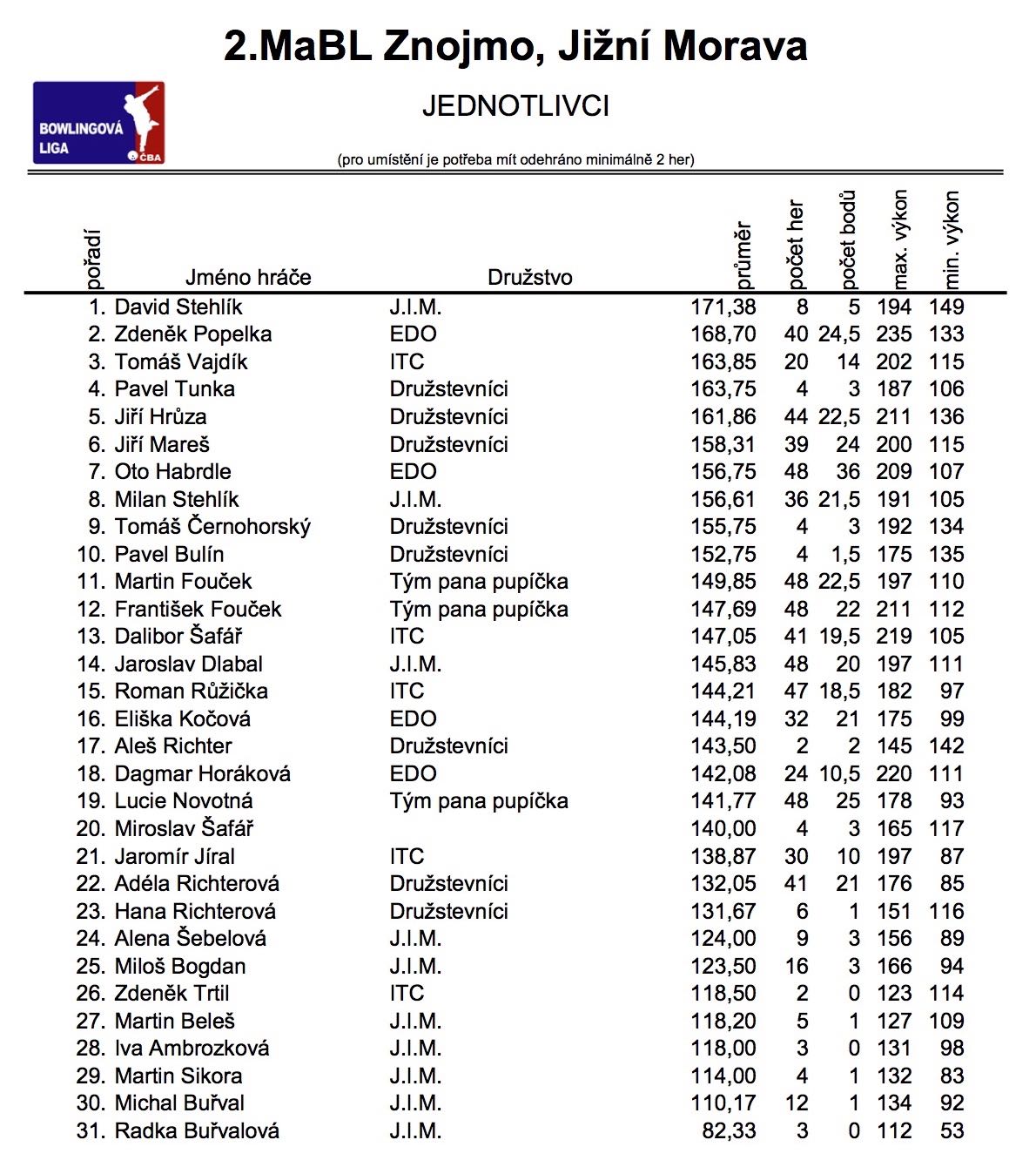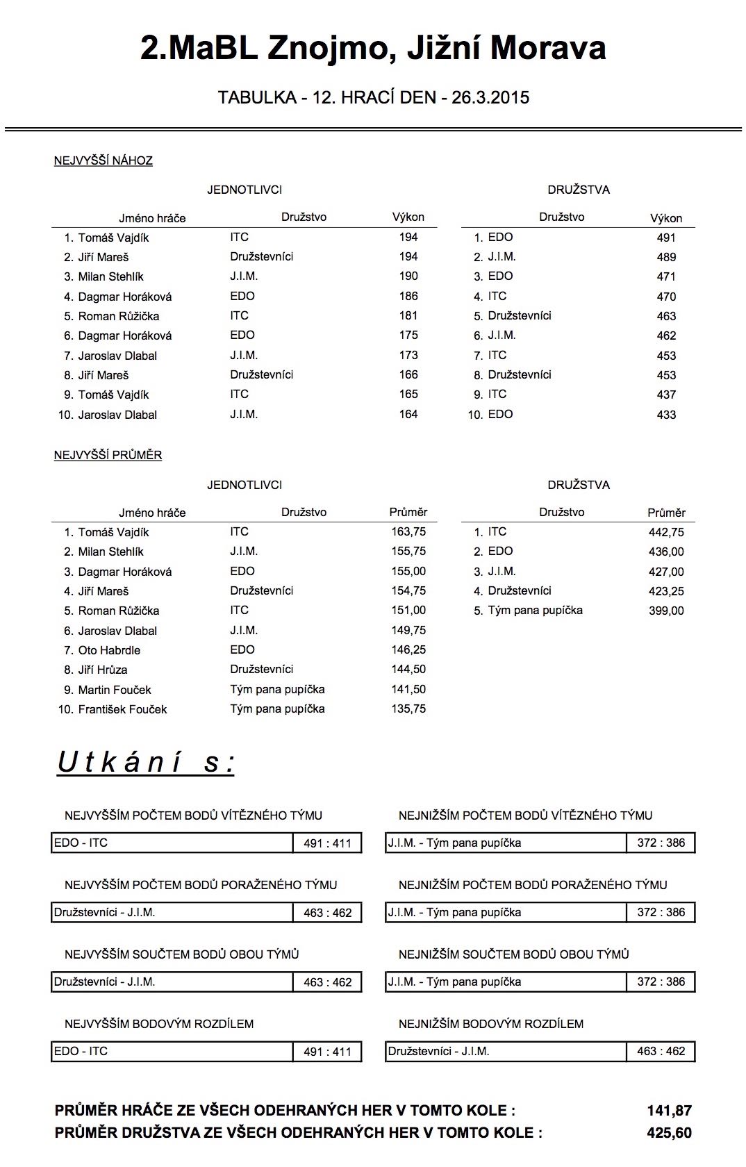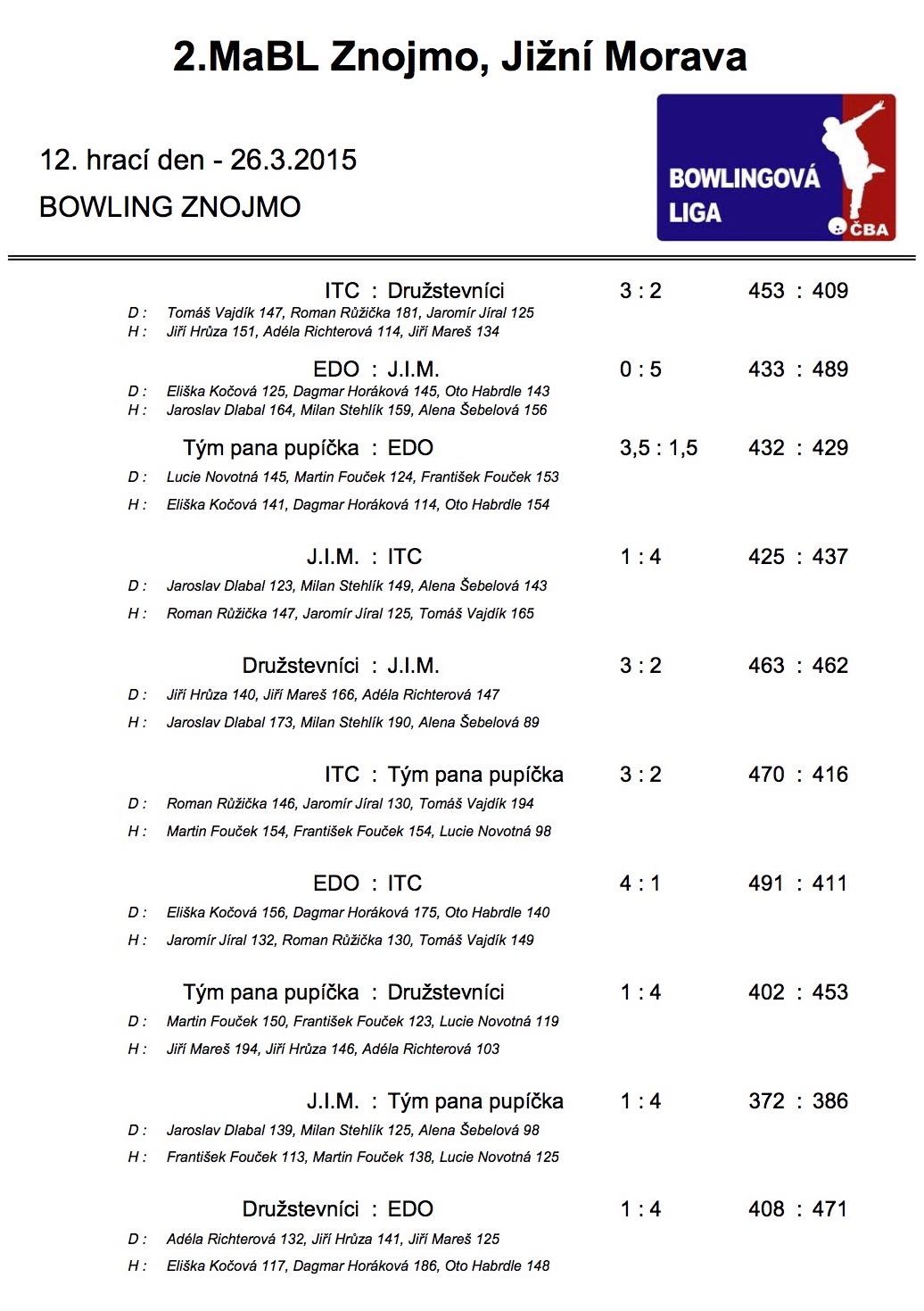 Ve čtvrtek 26.3.2015 odehrála družstva 2. Městské amatérské bowlingové ligy finálové kolo ročníku 2014/2015. Výsledky Vám touto cestou přinášíme: