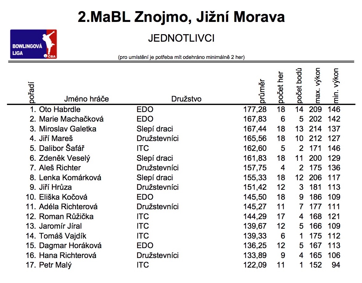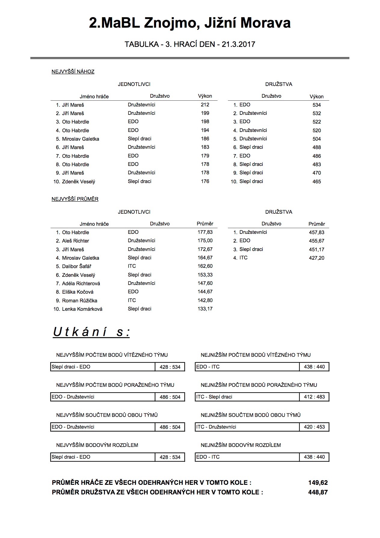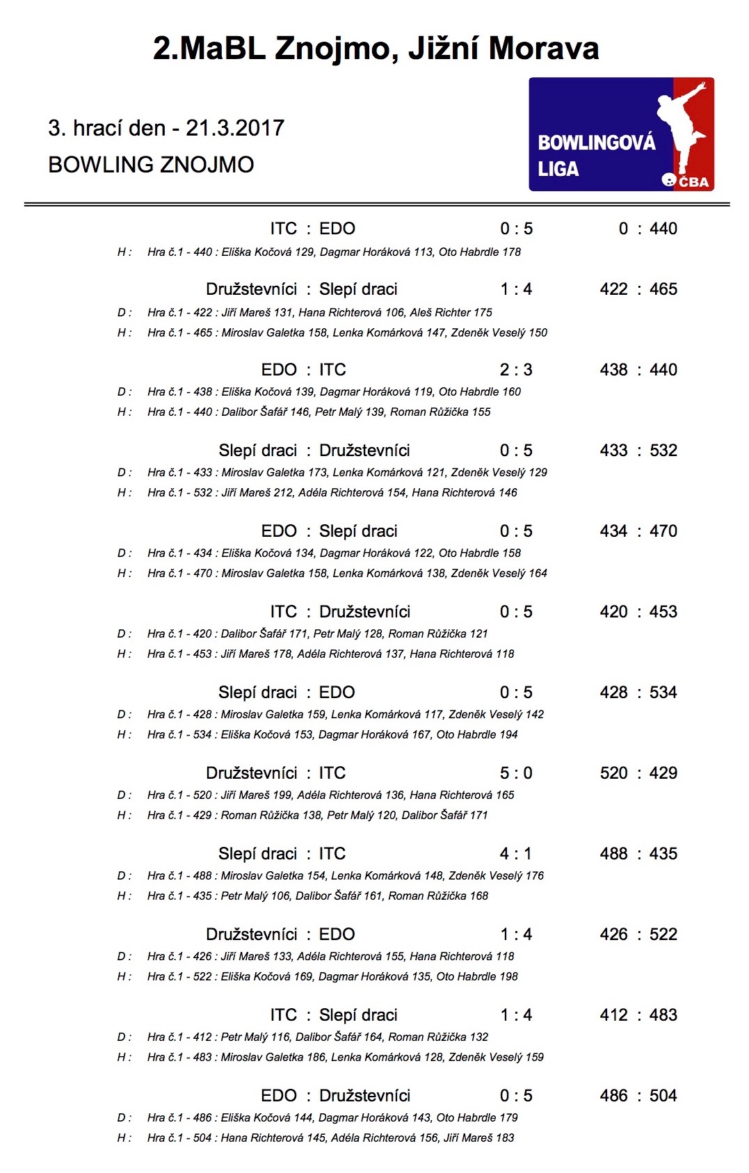 V úterý 21.3.2017 odehrála družstva 2. Městské amatérské bowlingové ligy již třetí kolo jarní části ročníku 2017. Výsledky naleznete jako vždy v článku.