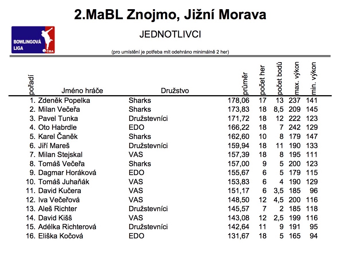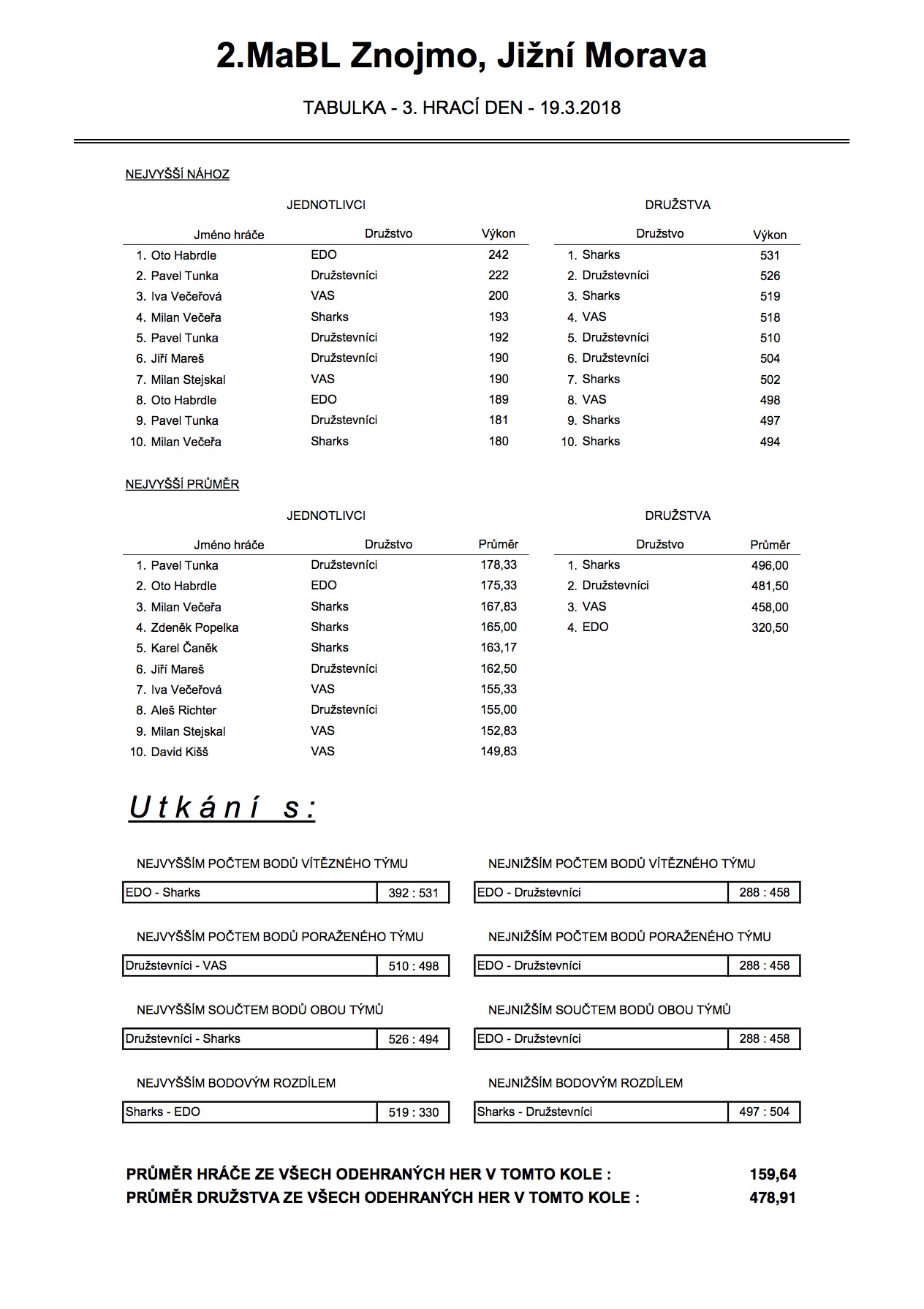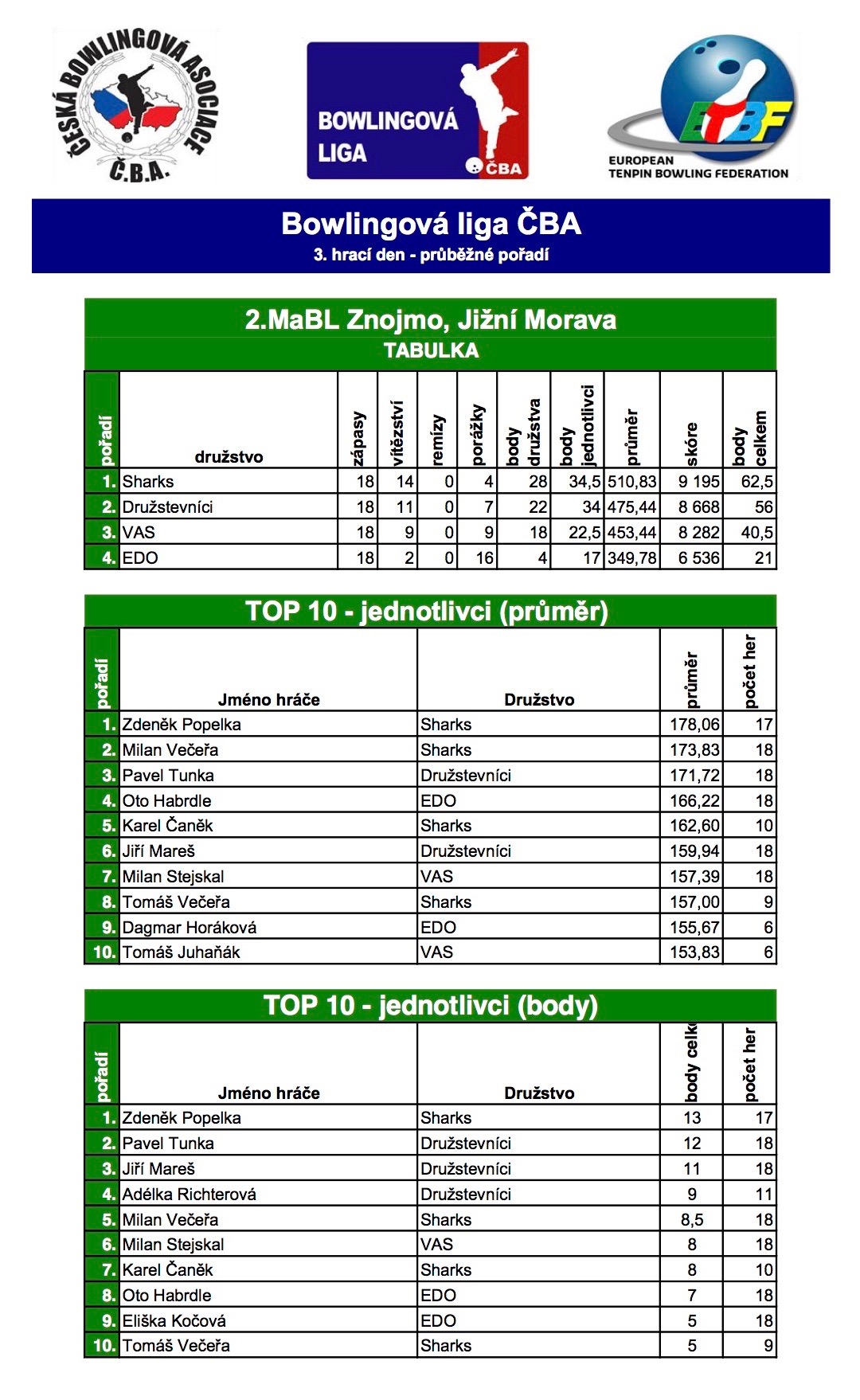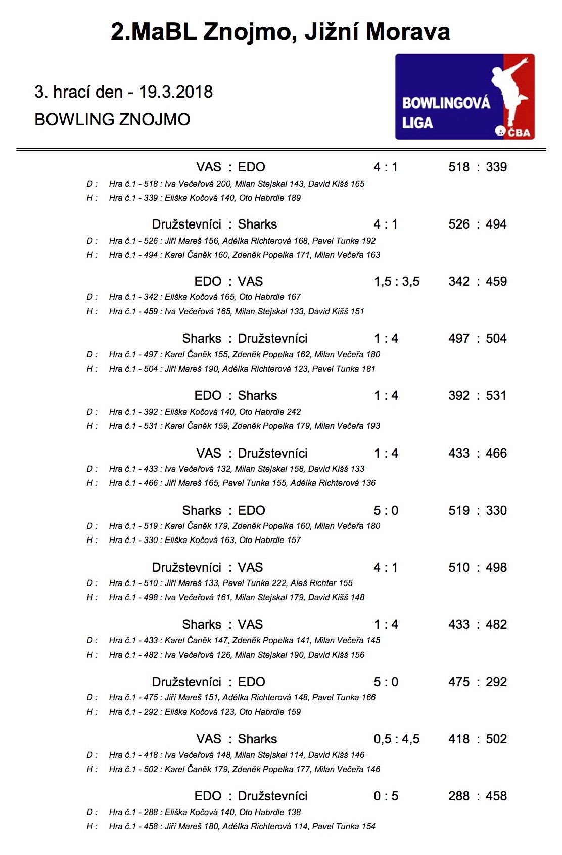 V pondělí 19.3.2018 zahájila družstva 2. Městské amatérské bowlingové ligy již třetí kolo jarní části ročníku 2017/2018. Výsledky naleznete jako vždy v článku.