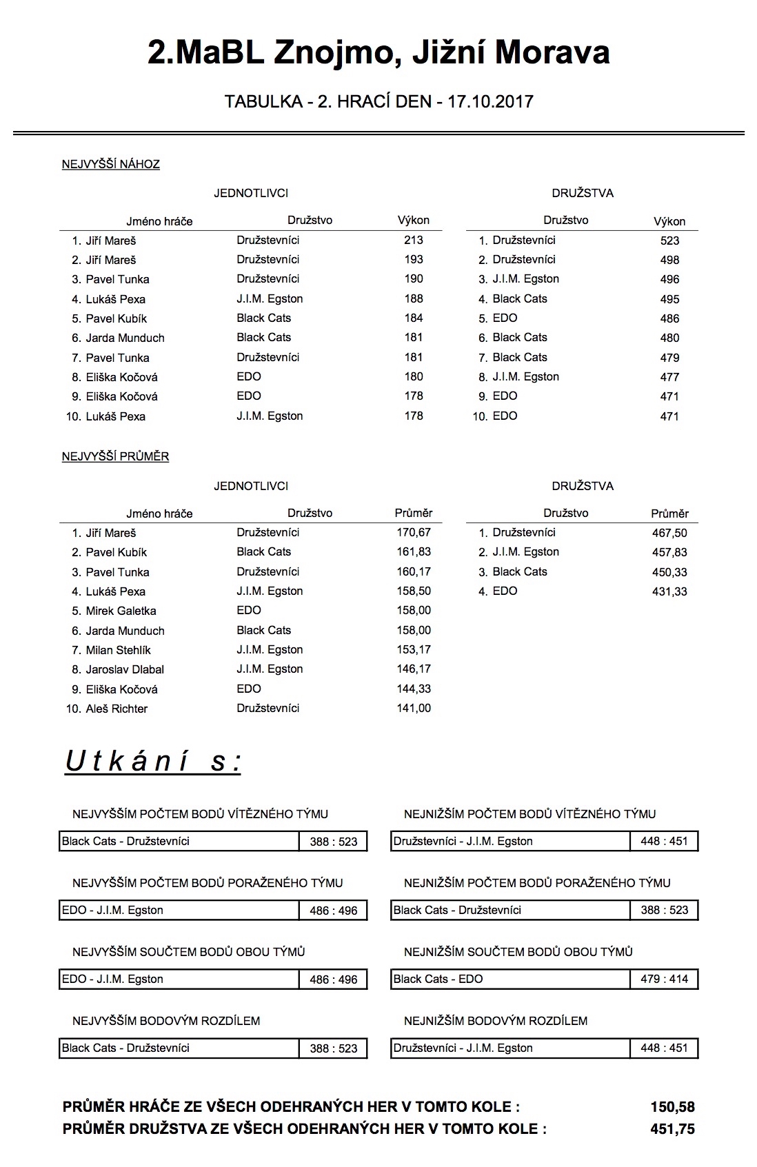 V úterý 17.10.2017 odehrála družstva 2. Městské amatérské bowlingové ligy další kolo ročníku 2017/2018. Výsledky naleznete jako vždy v článku.