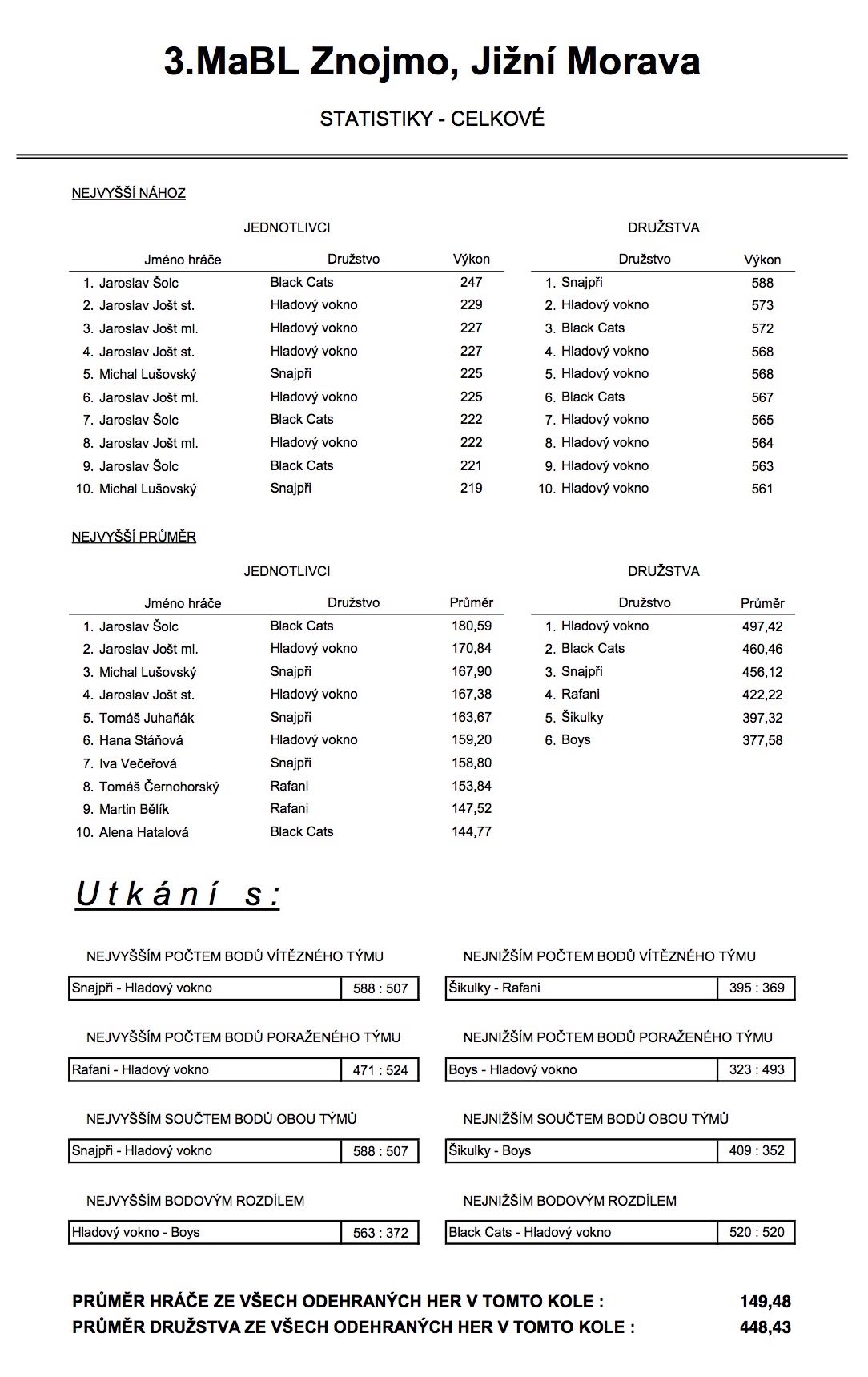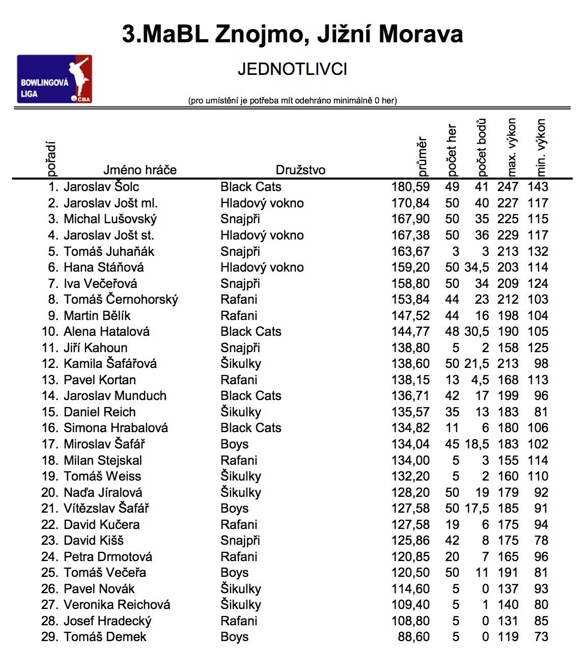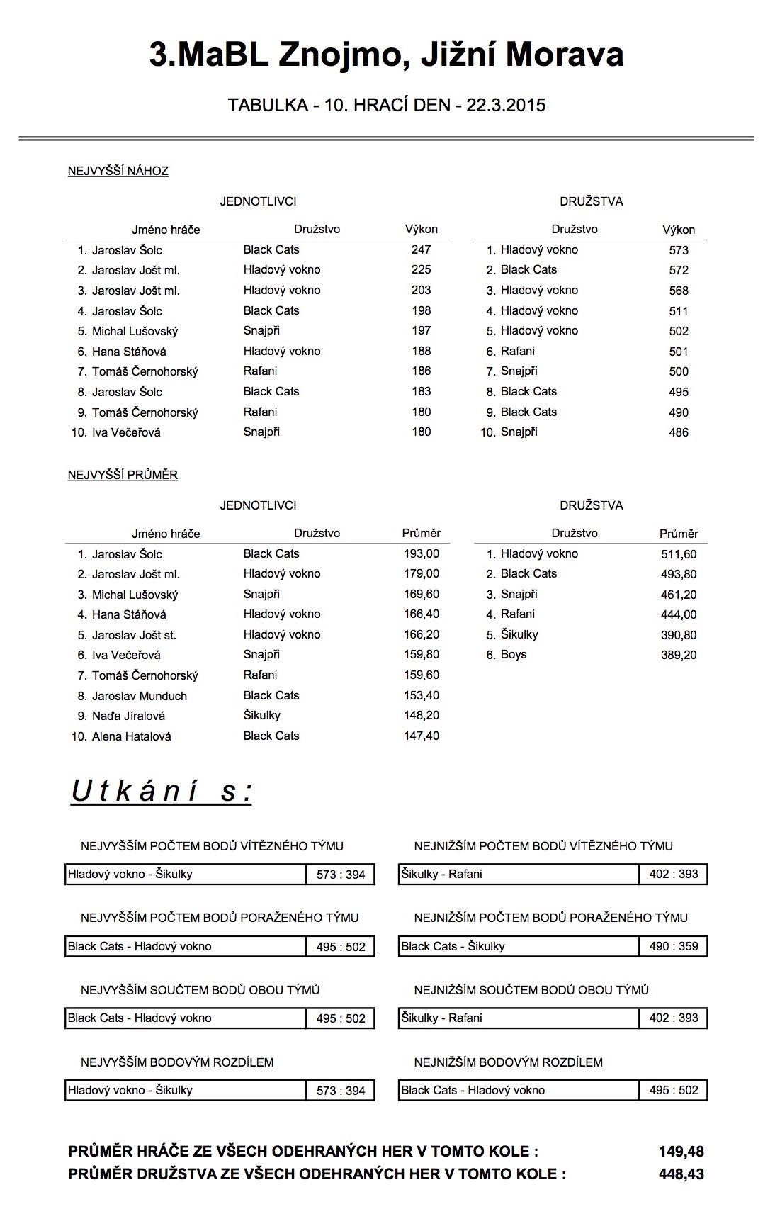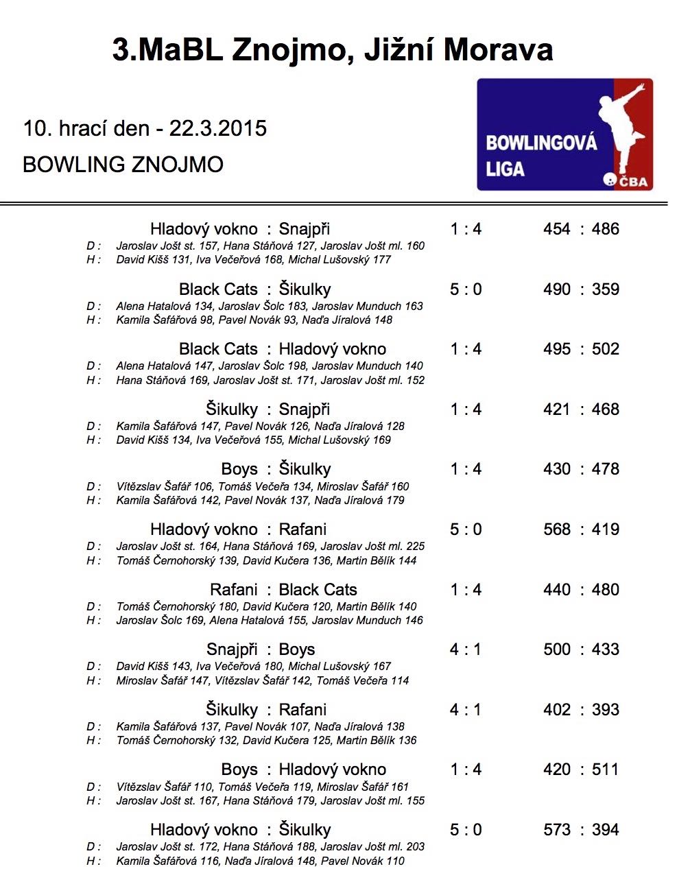 V neděli 22.3.2015 odehrála družstva 3. Městské amatérské bowlingové ligy desáté kolo ročníku 2014/2015 a přehoupla se tak do druhé poloviny jarní části. Do konce ročníku zbývají již jen 2 kola. Výsledky naleznete v článku.