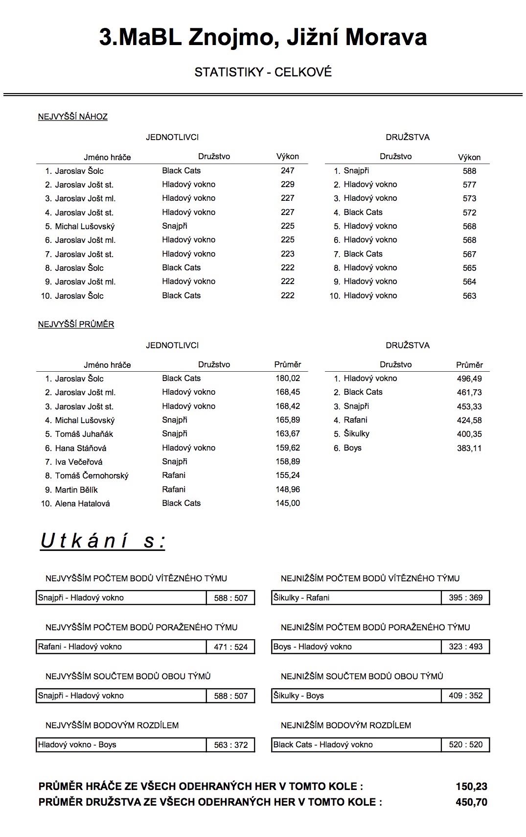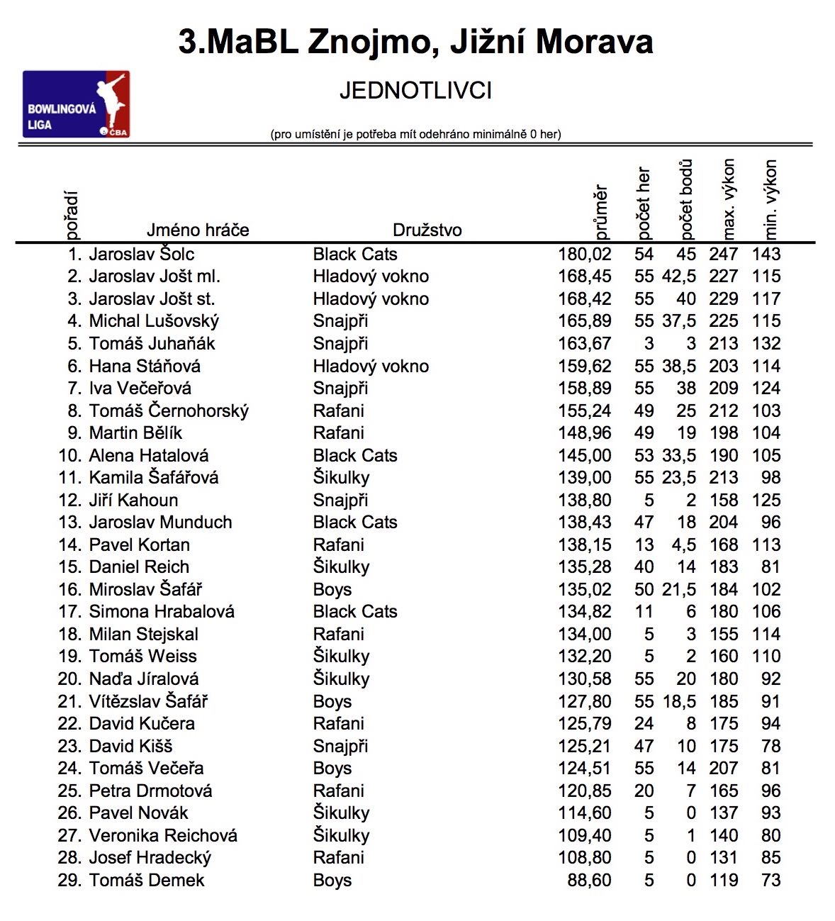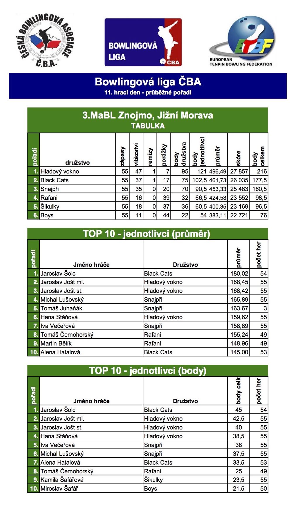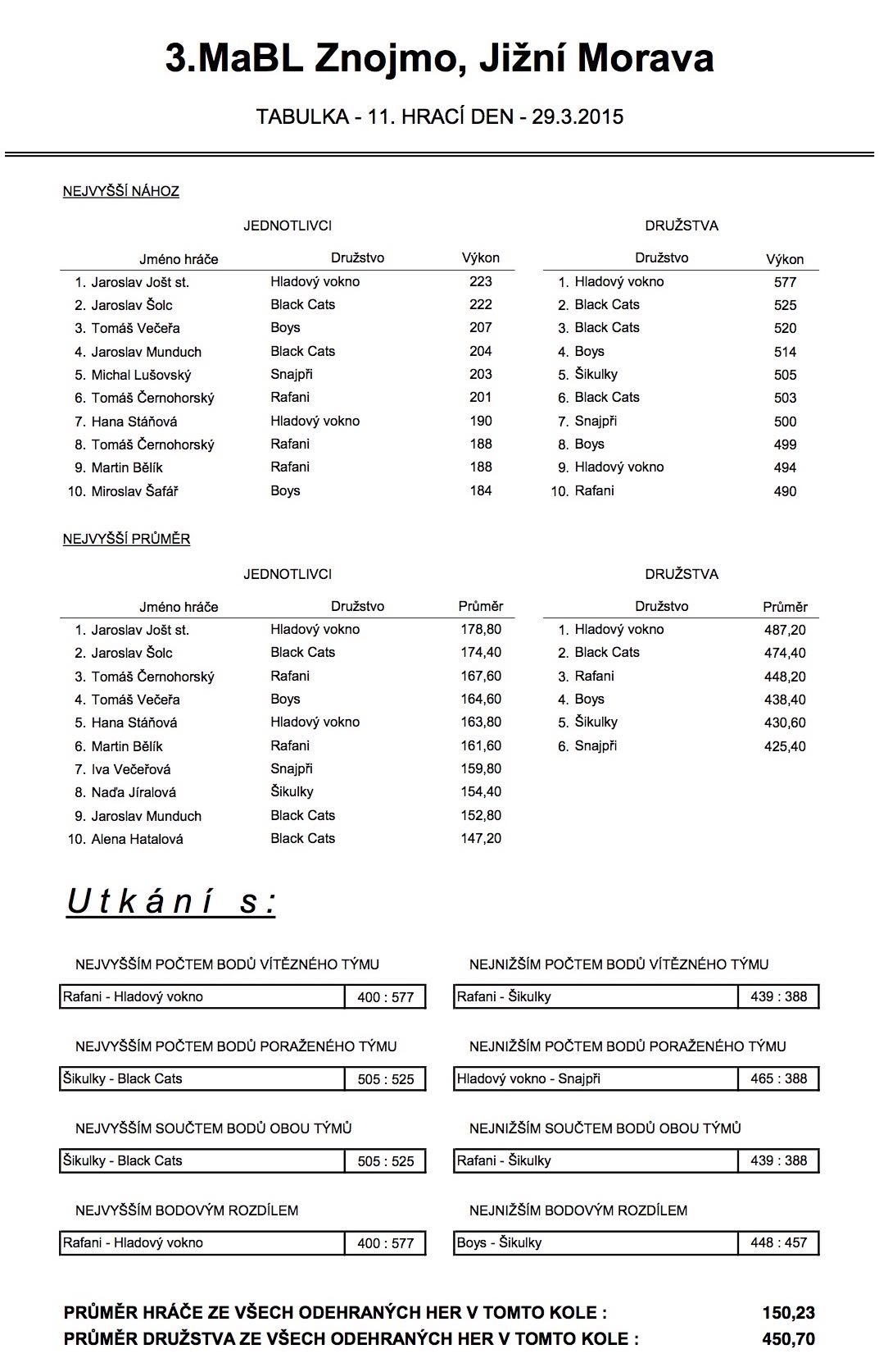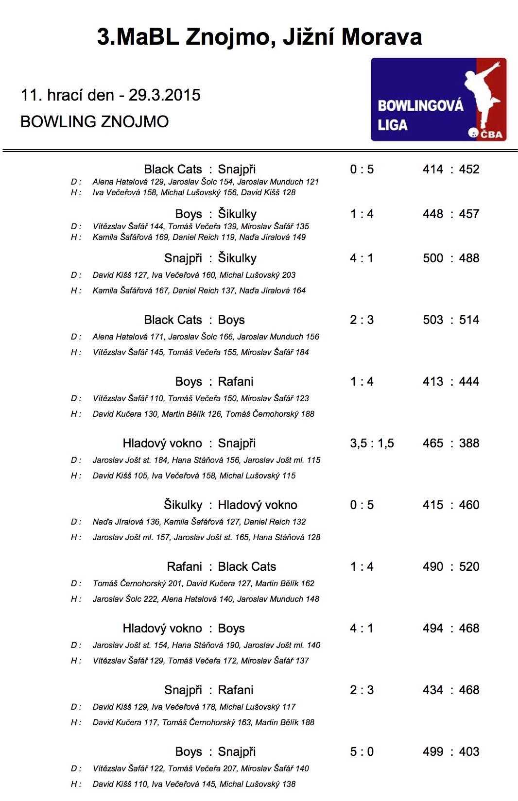 V neděli 29.3.2015 odehrála družstva 3. Městské amatérské bowlingové ligy jedenácté, předposlední kolo ročníku 2014/2015. Do konce ročníku zbývají již pouze finálové kolo. Výsledky naleznete v článku.