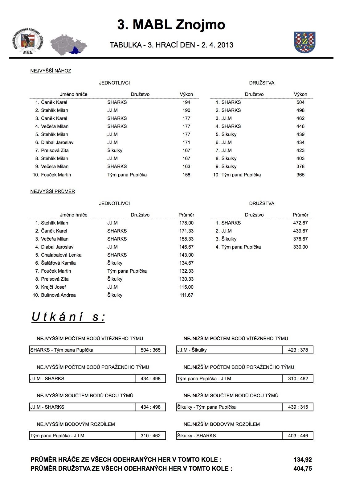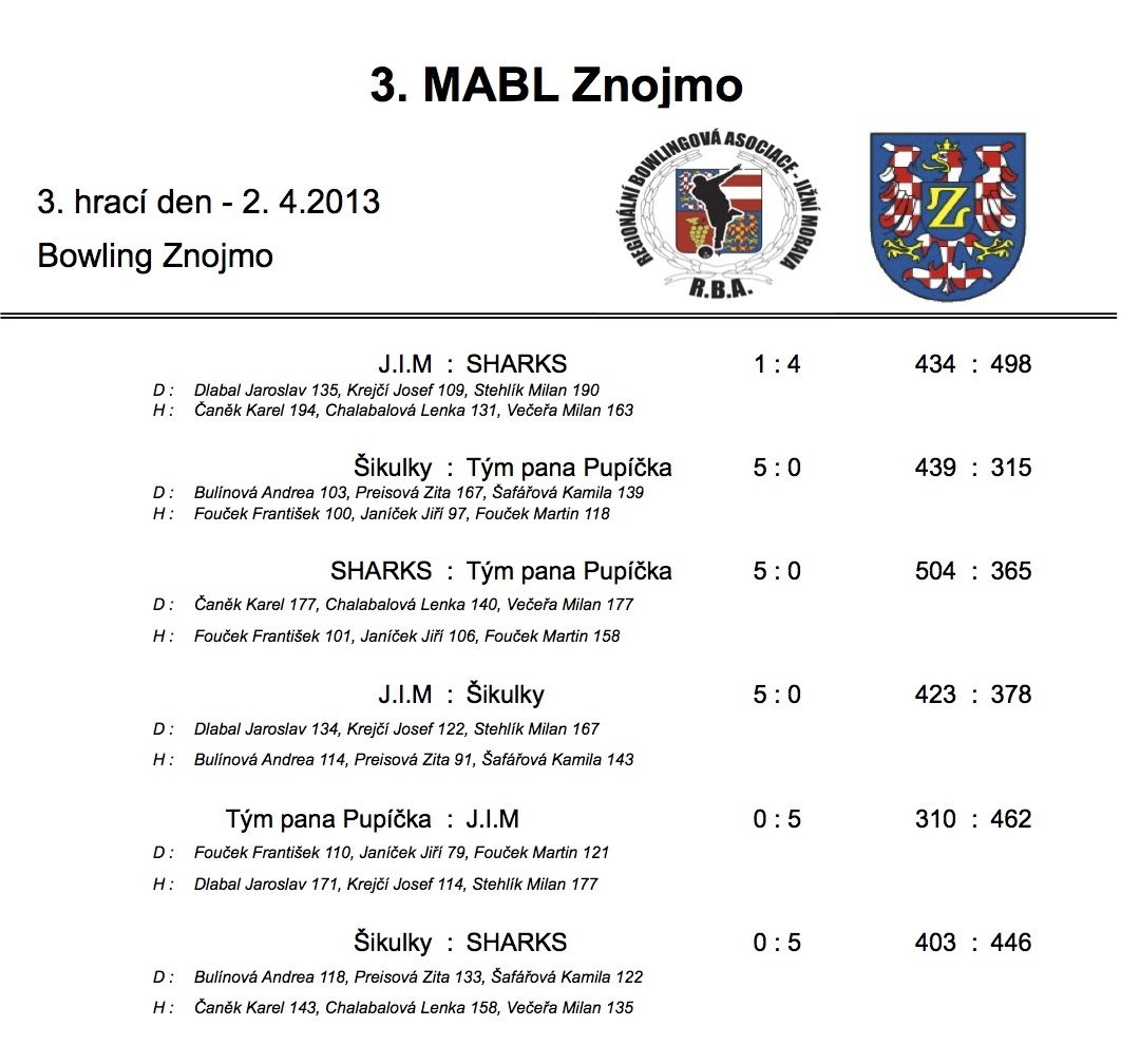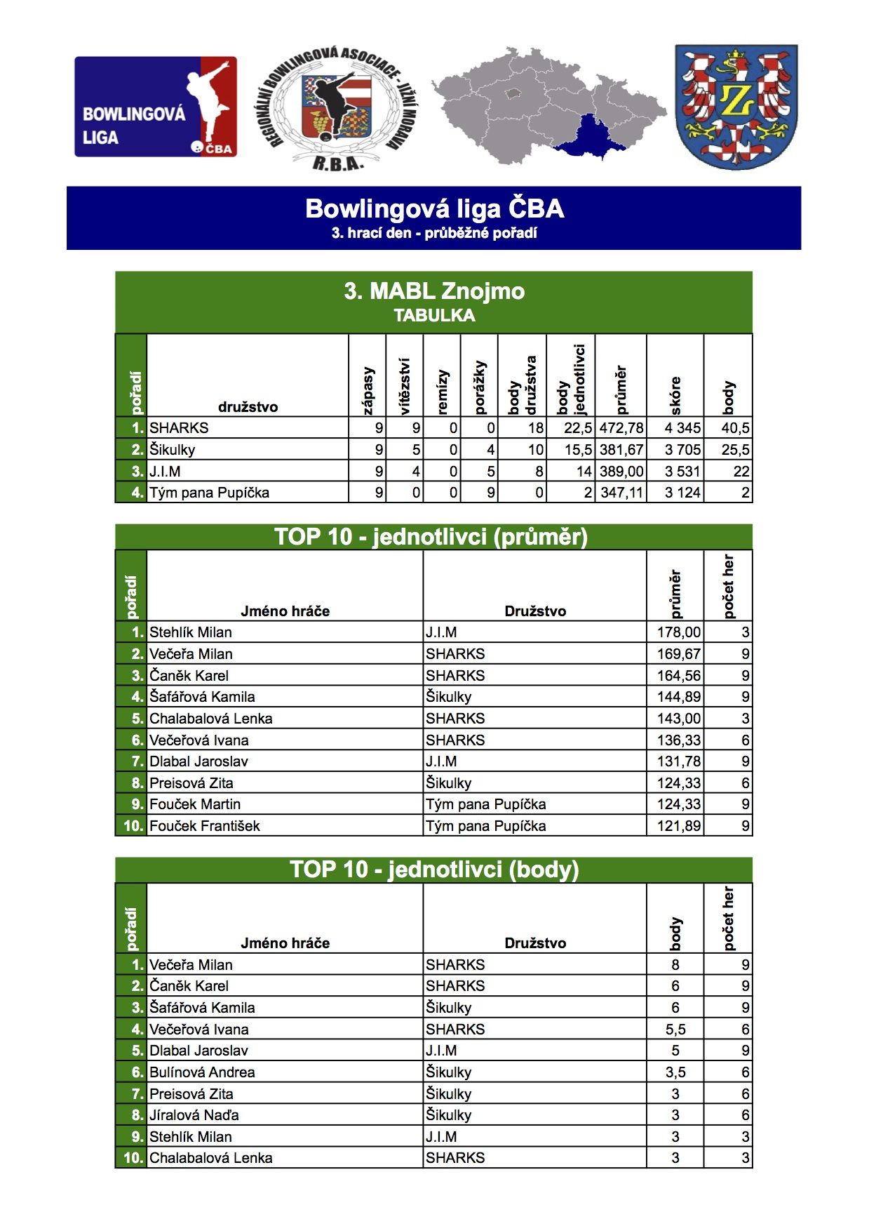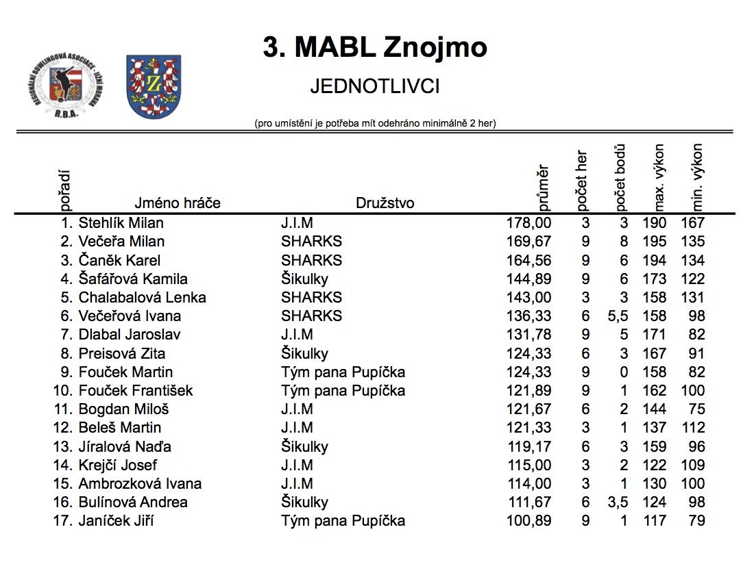 A je tu třetí kolo 3. MABL Znojmo. Technika trochu zklamala, tak výsledky přinášíme trochu opožděně, ale nakonec ano. A nyní již k výsledkům!