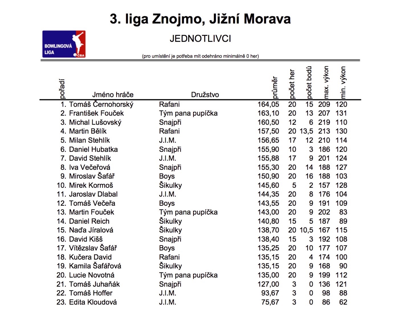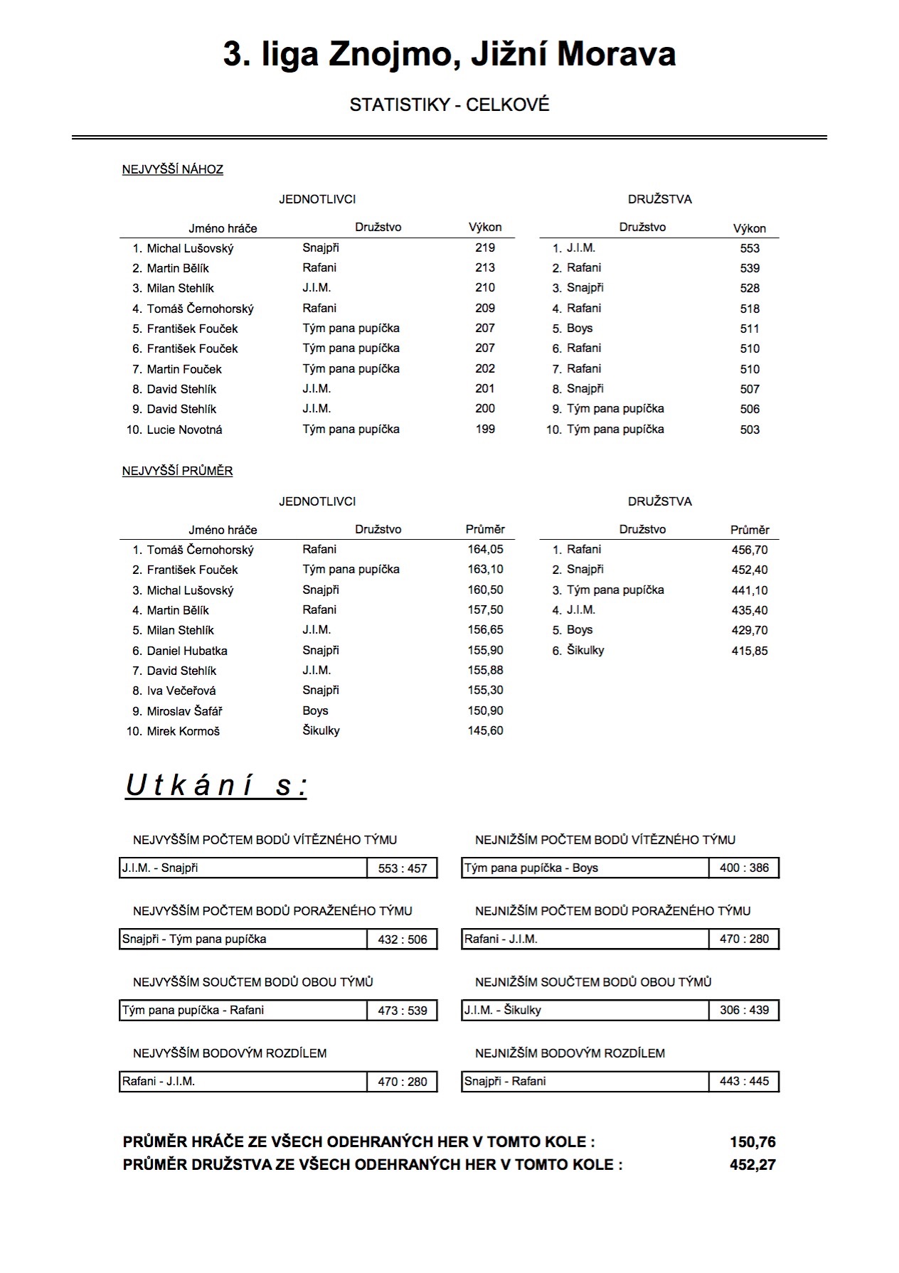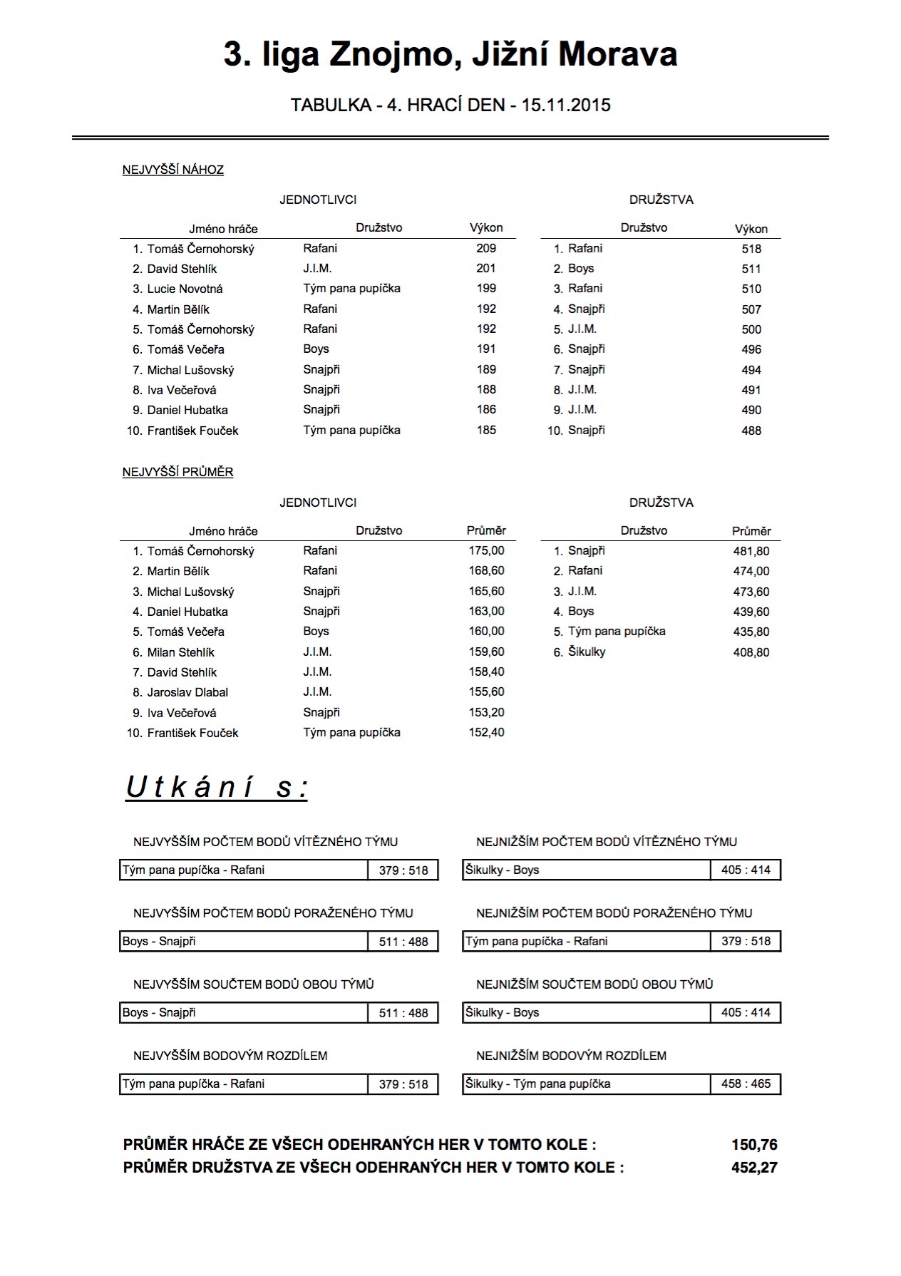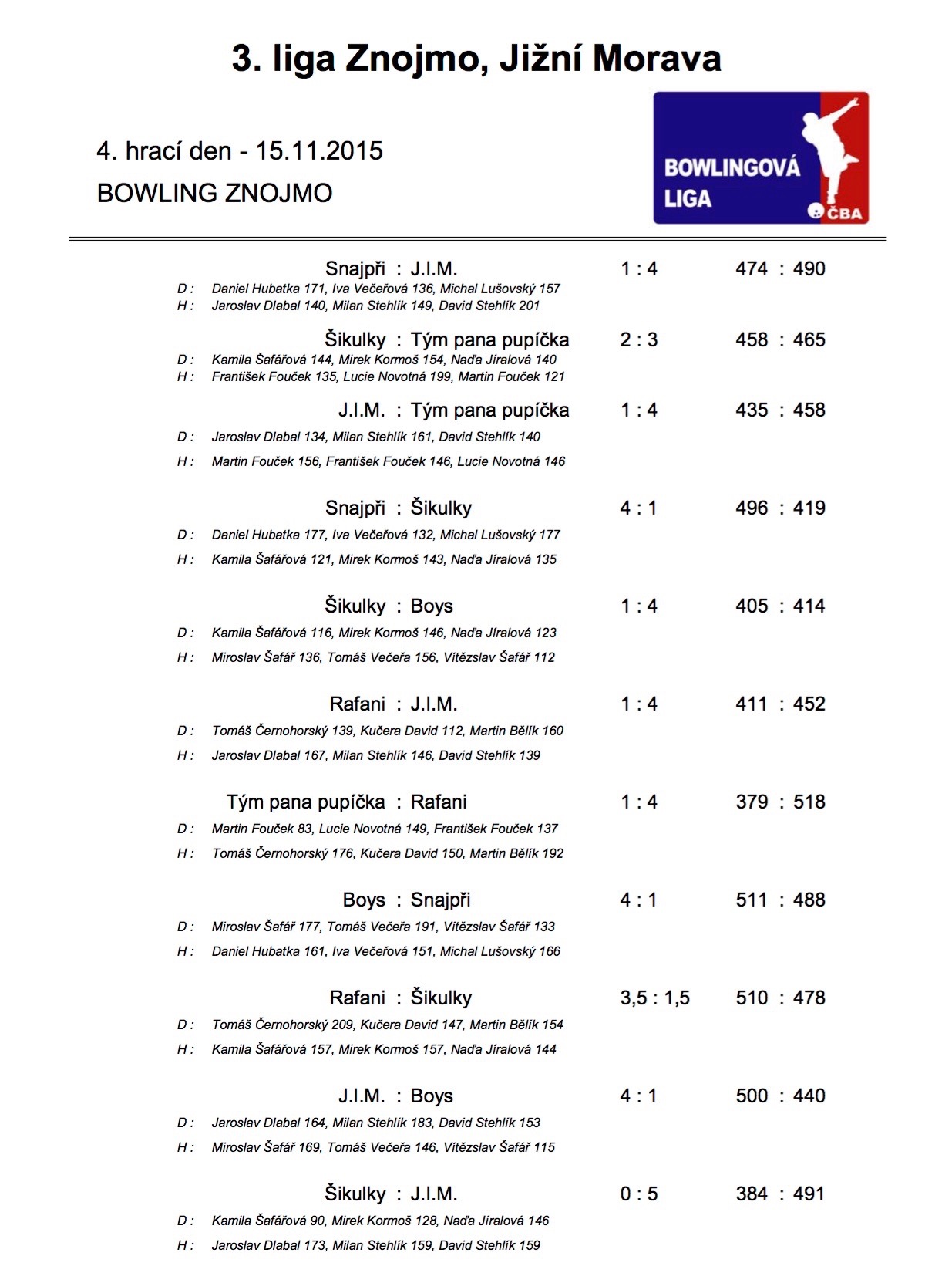 V neděli 15.11.2015 odehrála družstva třetí ligy již čtvrté kolo podzimní částo ročníku 2015/2016. Výsledky jako vždy naleznete dále.