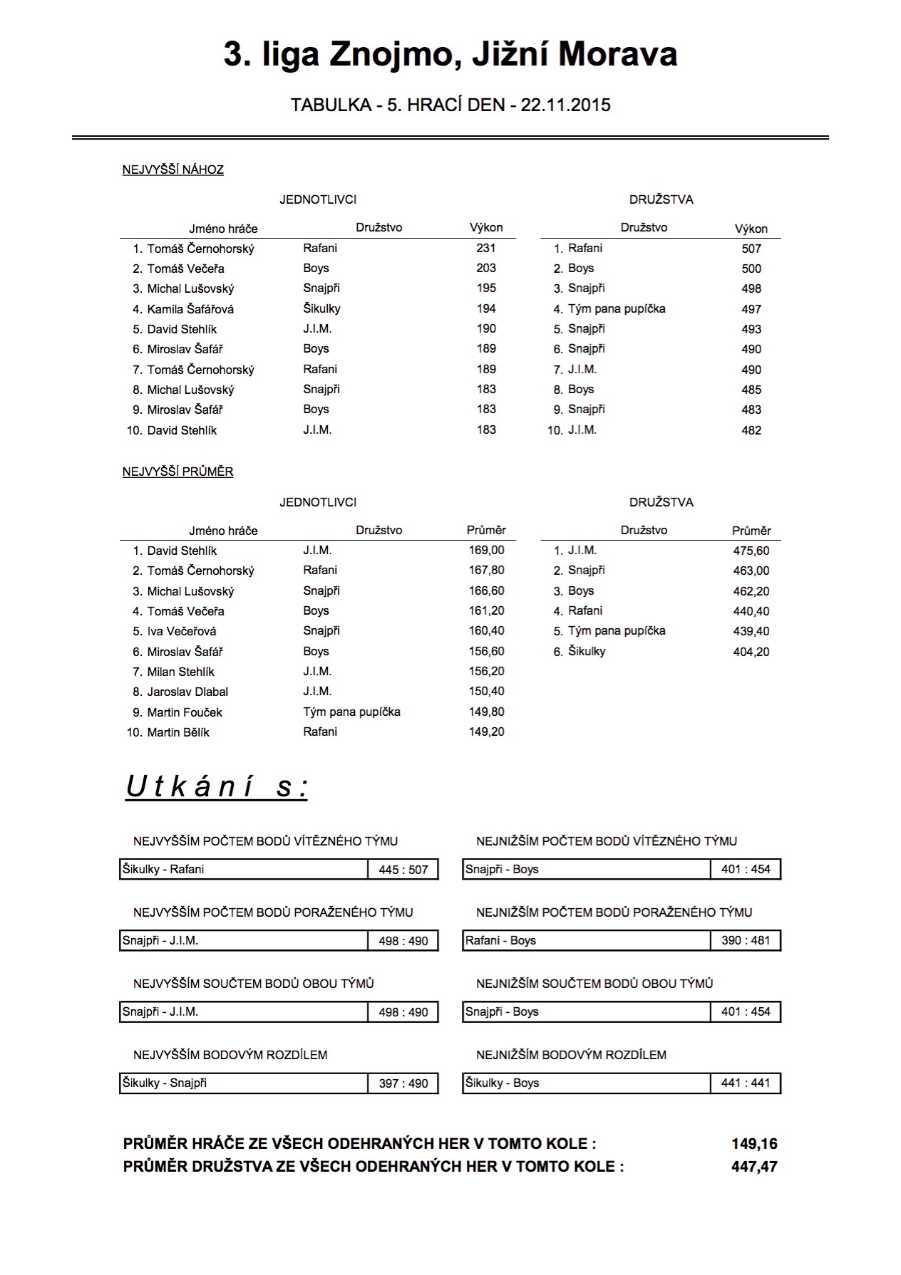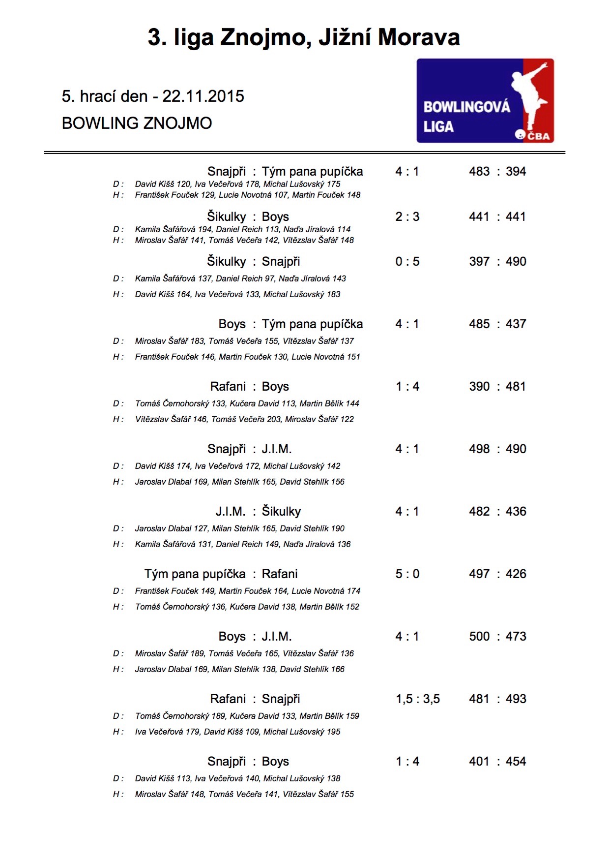 V neděli 22.11.2015 odehrála družstva třetí ligy předposlední, 5. kolo podzimní částo ročníku 2015/2016. Výsledky jako vždy naleznete dále.
