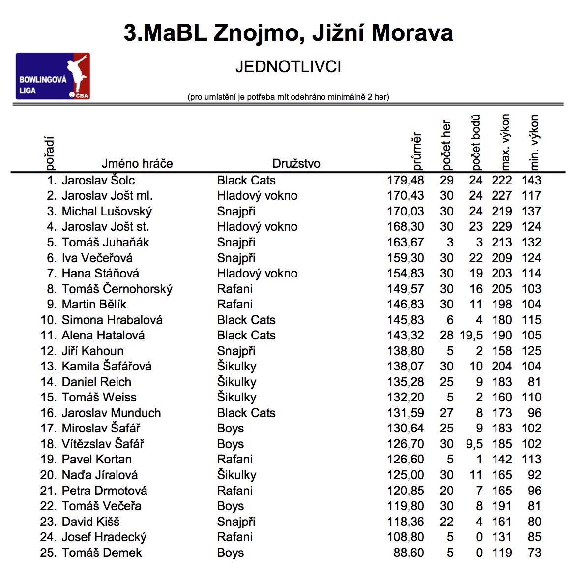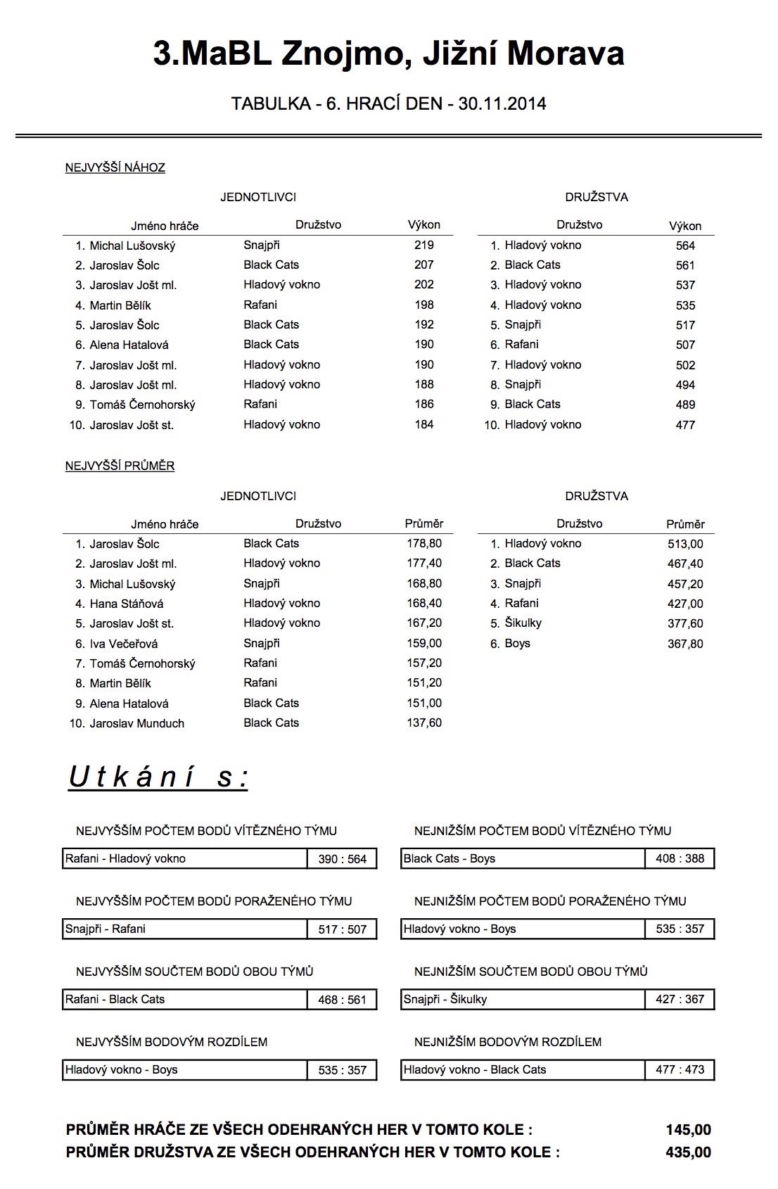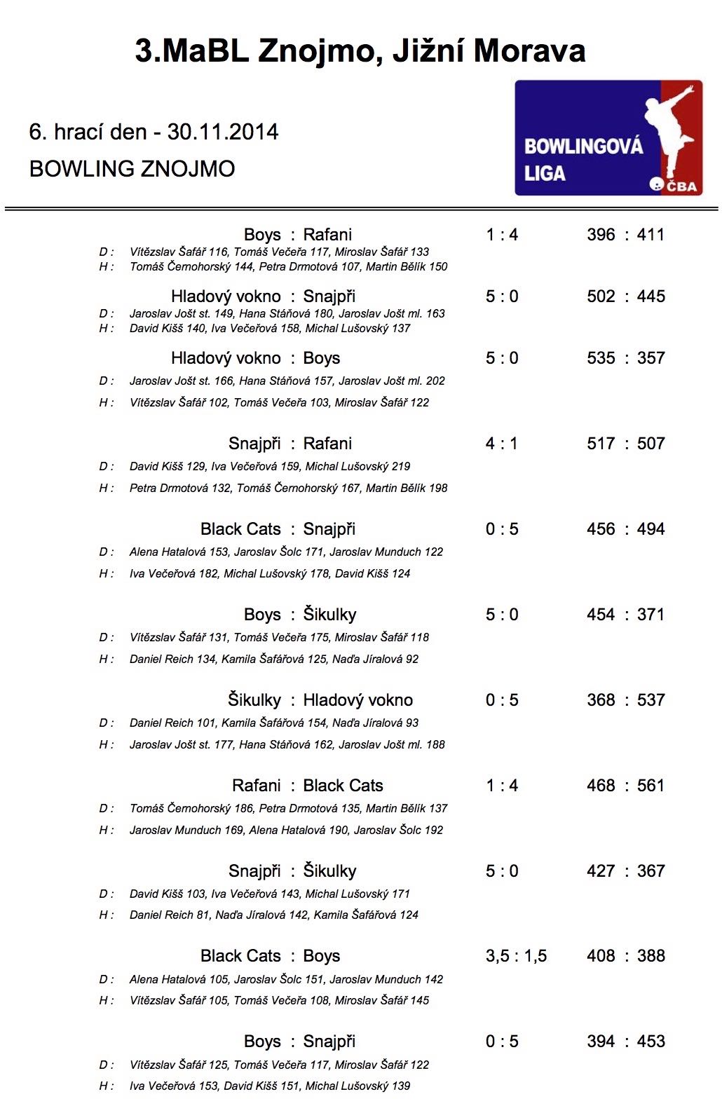 V neděli, 30.11.2014 odehrála družstva 3. Městské amatérské bowlingové ligy poslední, šesté kolo podzimní části. Po polovině celého ročníku je zřejmé, že o vítězi není zdaleka rozhodnuto a jarní část bude ještě hodně zajímavá. Výsledky posledního kola a celé podzimní části jsou níže.