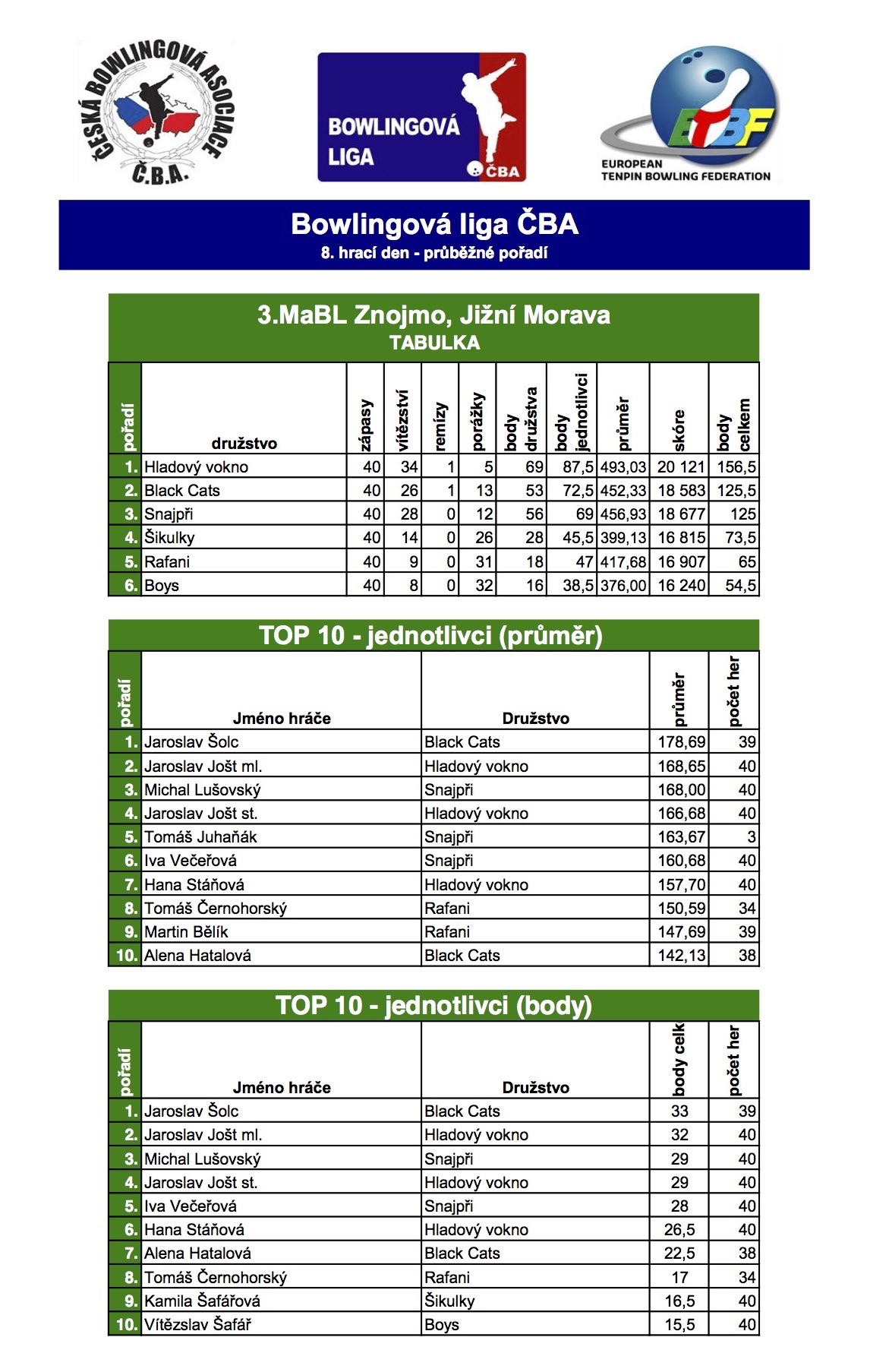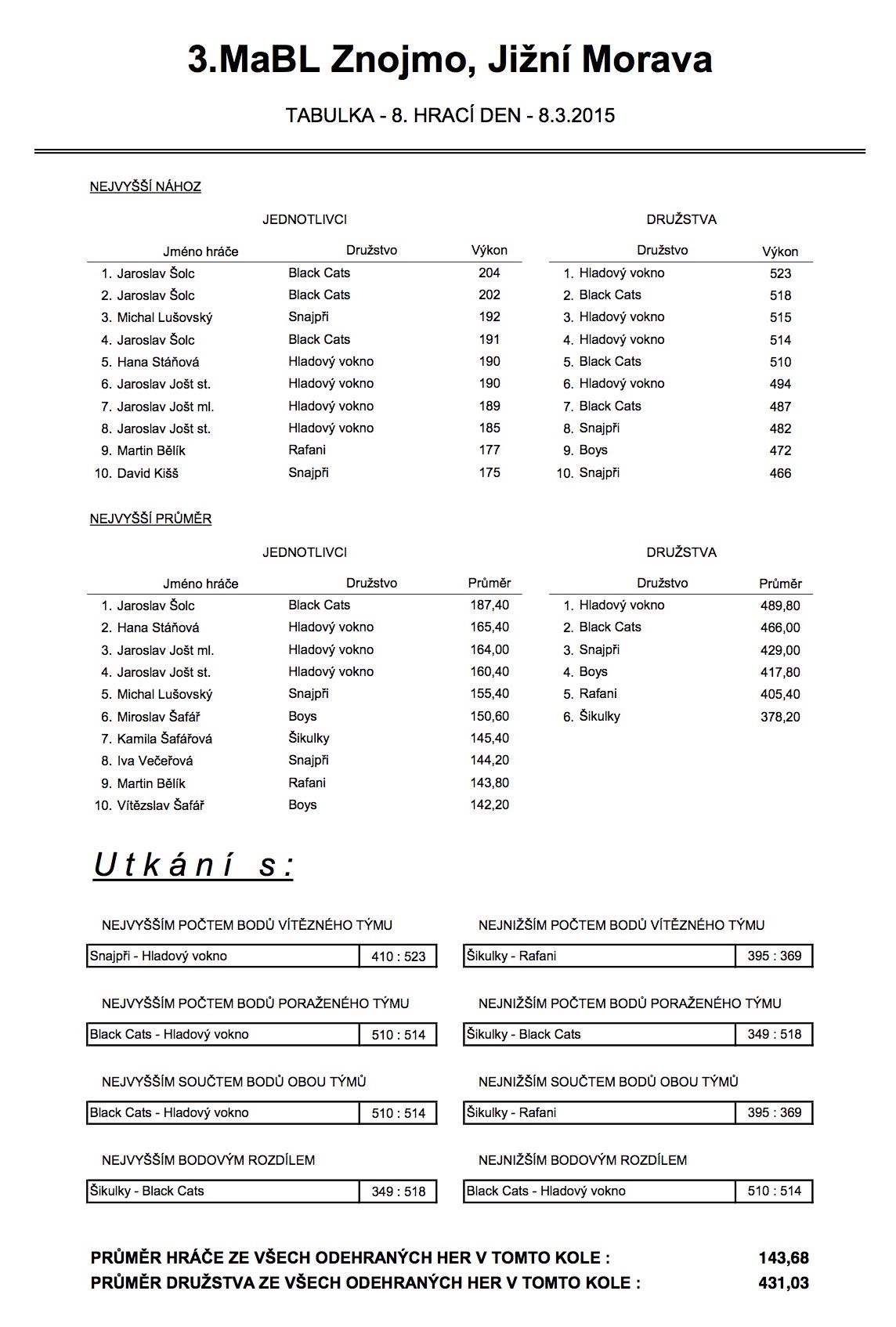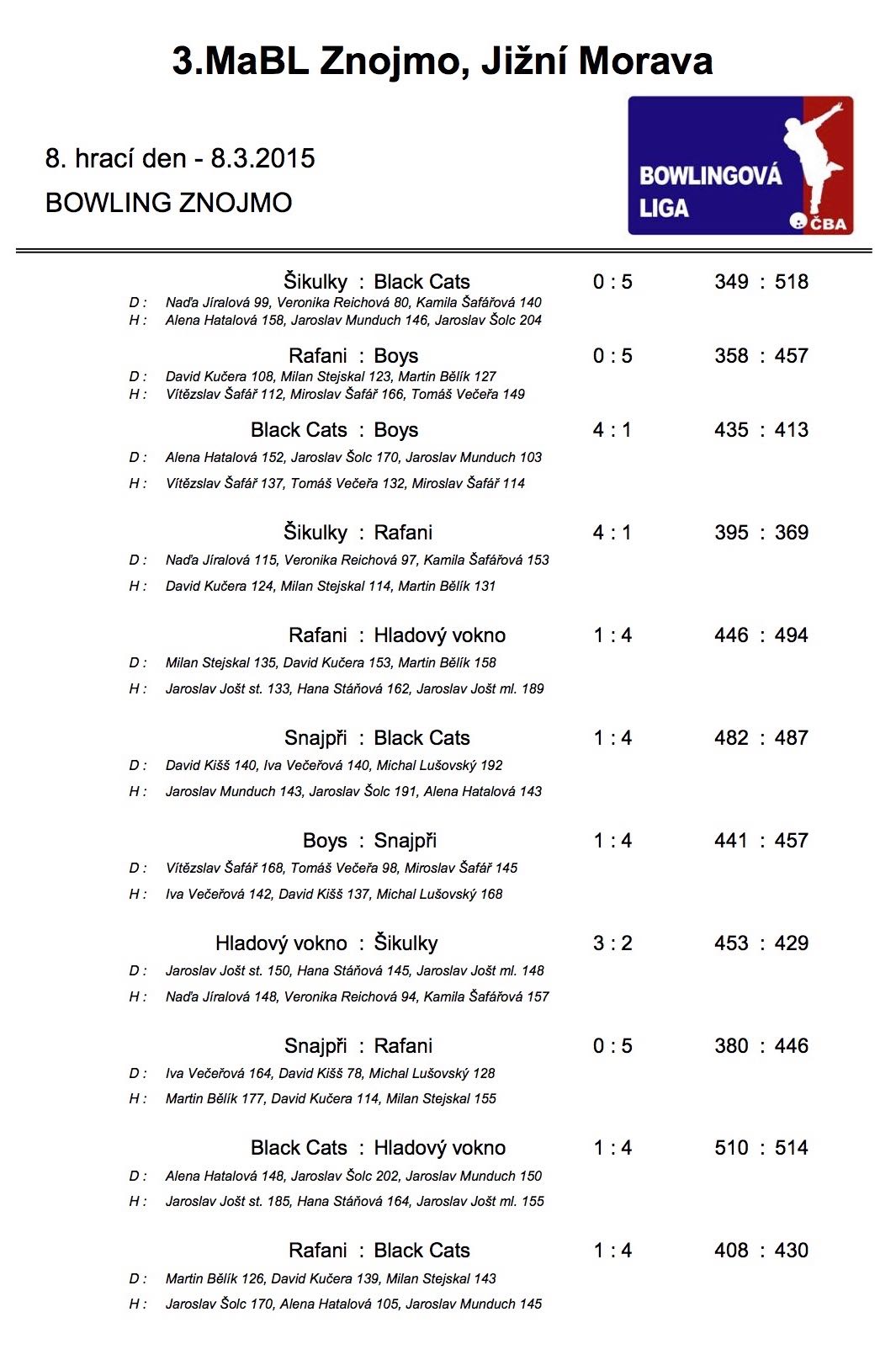 V neděli 8.3.2015 odehrála družstva 3. Městské amatérské bowlingové ligy osmé kolo ročníku 2014/2015. Výsledky naleznete v článku.
