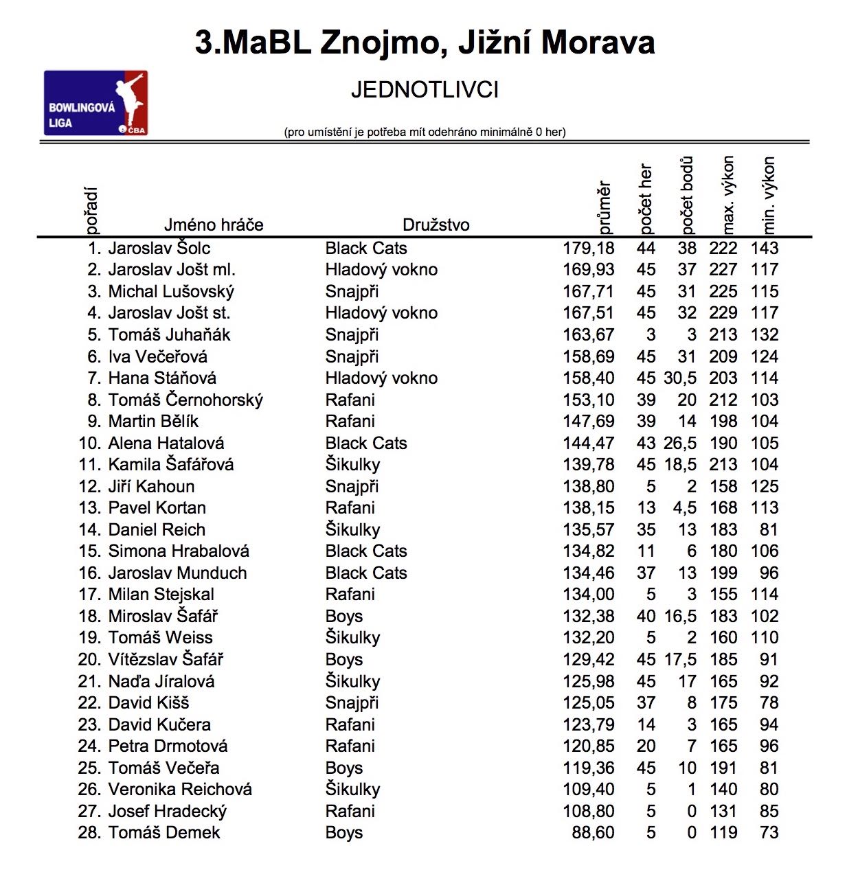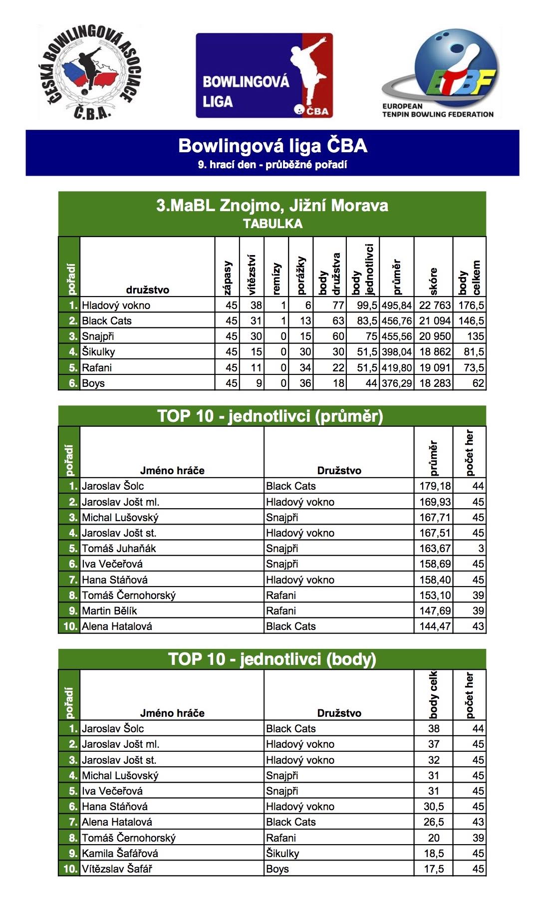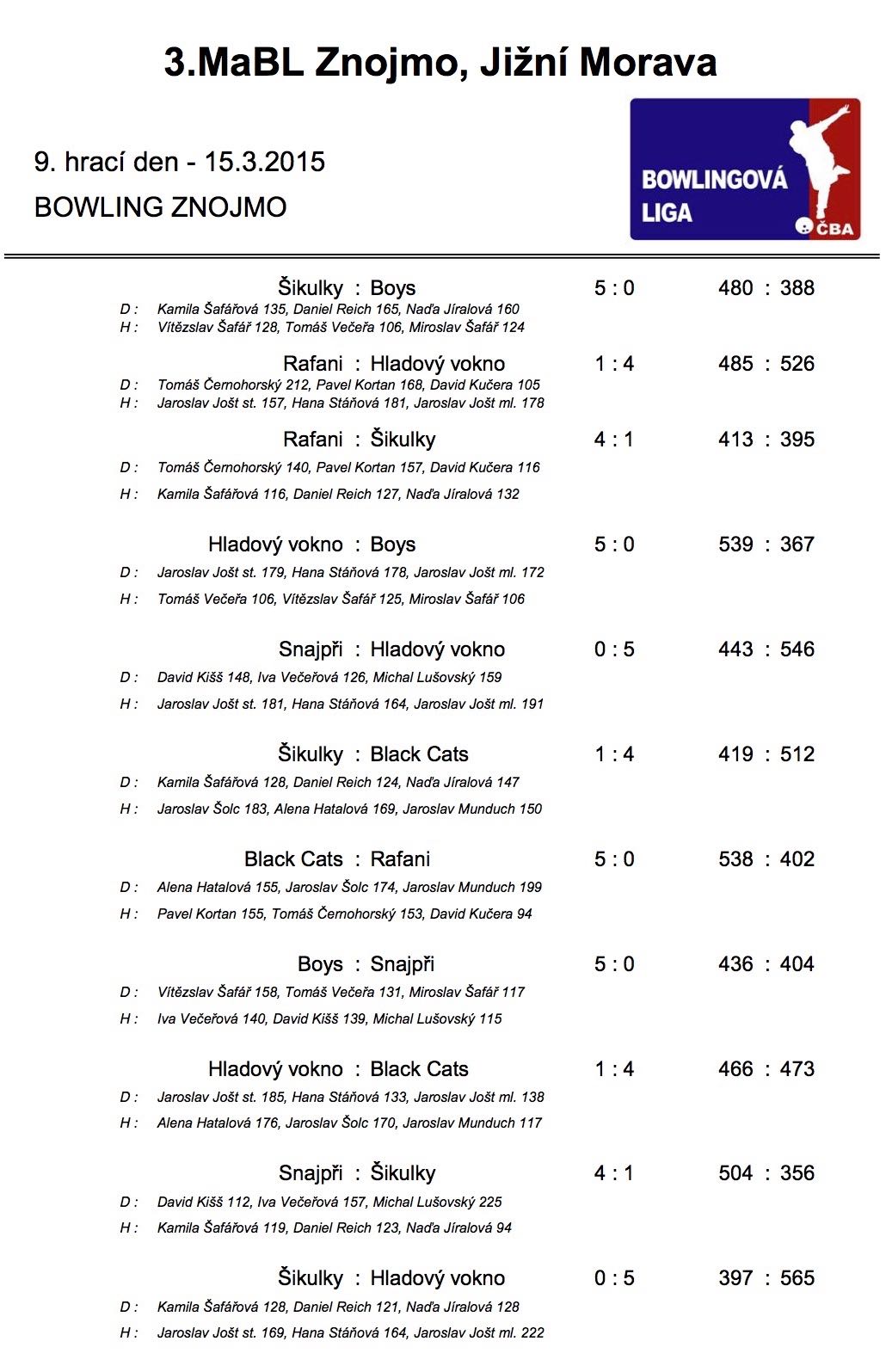 V neděli 15.3.2015 odehrála družstva 3. Městské amatérské bowlingové ligy deváté kolo ročníku 2014/2015. Výsledky naleznete v článku.