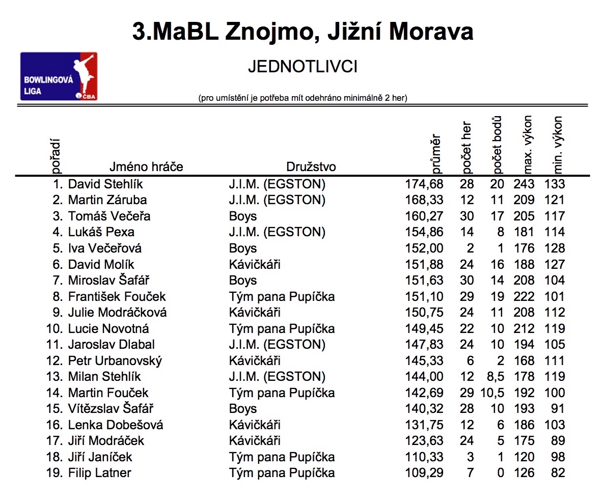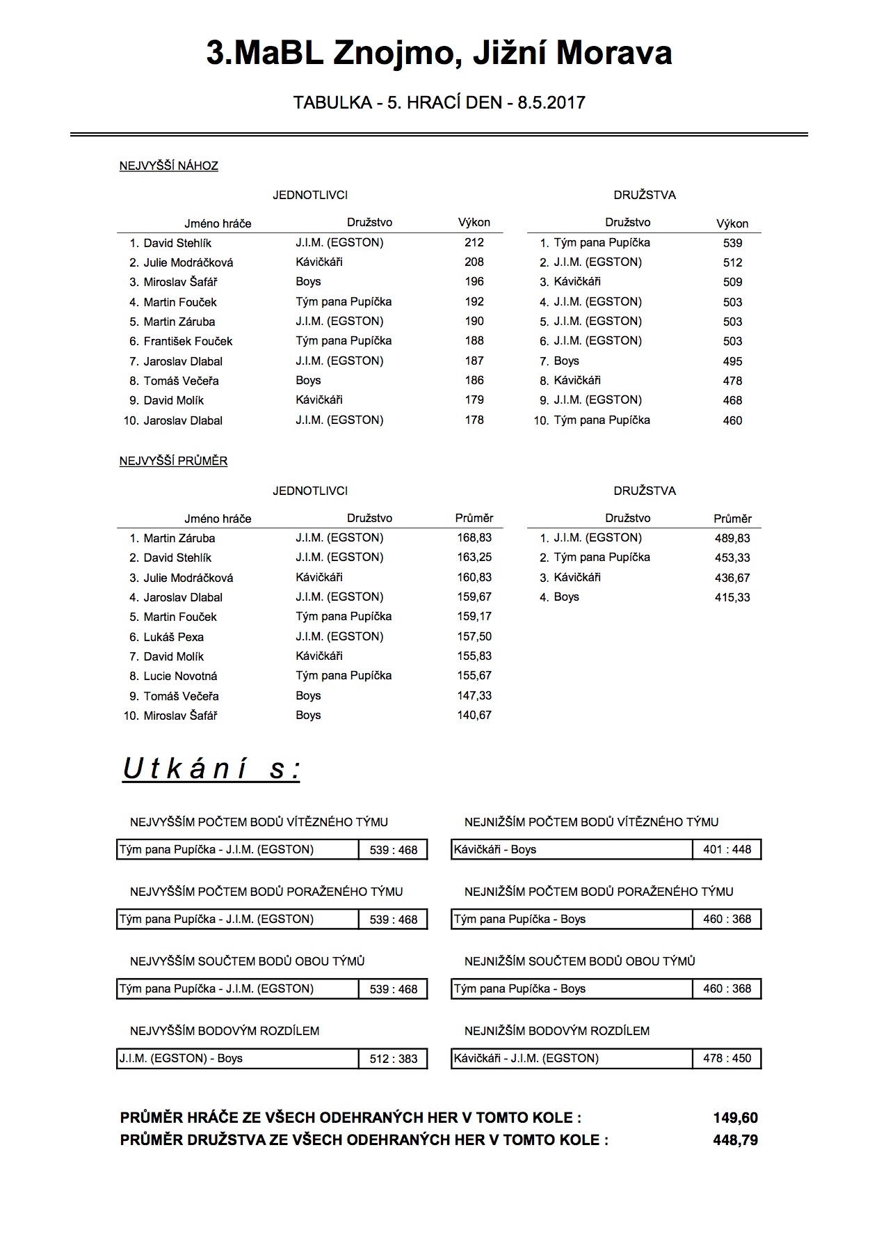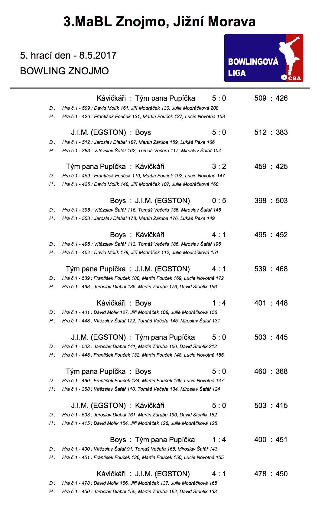 V pondělí 8.5.2017 již i družstva 3. Městské amatérské bowlingové ligy odehrála poslední kolo jarní části ročníku 2017 a tím byl uzavřen ročík 2016/2017. Výsledky naleznete jako vždy v článku.