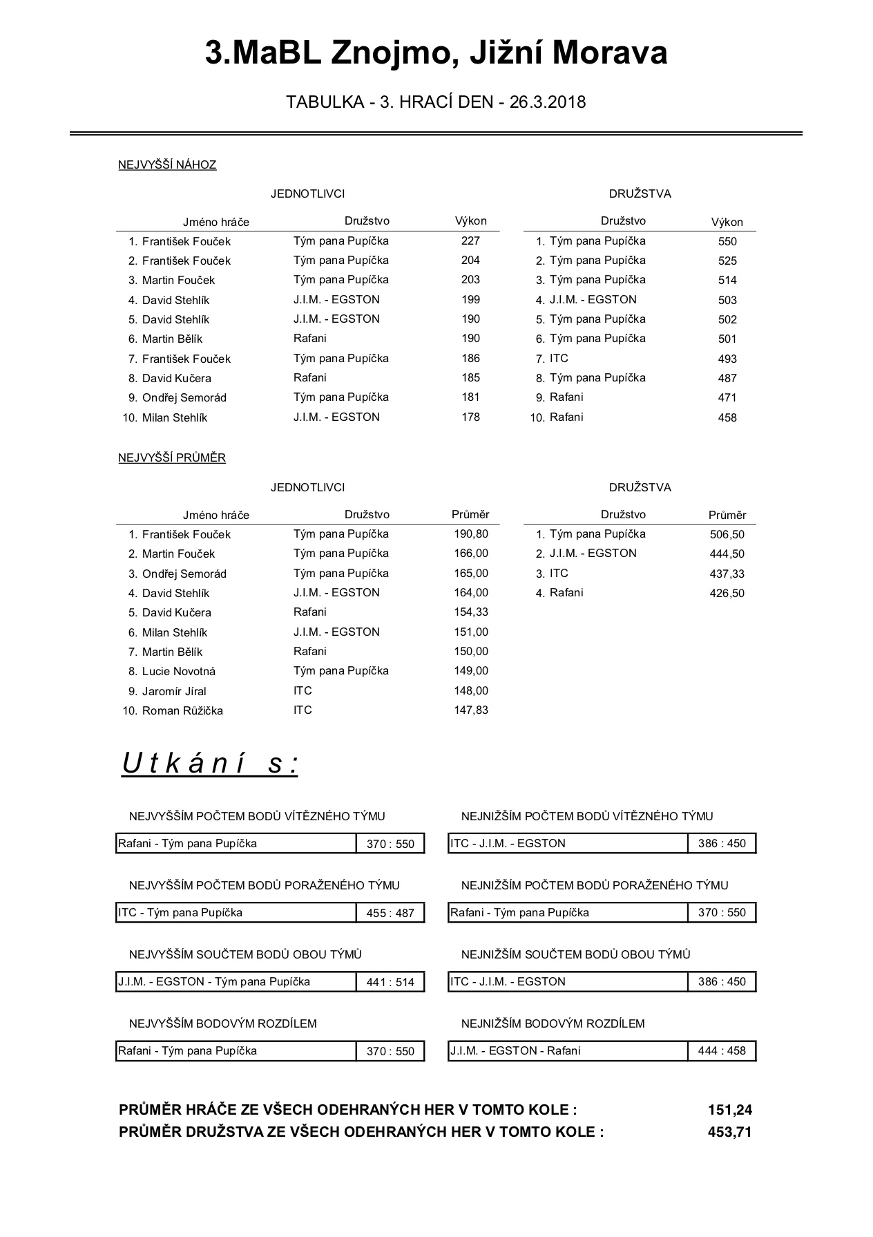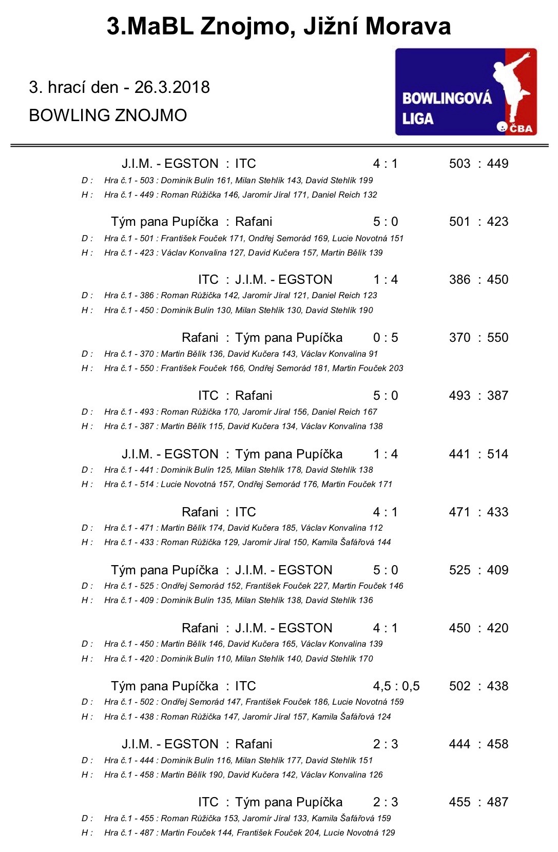 V pondělí 26.3.2018 zahájila družstva 3. Městské amatérské bowlingové ligy další kolo jarní části ročníku 2017/2018. Výsledky naleznete jako vždy v článku.