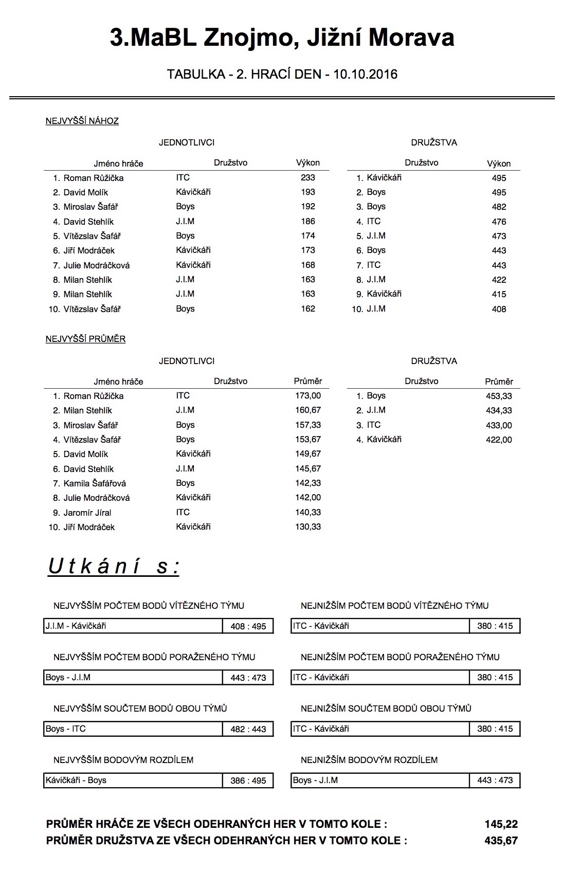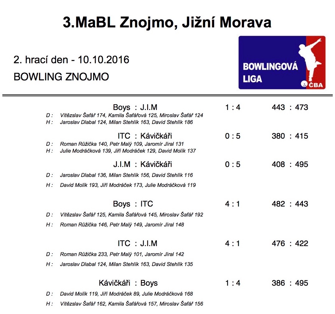 Vše jede jak po másle a v pondělí 10.10.2016 odehrála družstva 3. Městské amatérské bowlingové ligy další kolo poodzimní části ročníku 2016. Výsledky naleznete jako vždy v článku.
