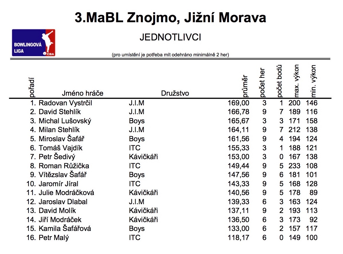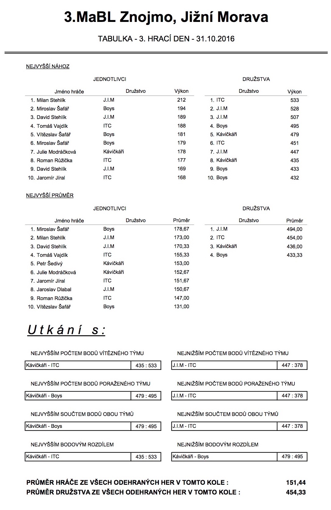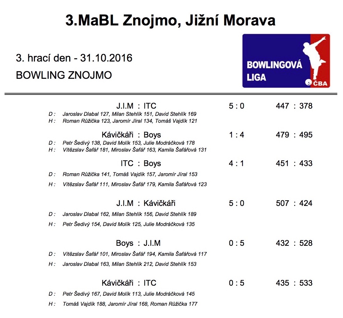 V pondělí 31.10.2016 odehrála družstva 3. Městské amatérské bowlingové ligy již třetí kolo poodzimní části ročníku 2016. Výsledky naleznete jako vždy v článku.