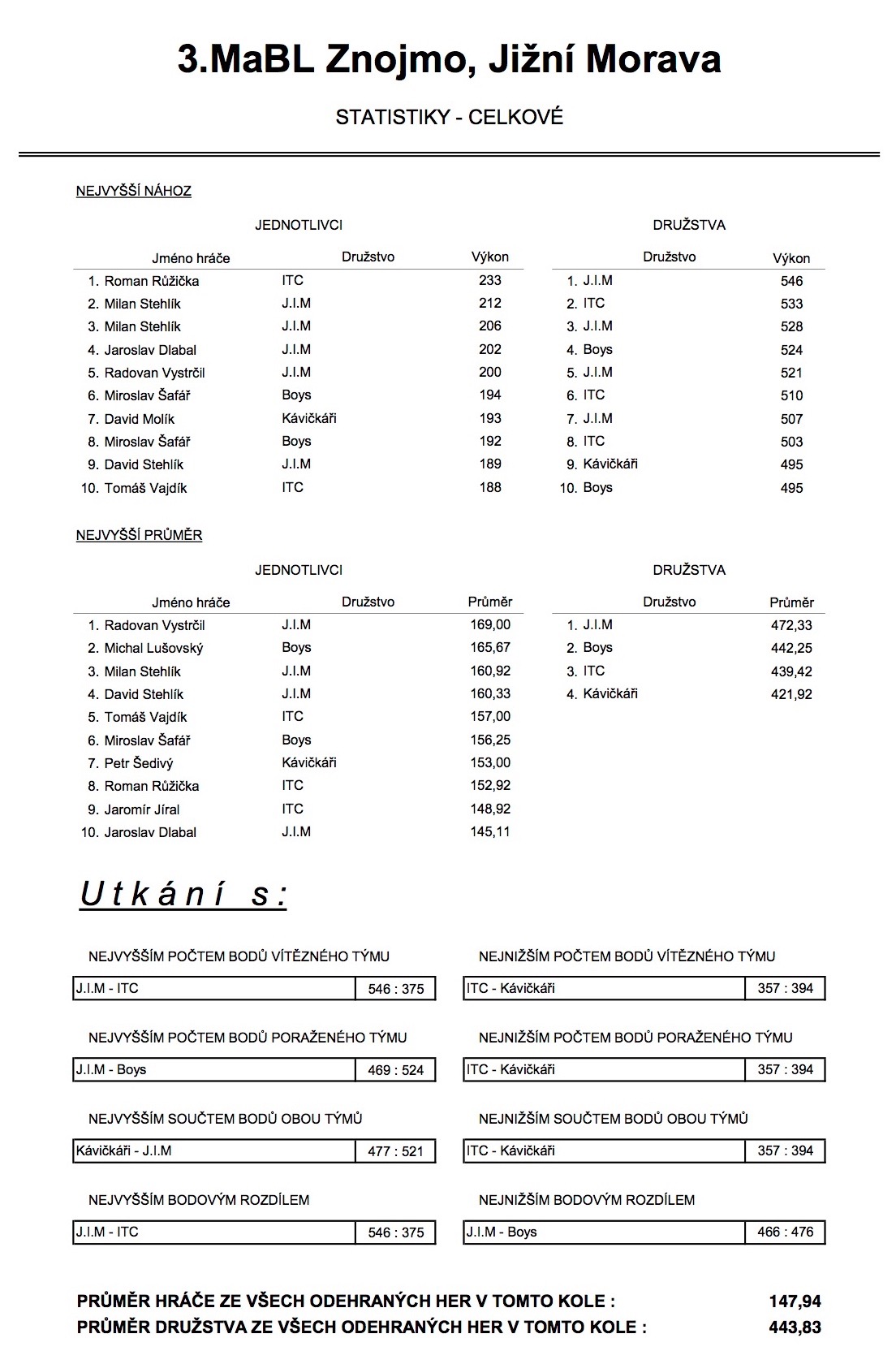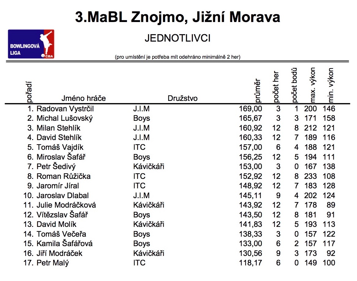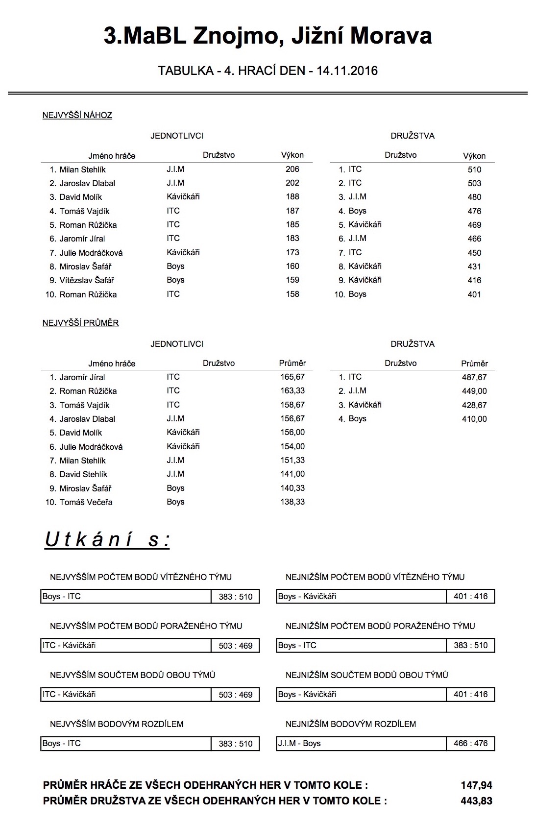 V pondělí 14.11.2016 odehrála družstva 3. Městské amatérské bowlingové ligy čtvrté kolo poodzimní části ročníku 2016. Výsledky naleznete jako vždy v článku.