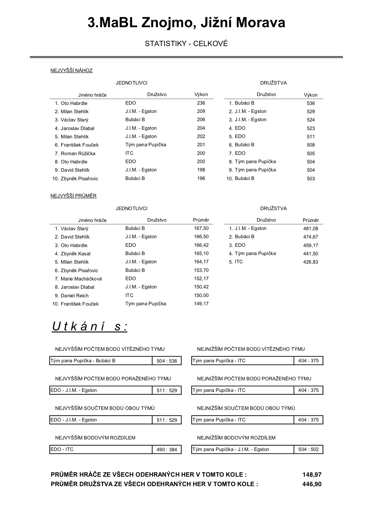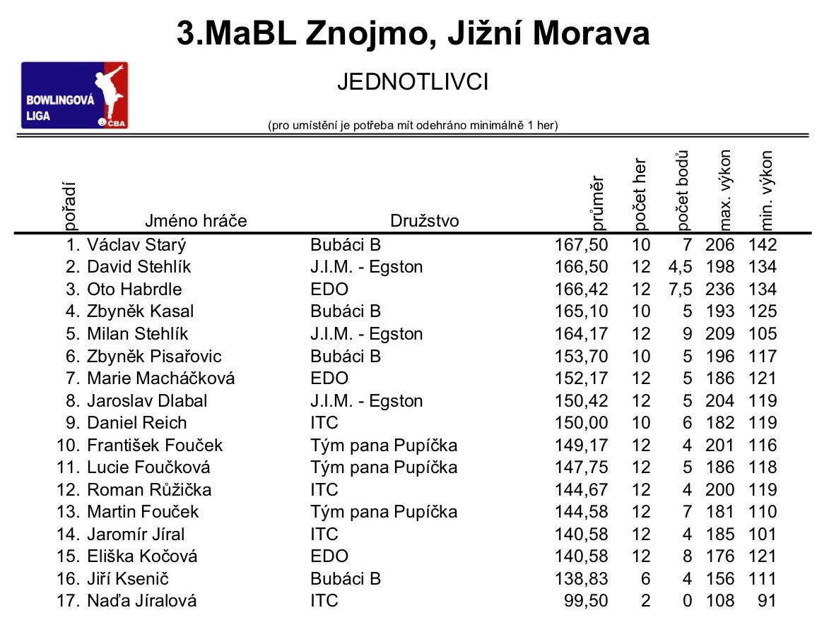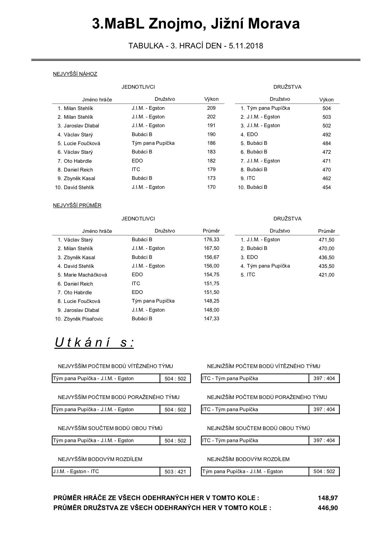 V pondělí 5.listopadu odehrála družstva 3. Městské amatérské bowlingové ligy třetí kolo ročníku 2018/2019. Jeho výsledky naleznete v článku.