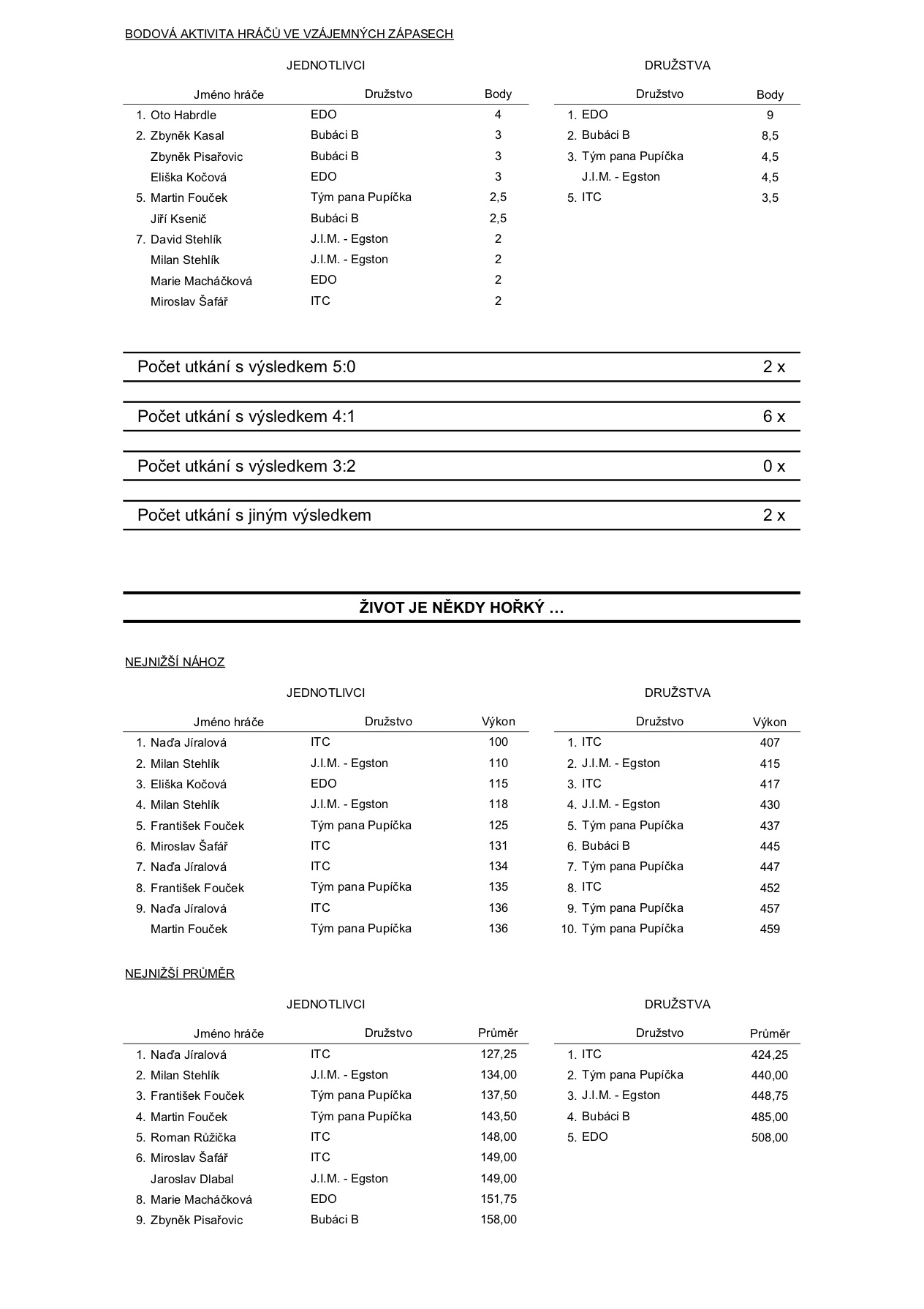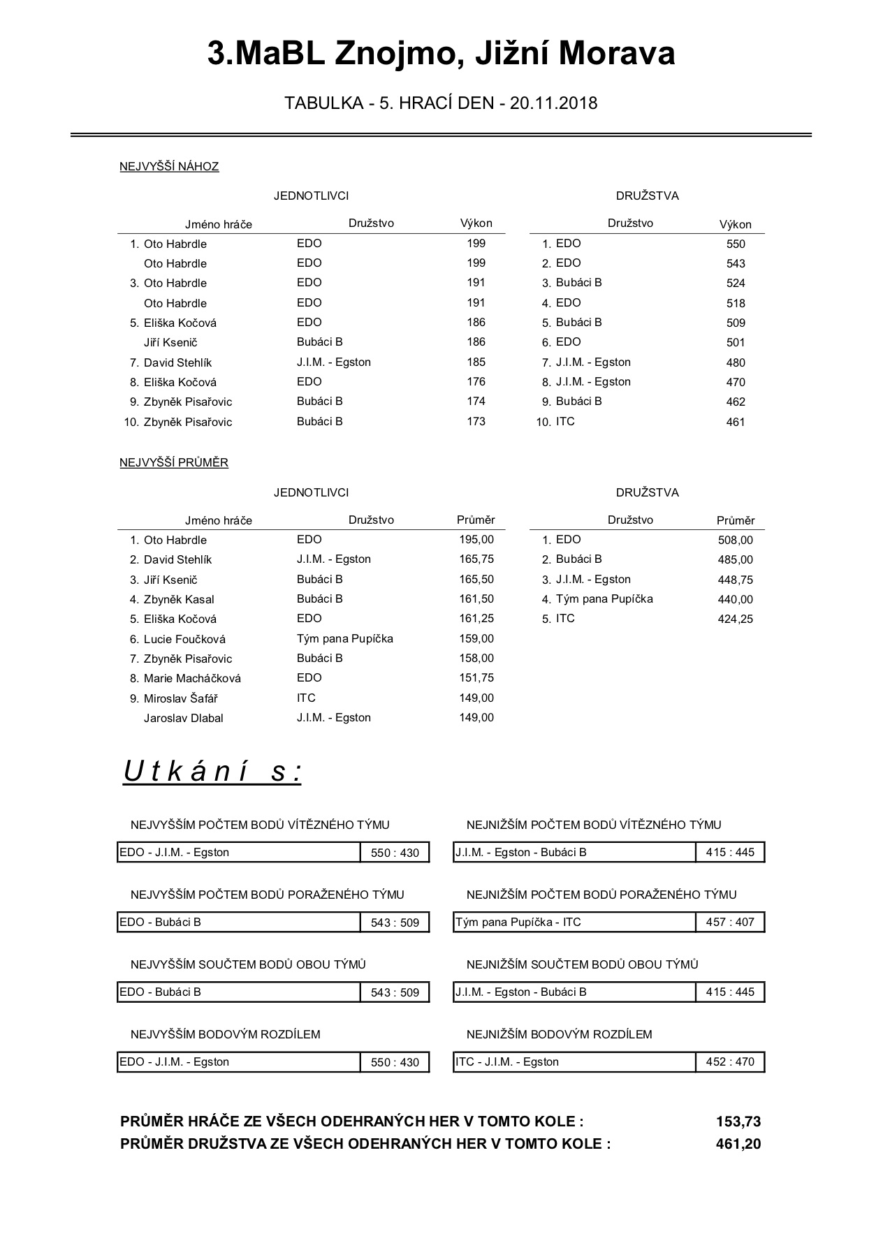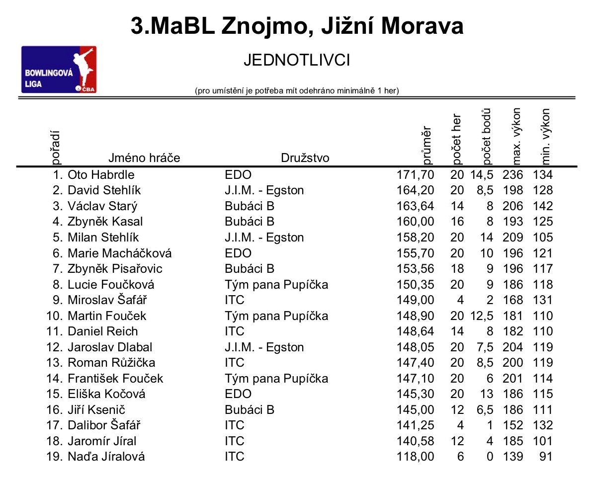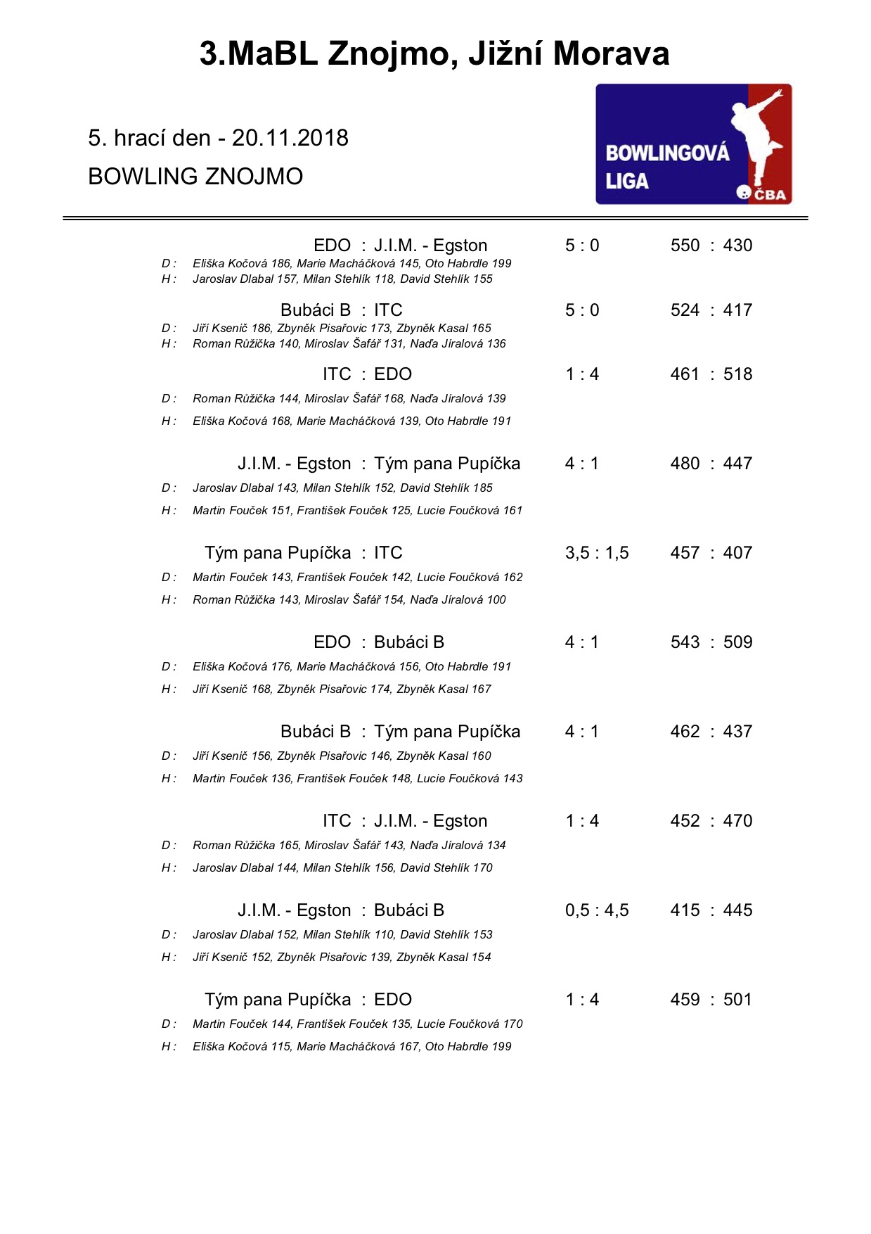 V úterý 20.listopadu odehrála družstva 3. Městské amatérské bowlingové ligy poslední kolo podzimní části ročníku 2018/2019. Jeho výsledky naleznete v článku.