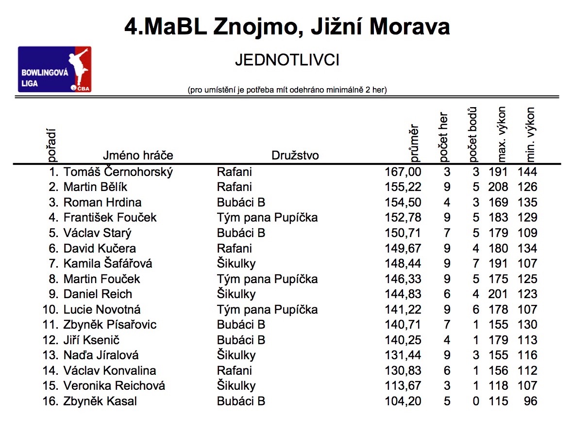 V neděli 6.11.2016 odehrála družstva 4. Městské amatérské bowlingové ligy další kolo podzimní části ročníku 2016. Výsledky naleznete jako vždy v článku.