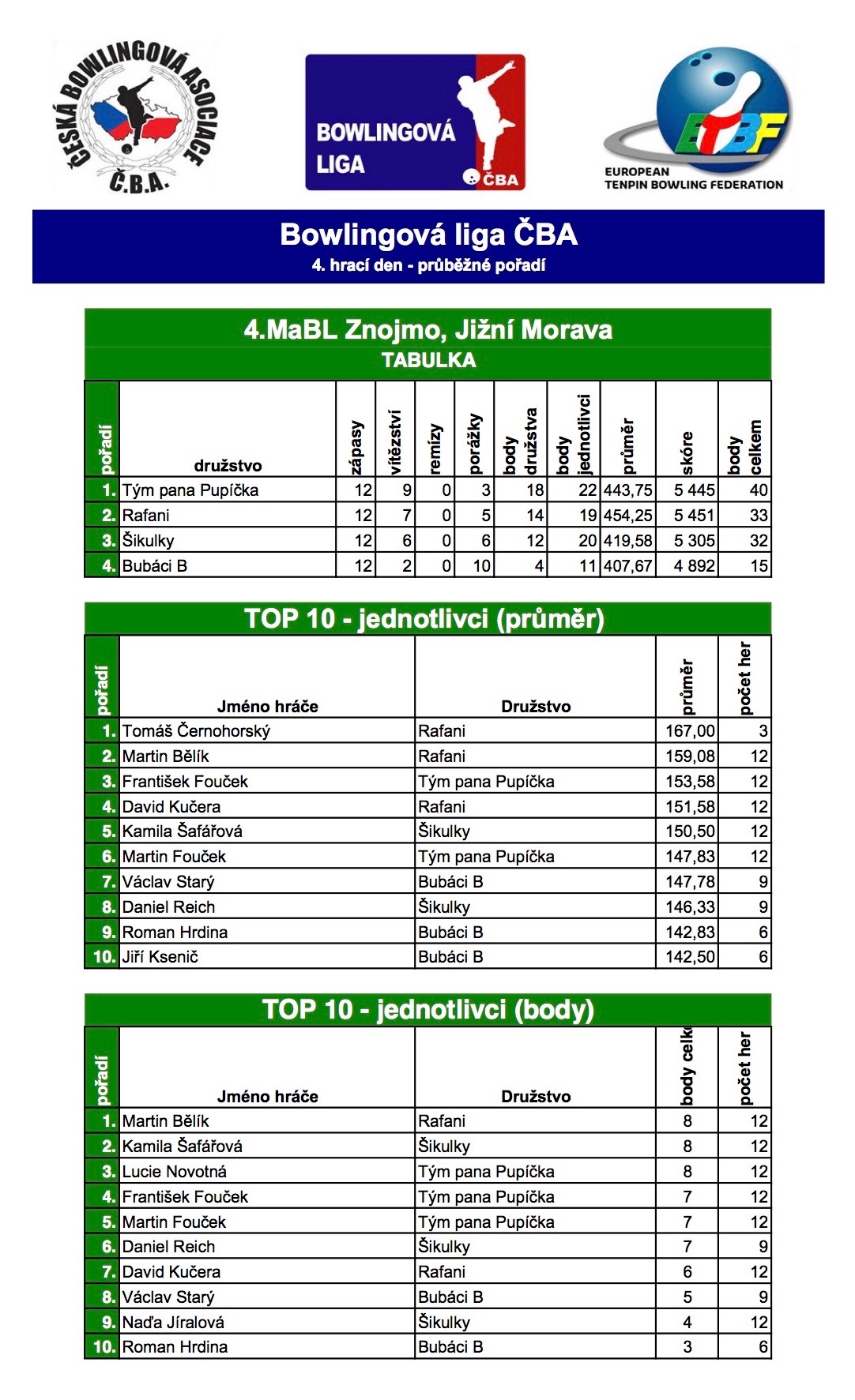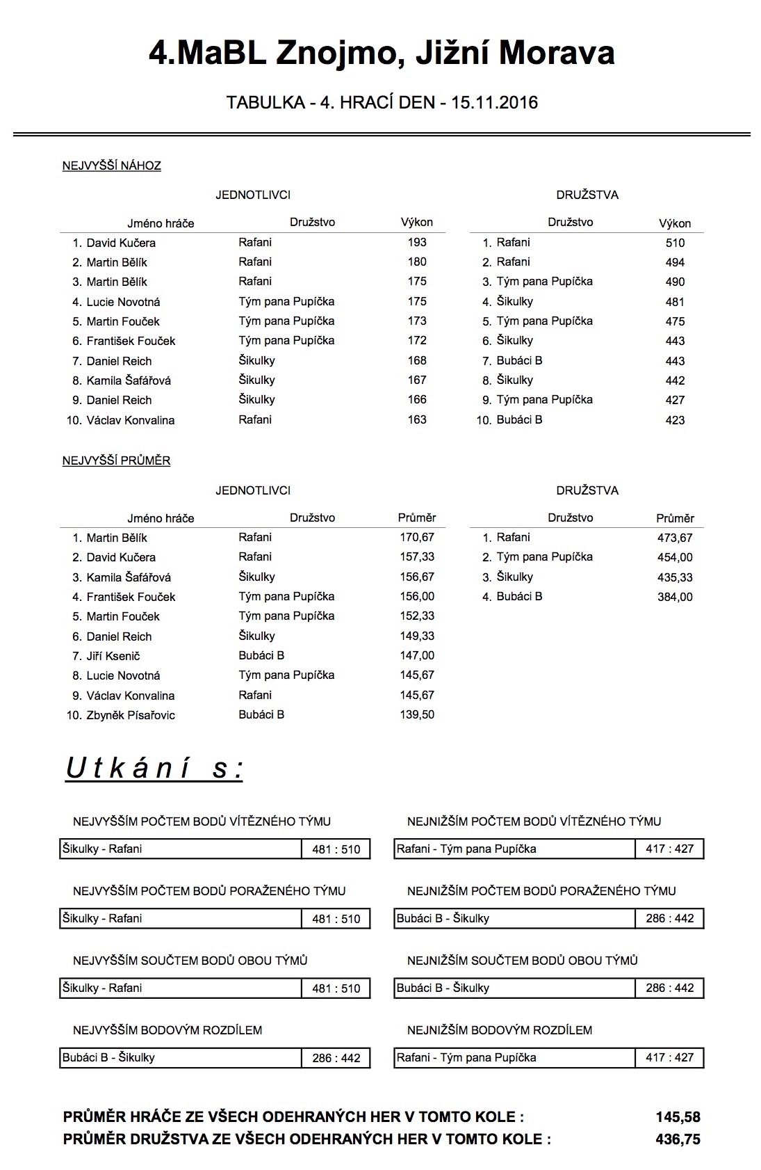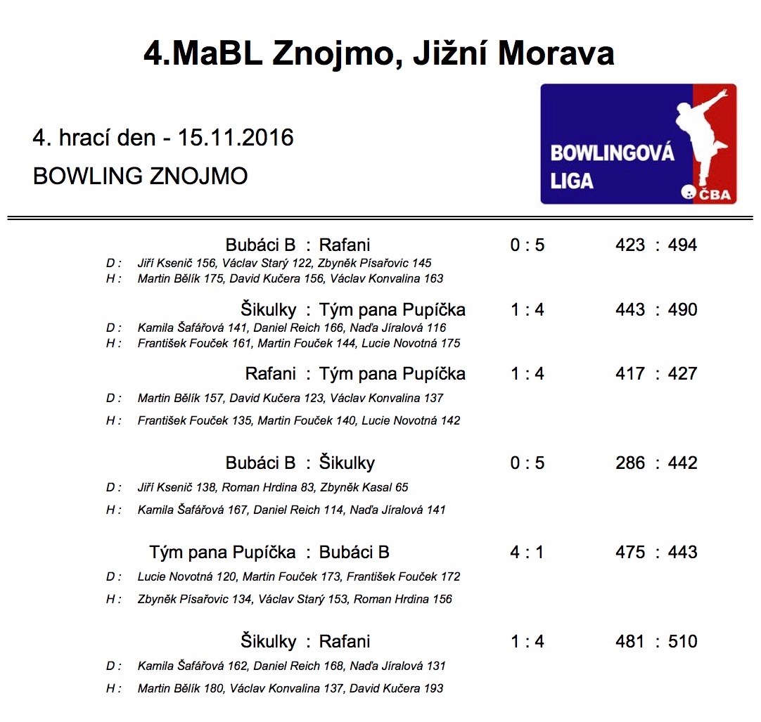 V úterý 15.11.2016 odehrála družstva 4. Městské amatérské bowlingové ligy čtvrté kolo podzimní části ročníku 2016. Výsledky naleznete jako vždy v článku.