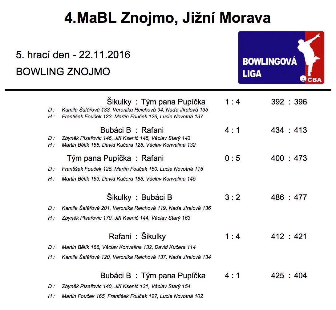 V úterý 22.11.2016 odehrála družstva 4. Městské amatérské bowlingové ligy poslední, finální kolo podzimní části ročníku 2016. Výsledky naleznete jako vždy v článku.