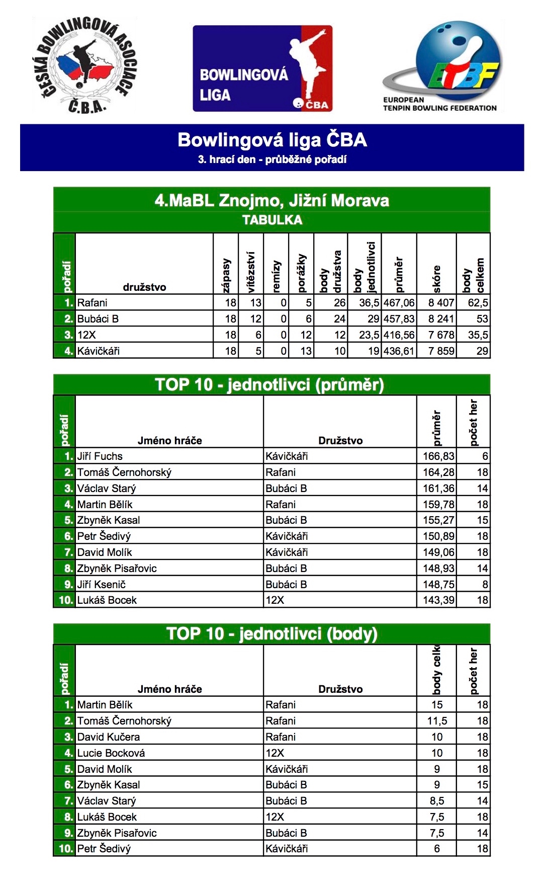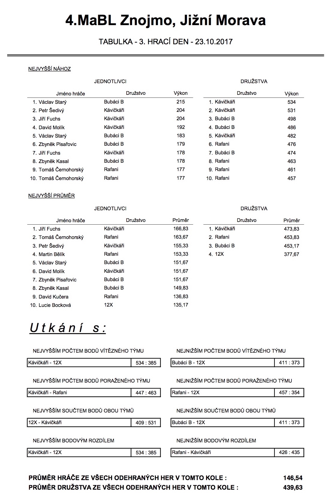 V pondělí 23.10.2017 odehrála také družstva 4. Městské amatérské bowlingové ligy další, již třetí kolo ročníku 2017/2018. Výsledky naleznete jako vždy v článku.