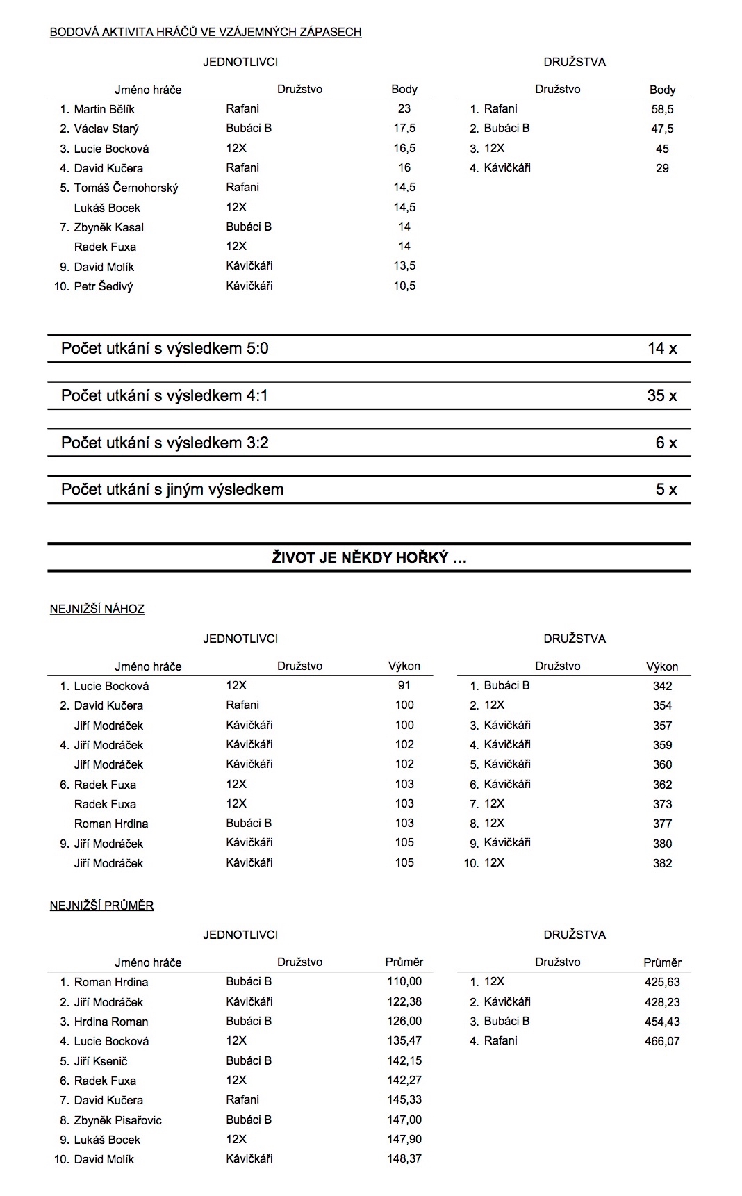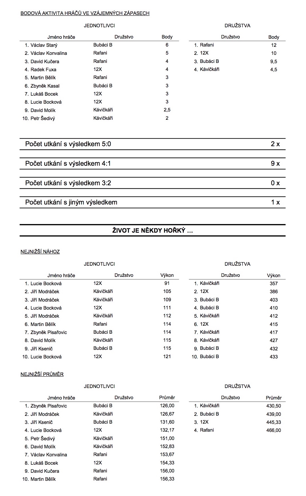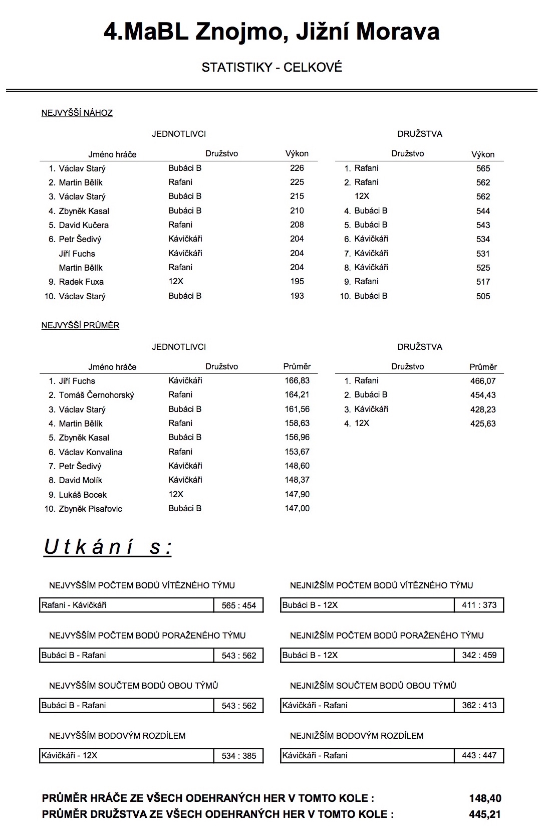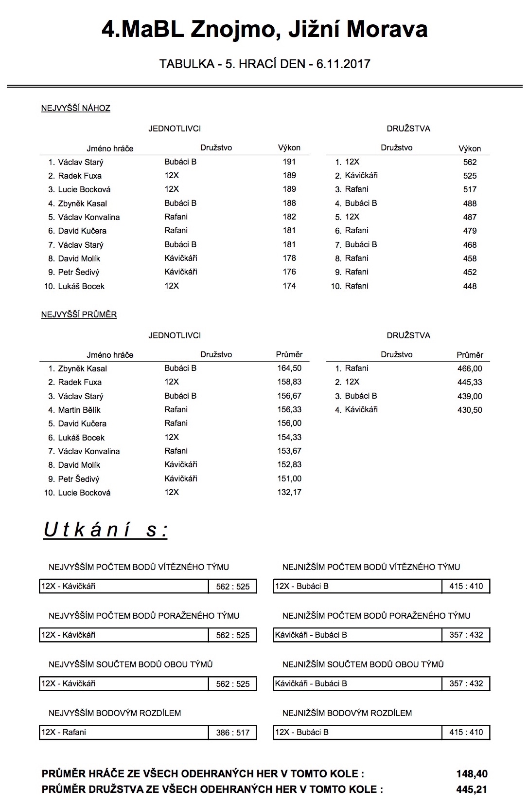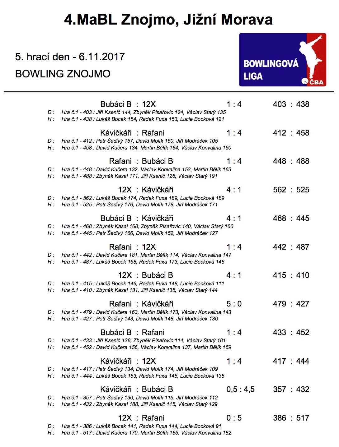 V pondělí 6.11.2017 odehrála také družstva 4. Městské amatérské bowlingové ligy již čtvrté, poslední kolo podzimní části ročníku 2017/2018. Výsledky naleznete jako vždy v článku.