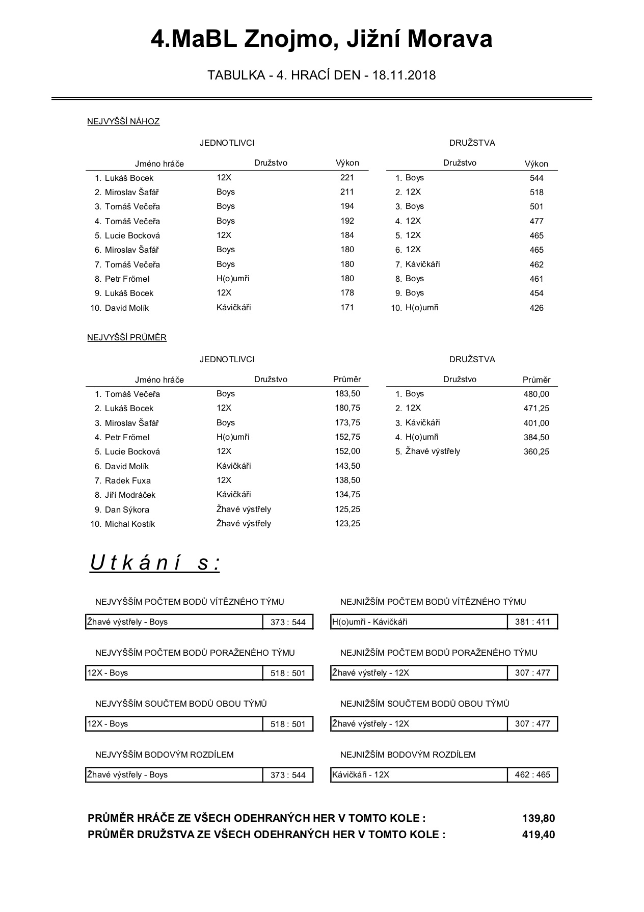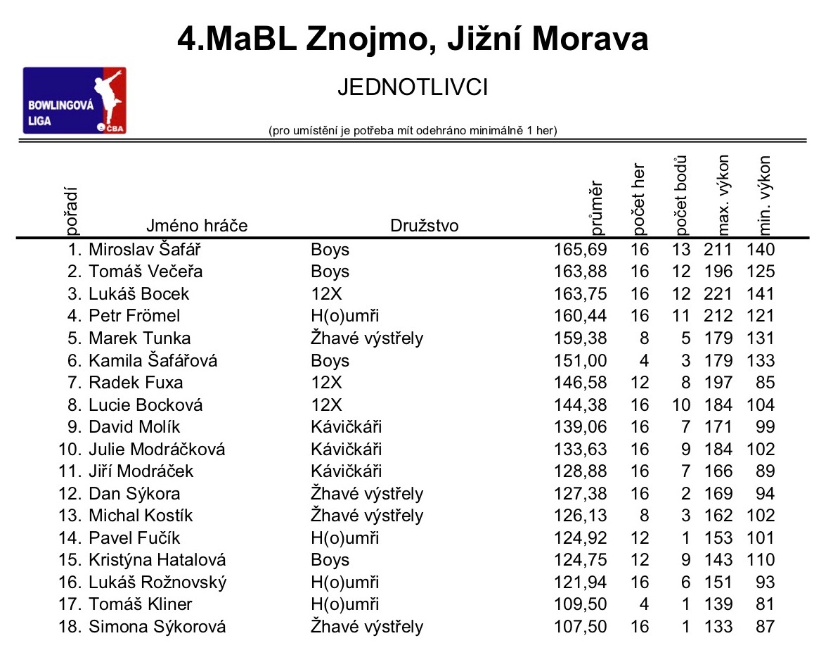 V neděli 18.listopadu odehrála družstva 4. Městské amatérské bowlingové ligy již předposlední kolo podzimní části ročníku 2018/2019. Jeho výsledky naleznete v článku.